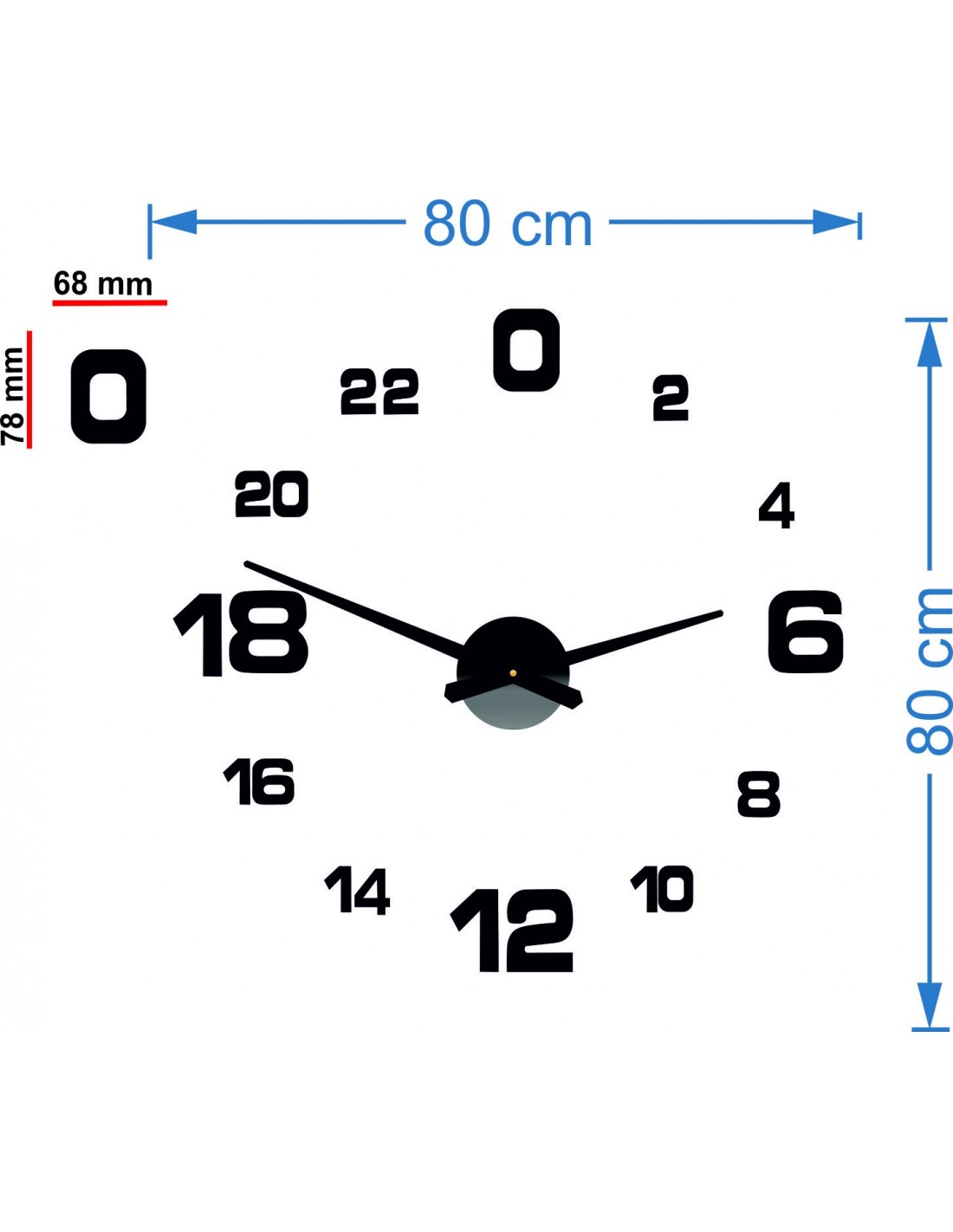 Rozmery nálepky minimálne: 800 x 800 mm možnosť zväčšovať až 1300 x 1300 mm. Rozmery hodinového strojčeka: 100 x 100 mm Dĺžka ručičiek: 30 - 40 cm.
