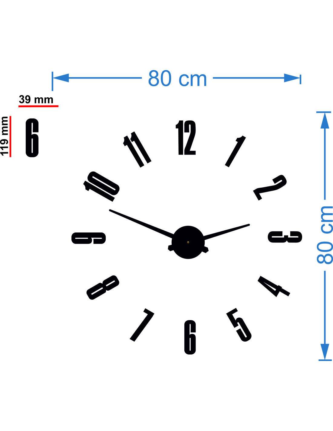 Rozmery nálepky: 800 x 800 mm možnosť zväčšovať až 1300 x 1300 mm. Rozmery hodinového strojčeka: 100 x 100 mm Dĺžka ručičiek: 30 - 40 cm.