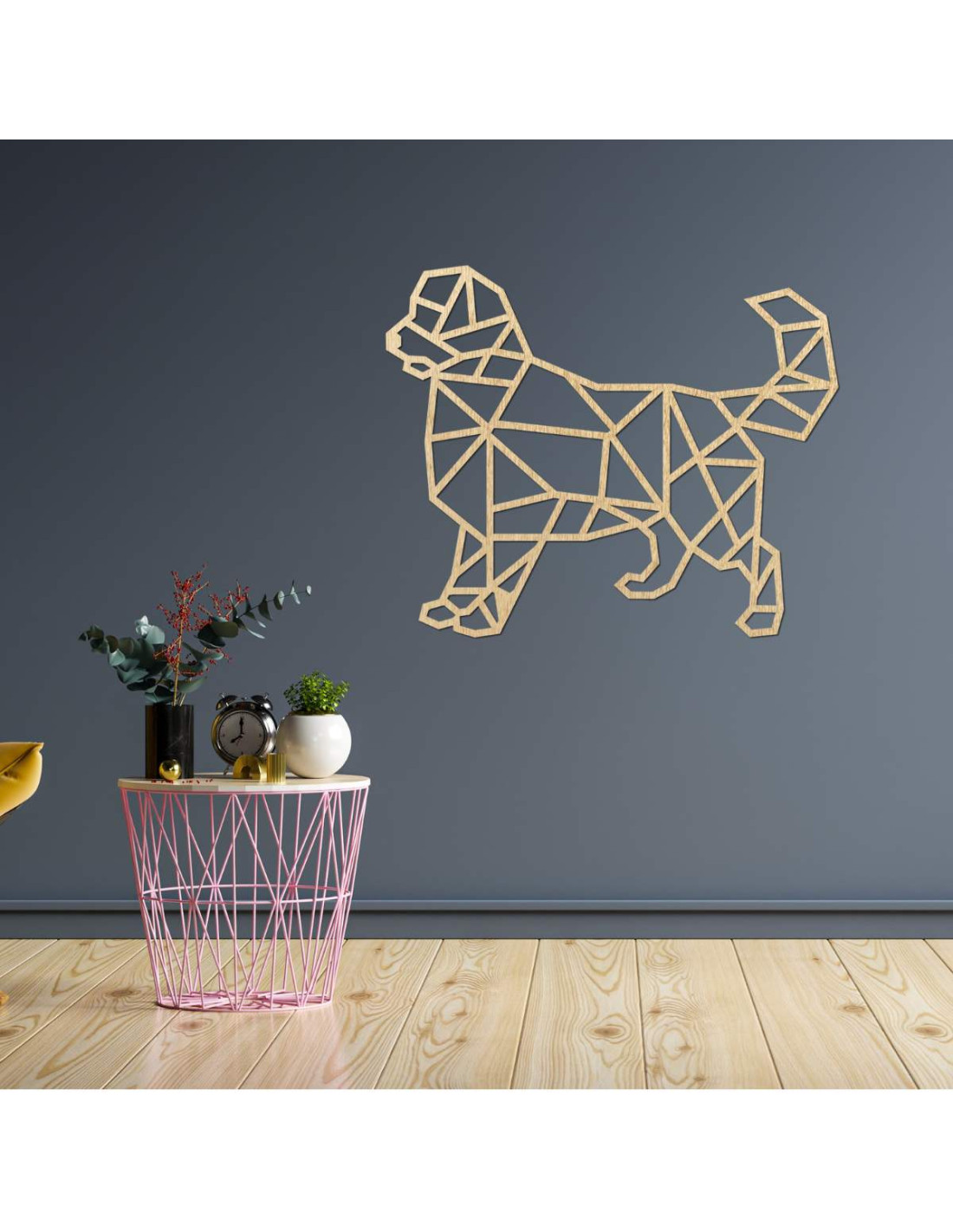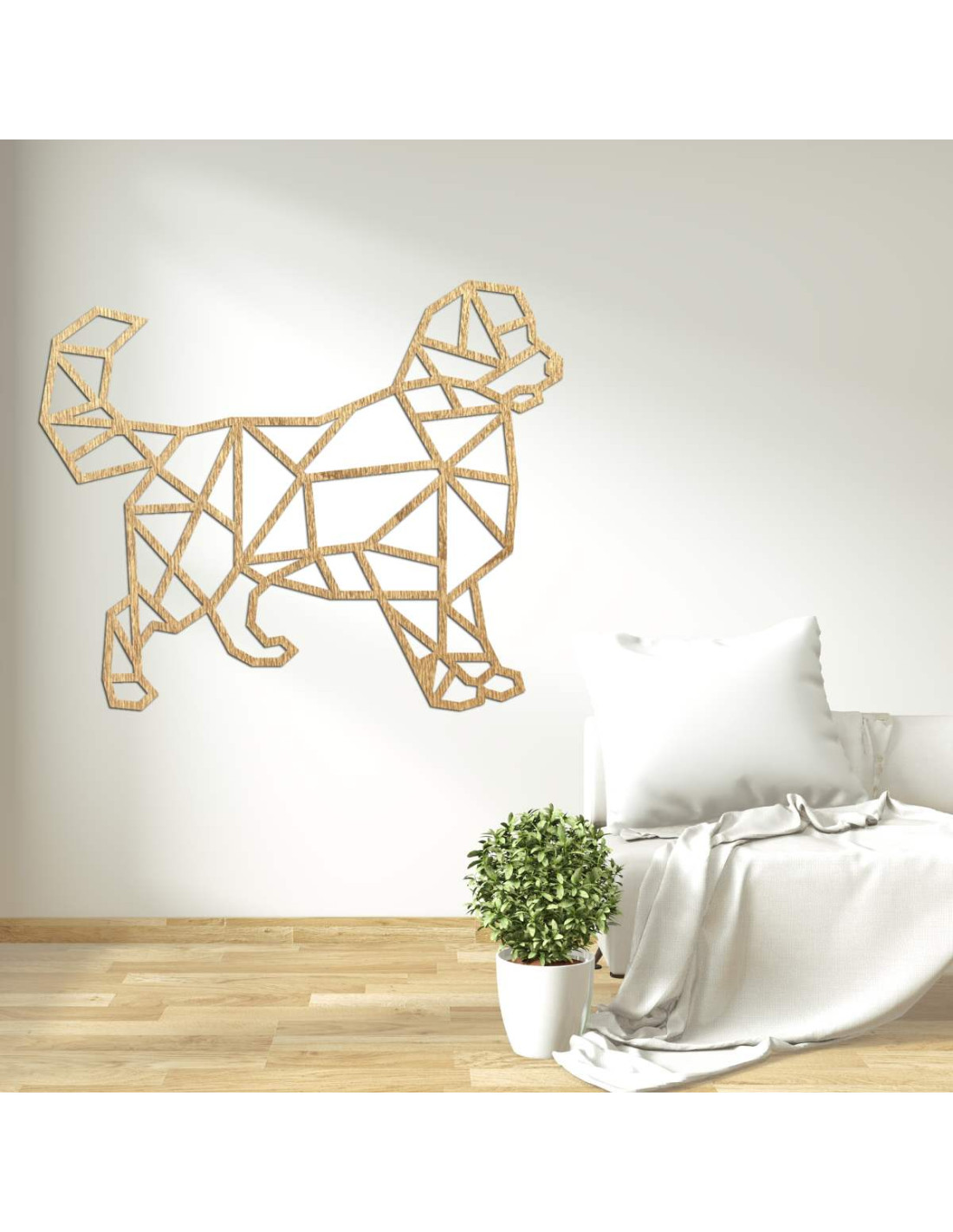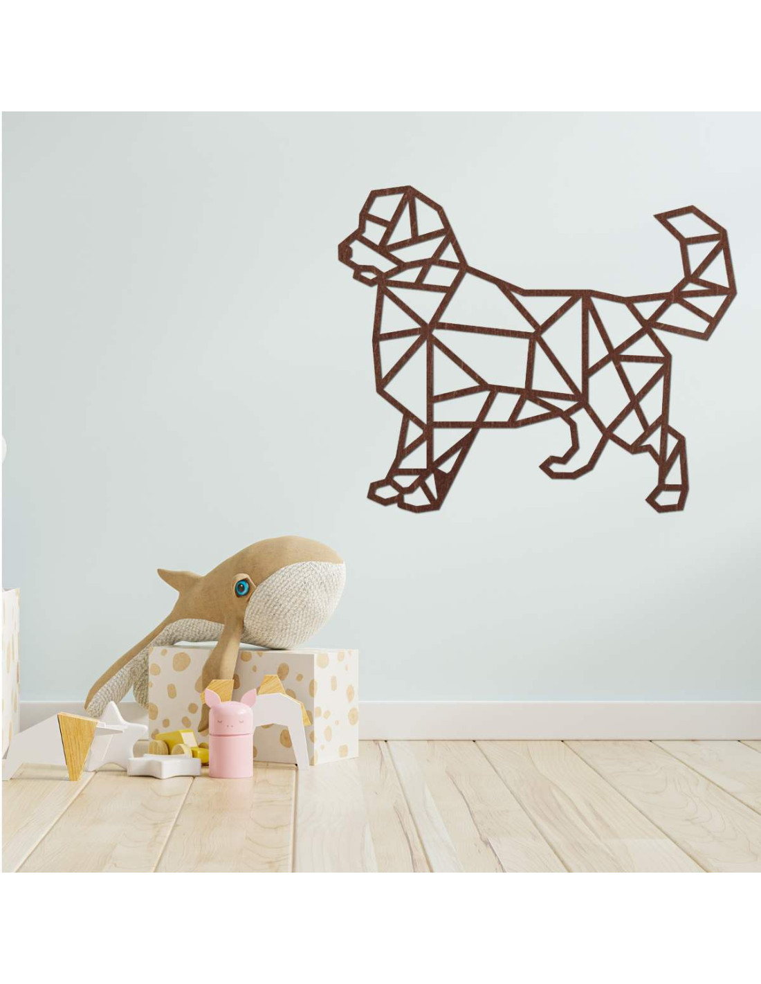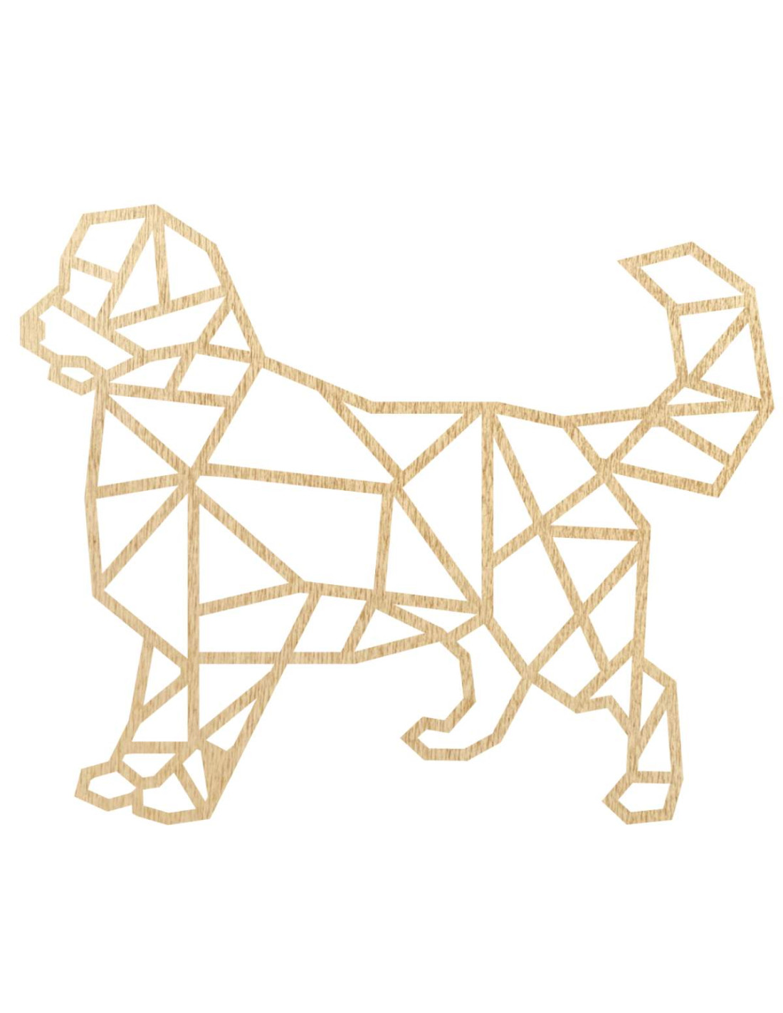 Oživte svoj interiér modernou drevenou dekoráciou s motívom psa v geometrickom štýle.