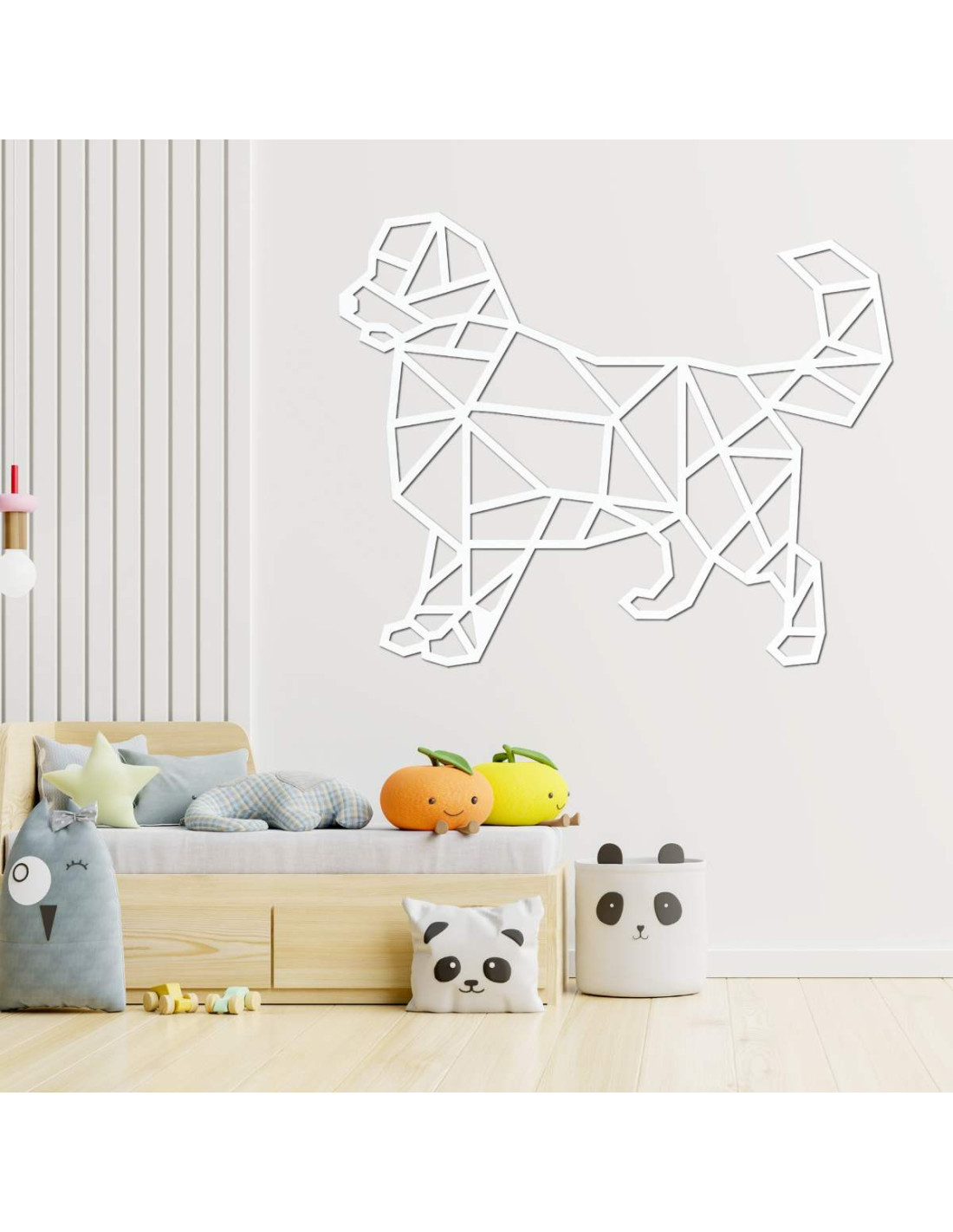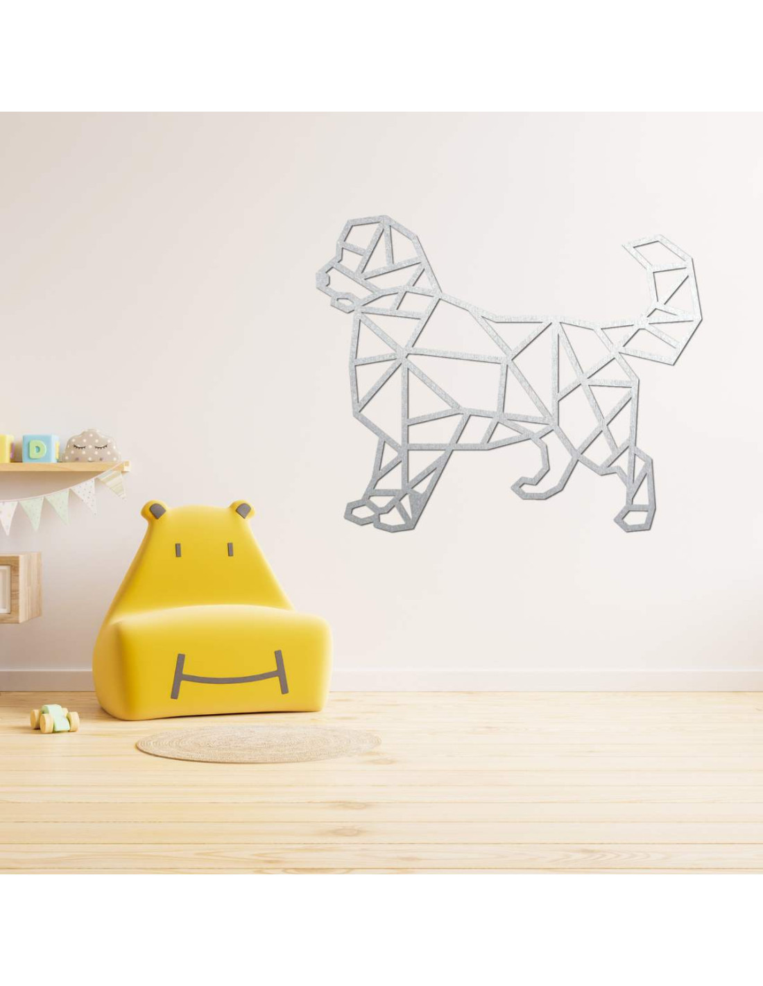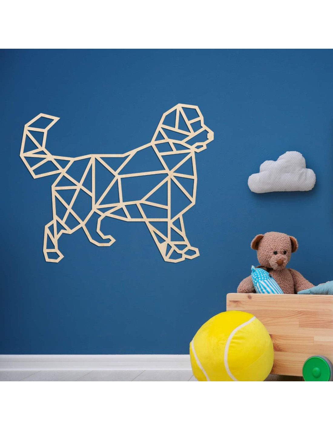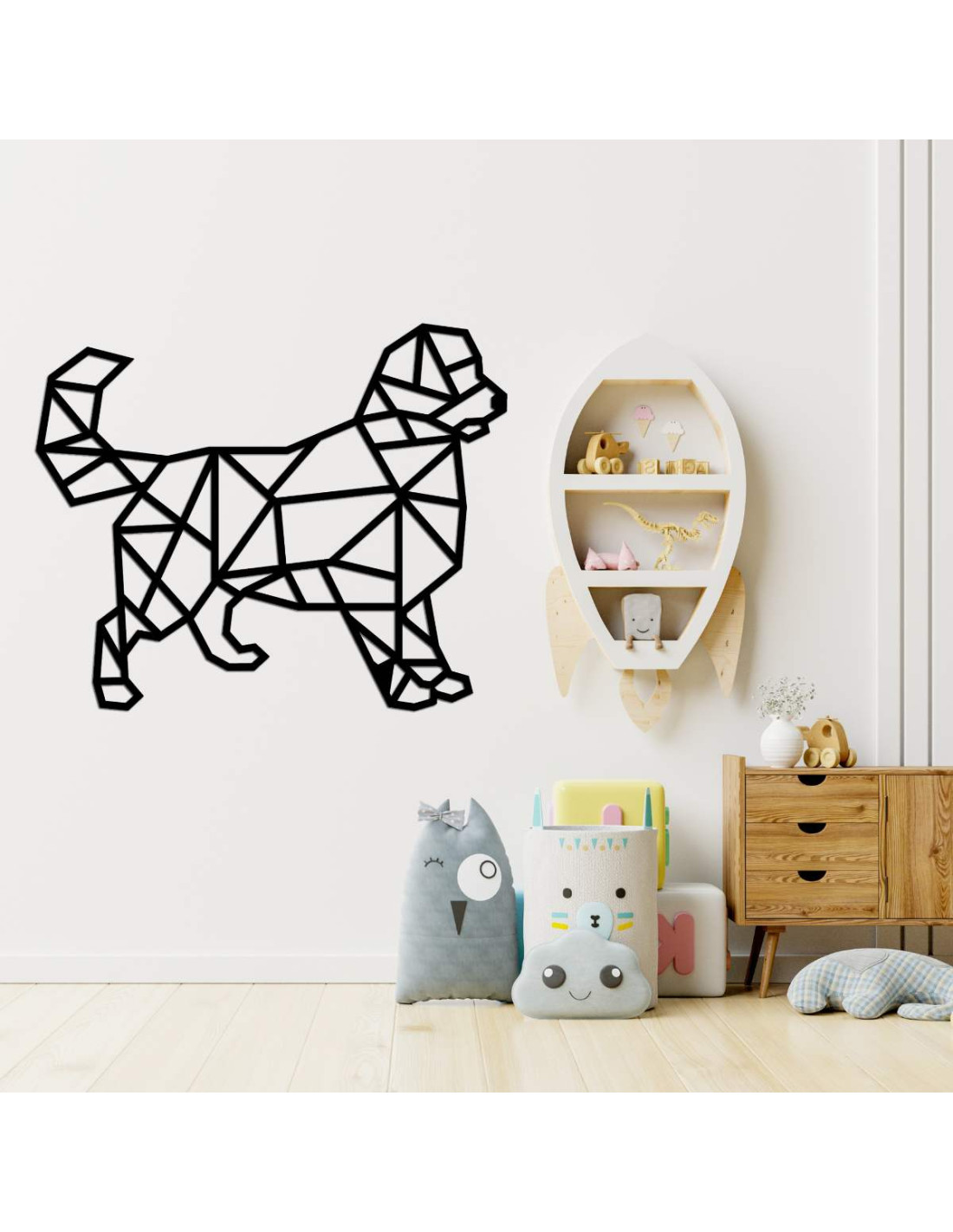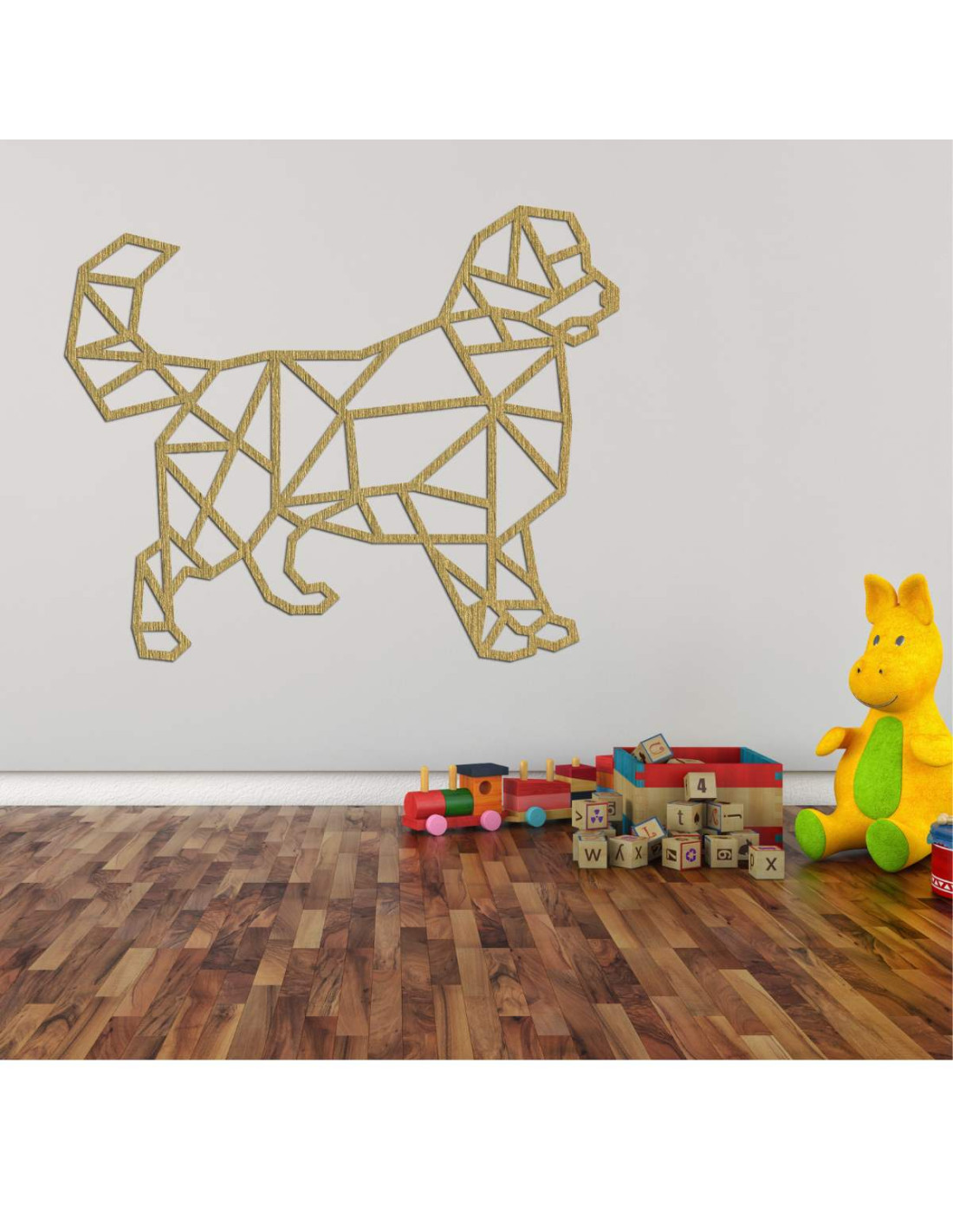 Oživte svoj interiér modernou drevenou dekoráciou s motívom psa v geometrickom štýle.