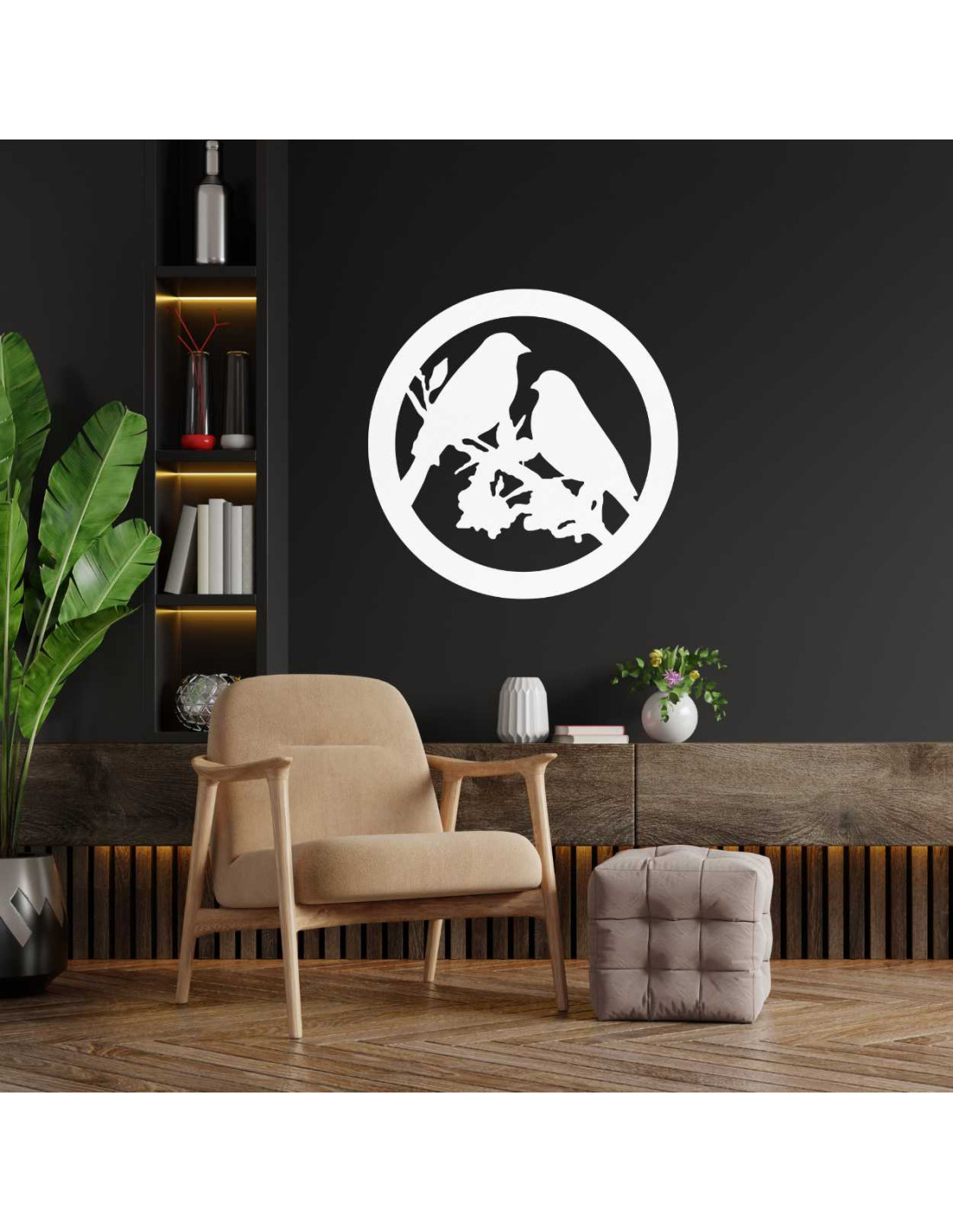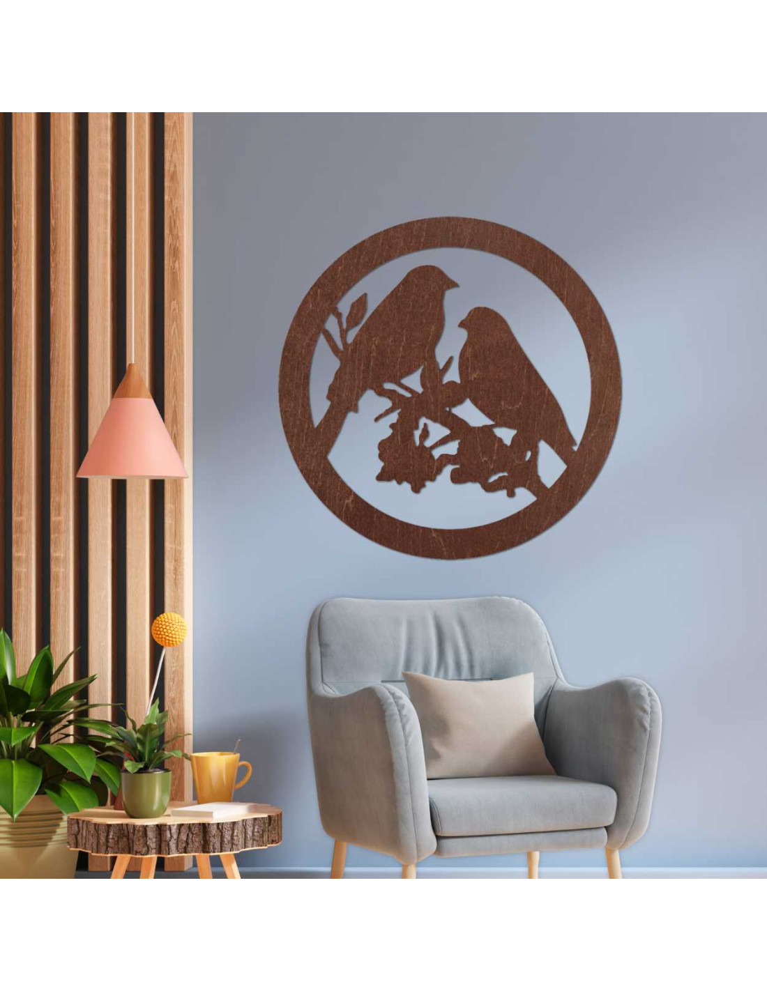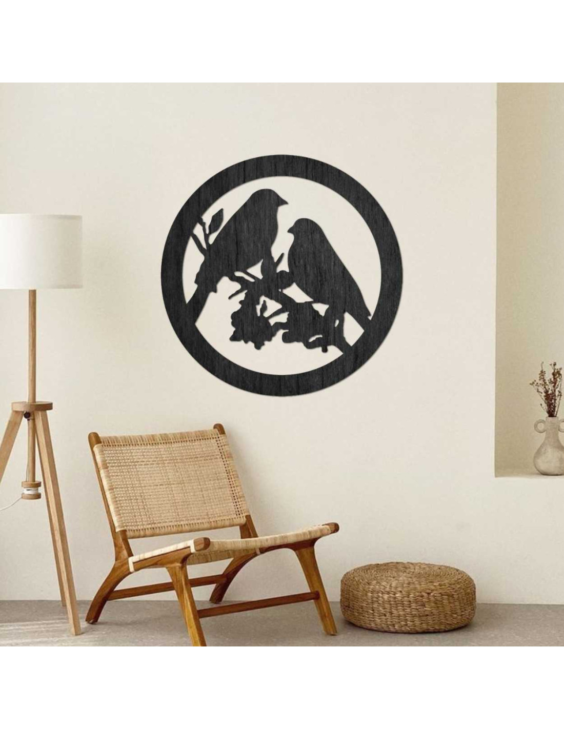 Drevený nástenná dekorácia so siluetou vtákov, kruhovým rámom a prírodným motívom prinesie do interiéru pokoj a harmóniu.