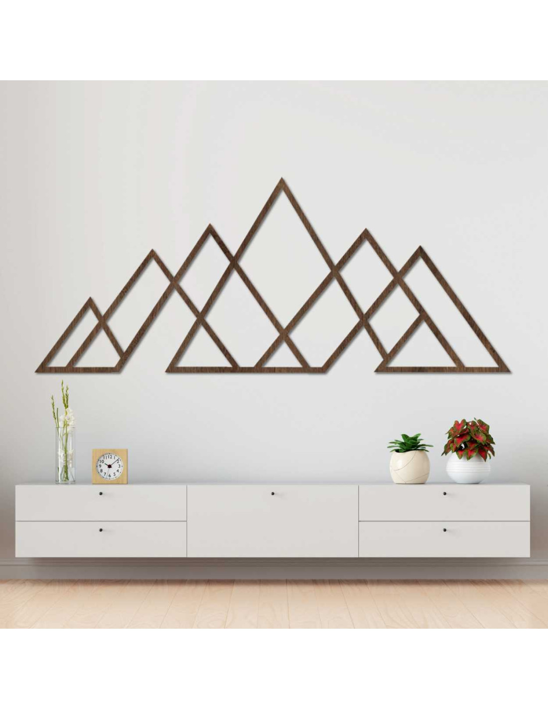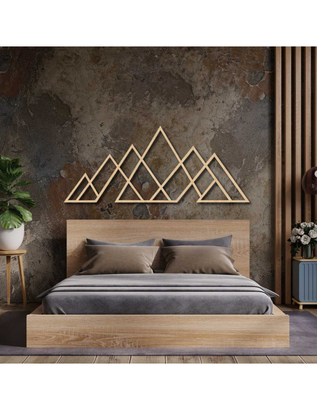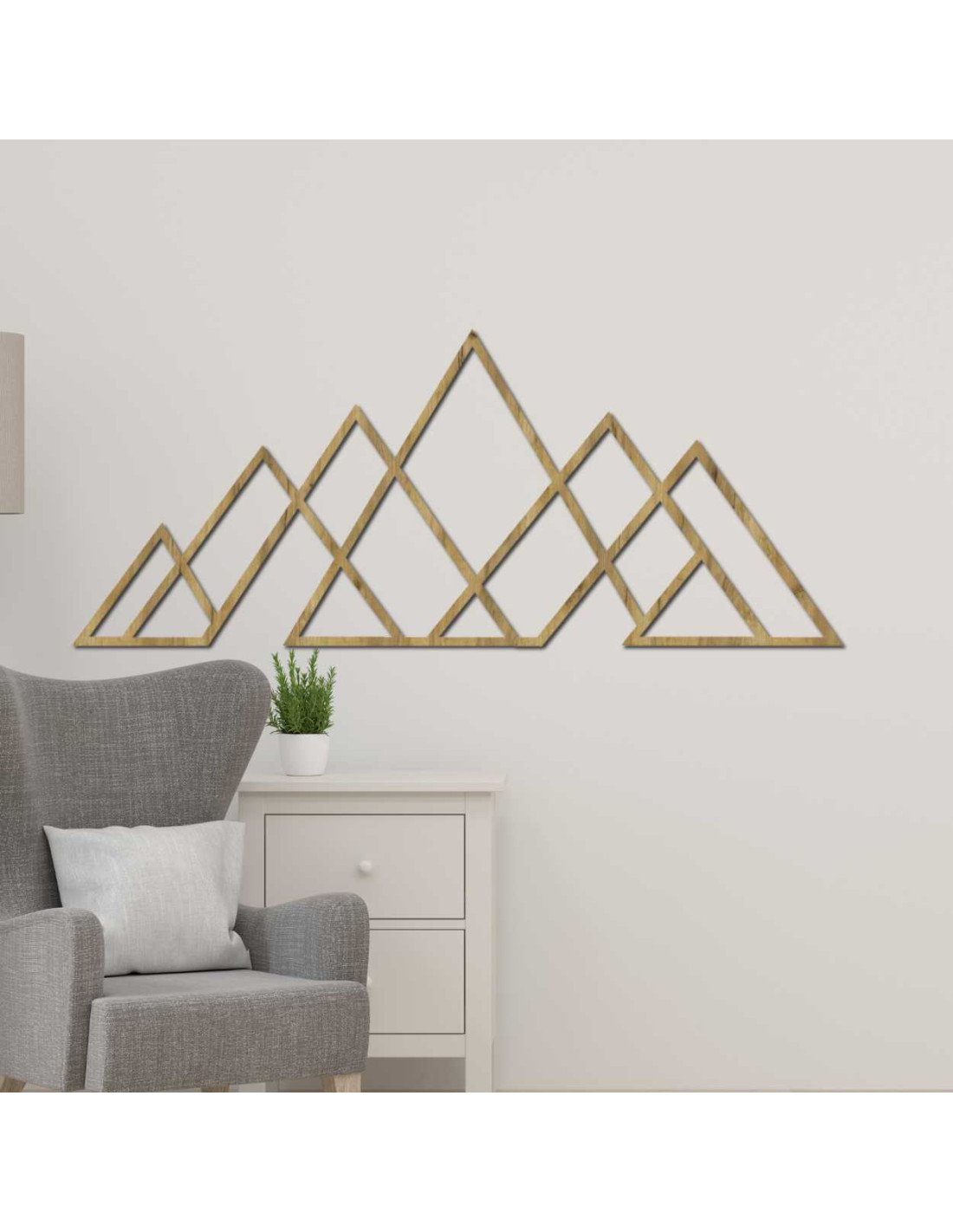 Minimalistický horský obraz z dreva – geometrická dekorácia s prírodným motívom do moderného interiéru.