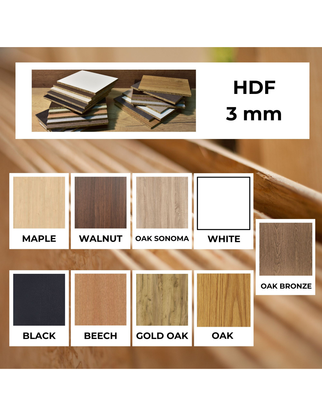 - HDF (Drevovláknitá doska s vysokou hustotou)