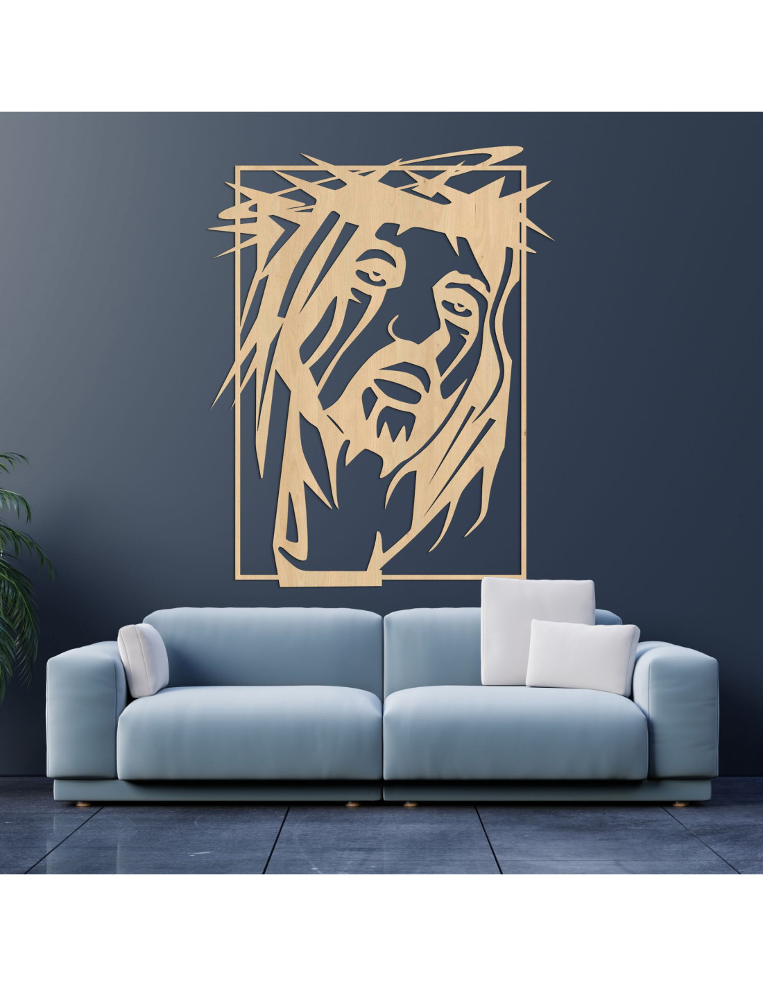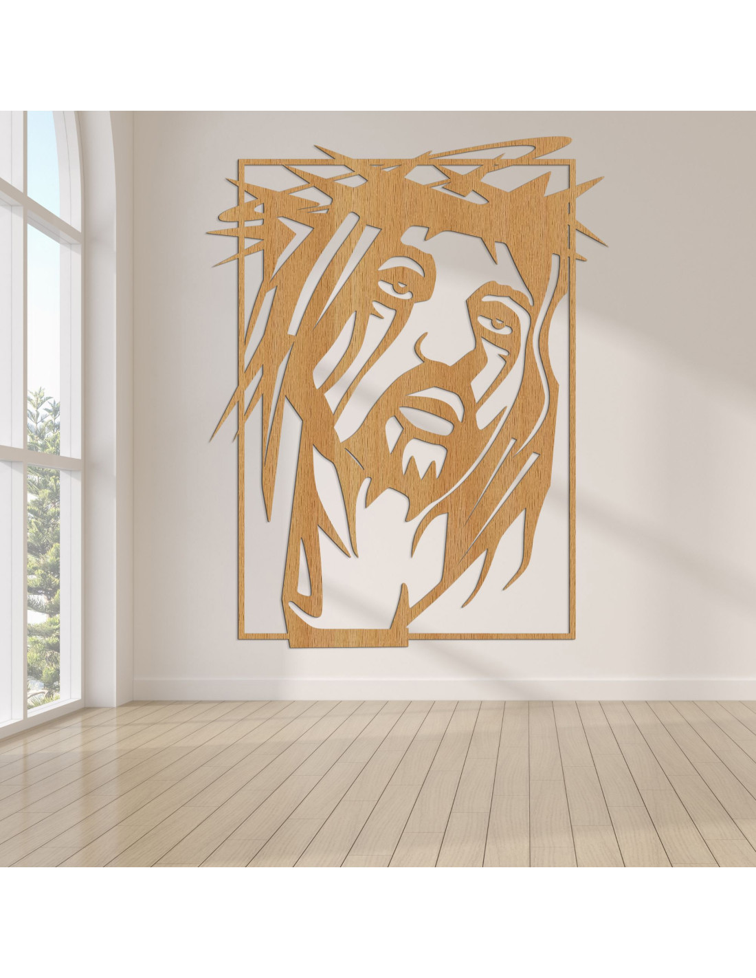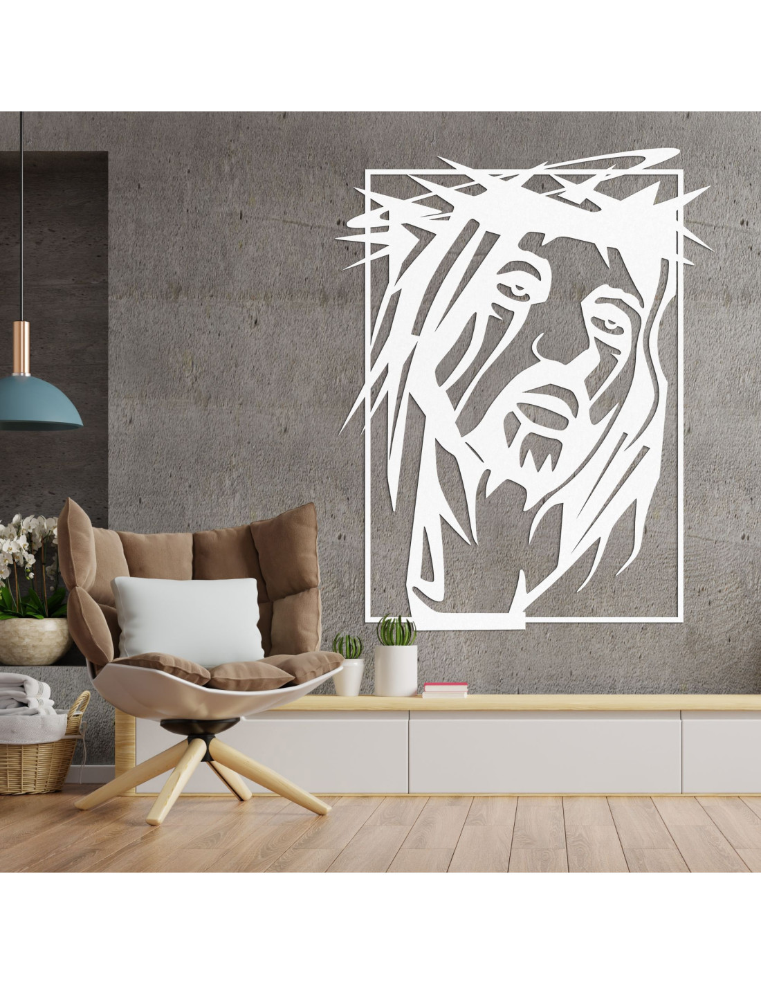 Výrazný obraz so silnou duchovnou symbolikou prináša do priestoru pokoj, vieru a tichú silu. Tvár Ježiša Krista je zachytená s hlbokým emocionálnym výrazom, ktorý osloví každého pozorovateľa. Precízne spracovanie a súhra tvarov vytvárajú vizuálne silný moment zastavenia. Dizajn spája umeleckú jednoduchosť s náboženskou výpoveďou.