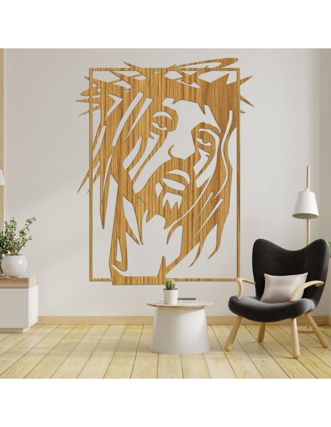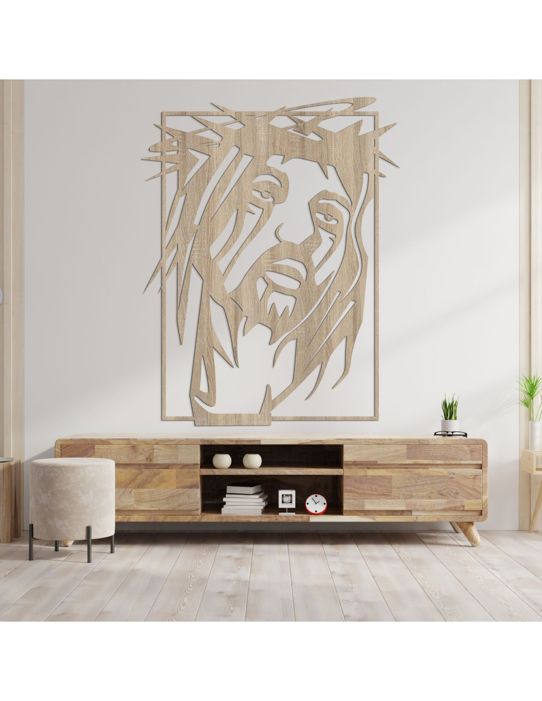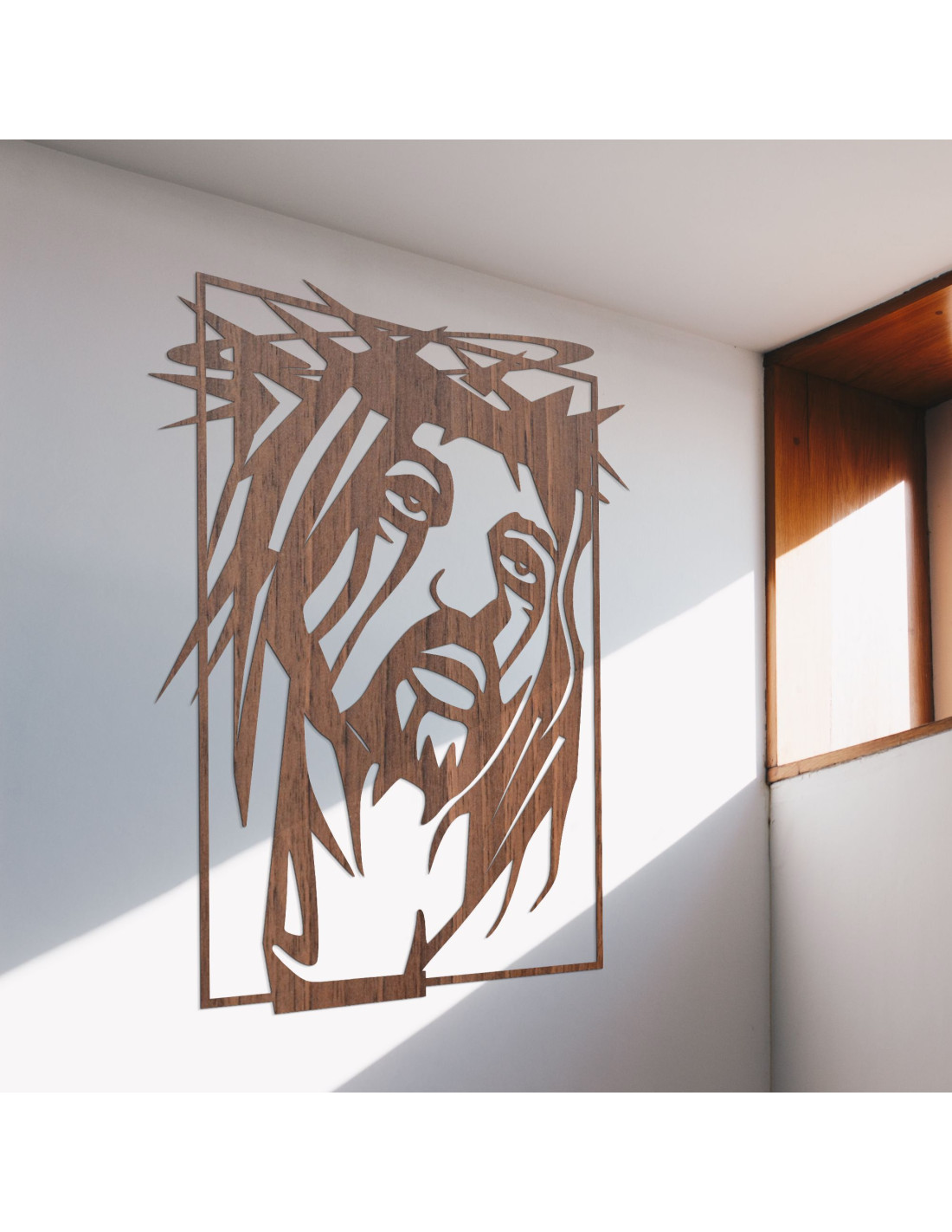 Výrazný obraz so silnou duchovnou symbolikou prináša do priestoru pokoj, vieru a tichú silu. Tvár Ježiša Krista je zachytená s hlbokým emocionálnym výrazom, ktorý osloví každého pozorovateľa. Precízne spracovanie a súhra tvarov vytvárajú vizuálne silný moment zastavenia. Dizajn spája umeleckú jednoduchosť s náboženskou výpoveďou.