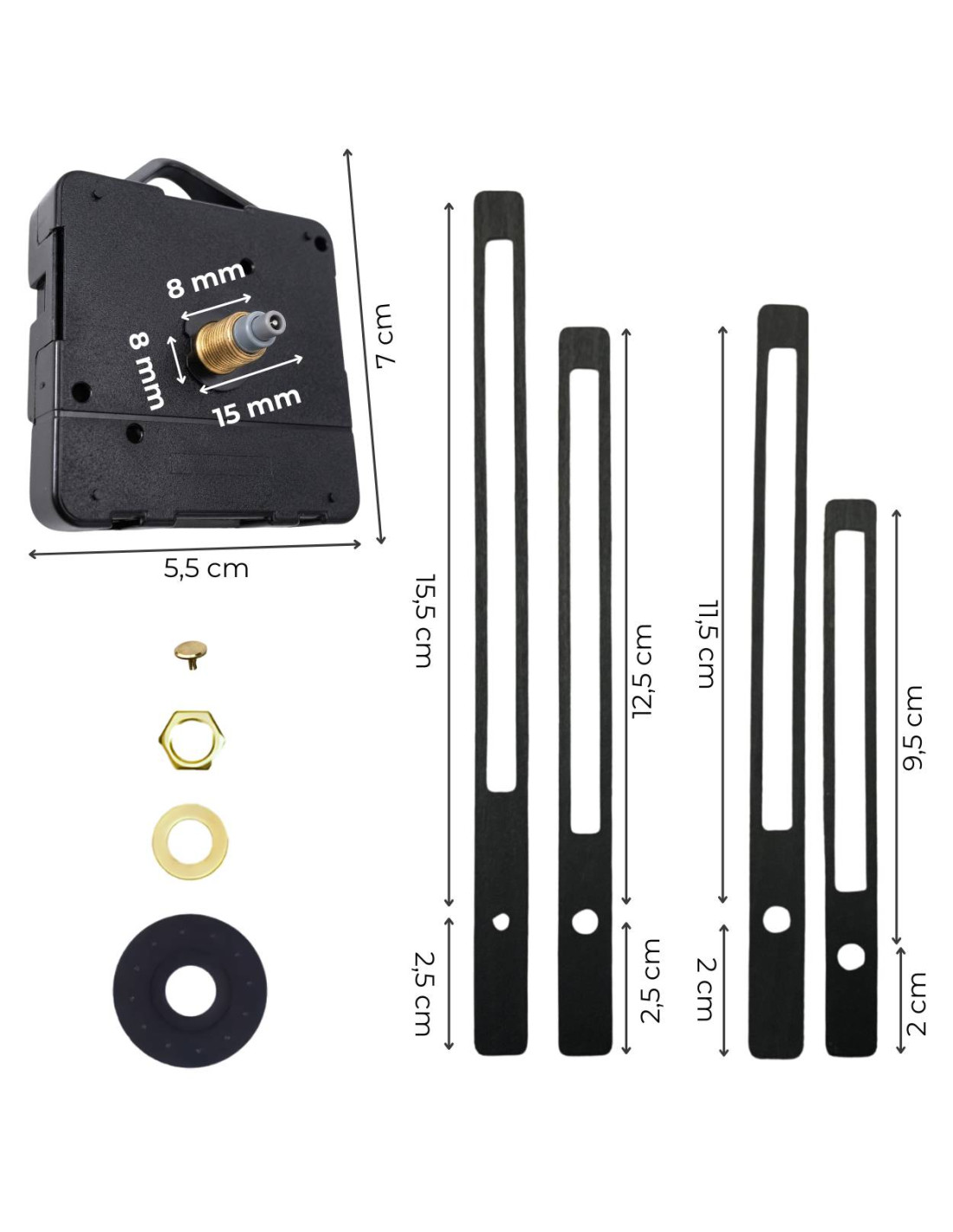 Sada obsahuje: QUARTZ tichý strojček, 2x ručičky, gumová podložka, kovová podložka, stredová matica, zaslepovacia matica