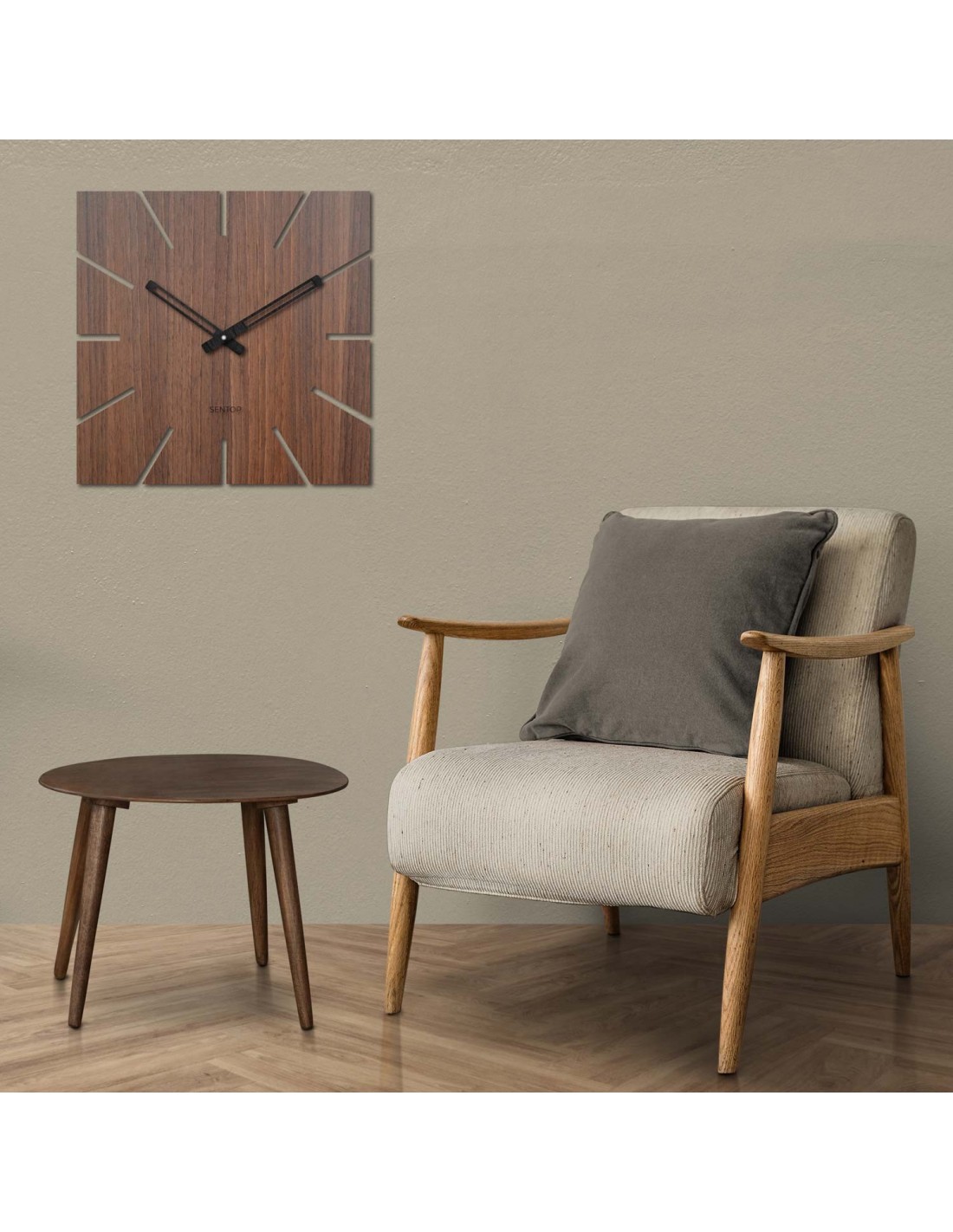 - Moderný a elegantný dizajn – prírodný vzhľad HDF dosky a minimalistické výrezy namiesto čísiel v kombinácii s čiernymi kovovými ručičkami tvoria nadčasový doplnok, ktorý vynikne v modernom aj klasickom priestore.