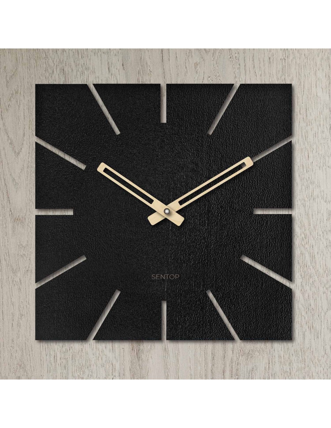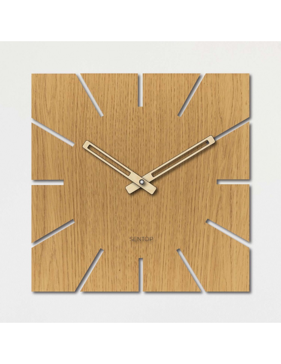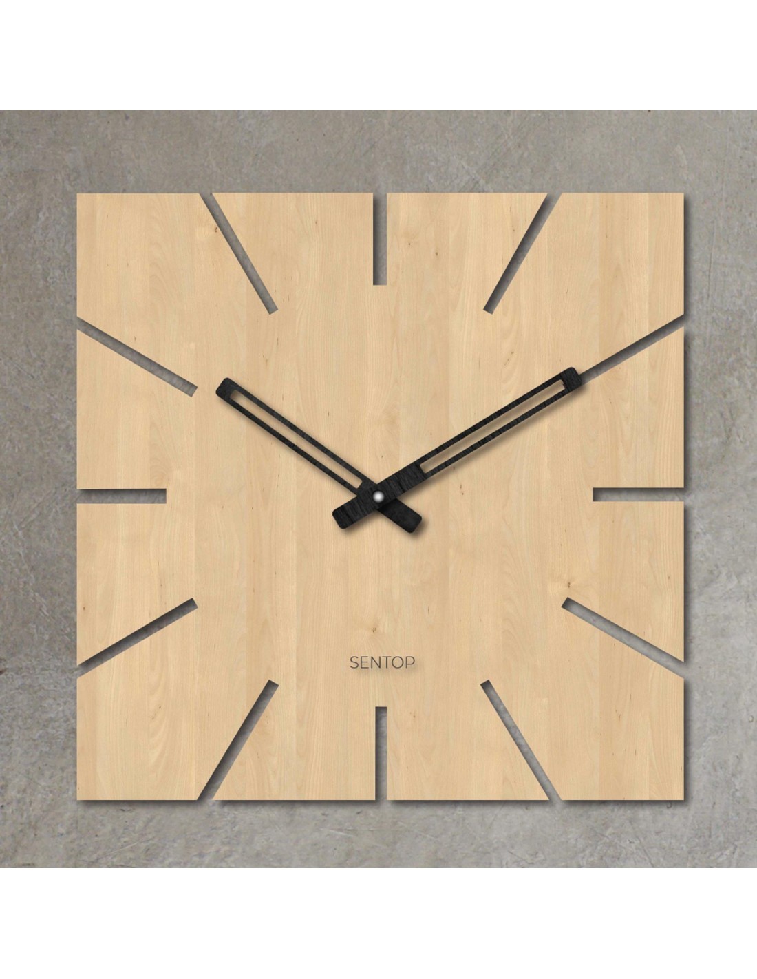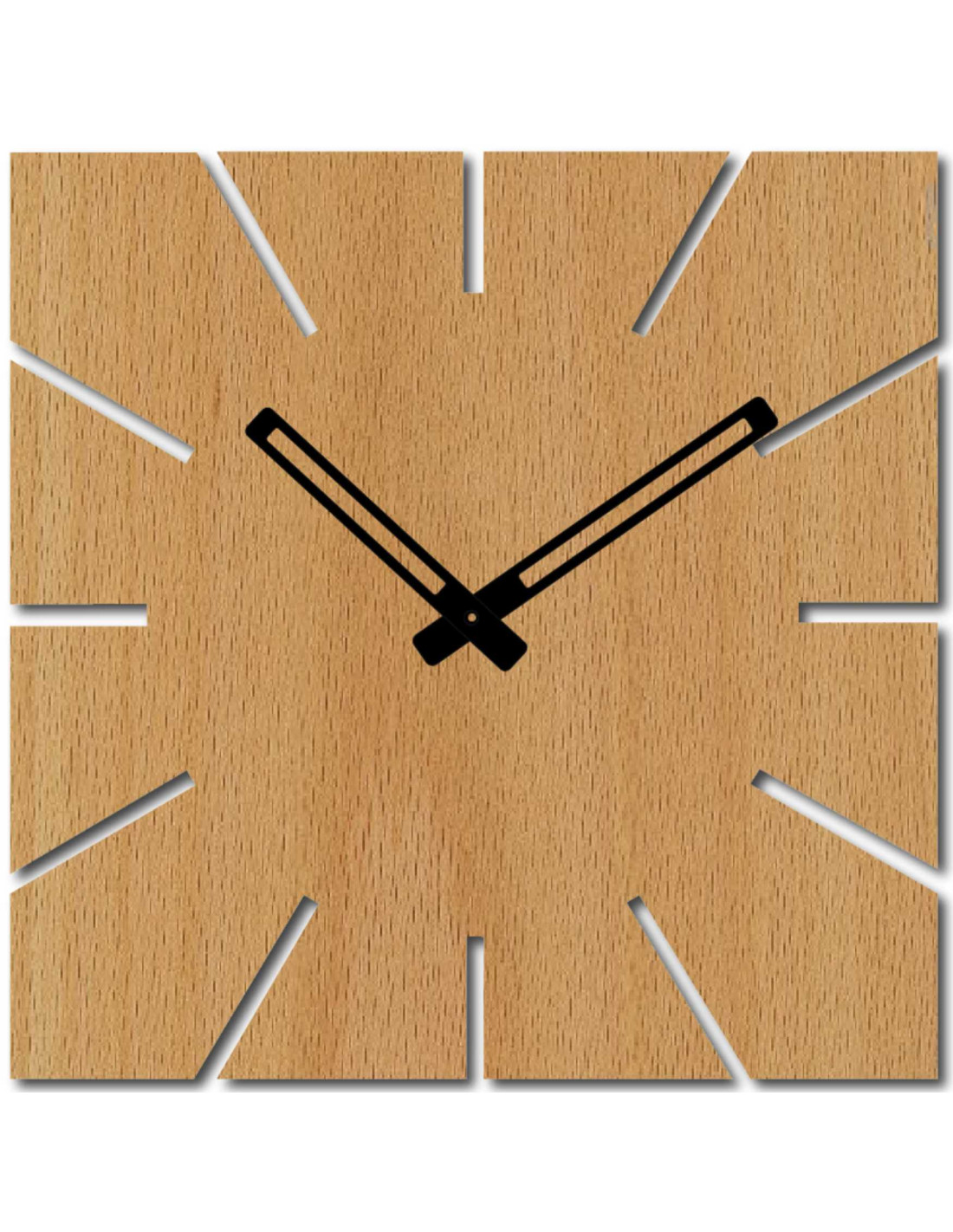 Štvorcový formát s precízne vyfrézovanými výrezmi namiesto čísiel a výrazné čierne ručičky vytvárajú moderný, no zároveň nadčasový akcent, ktorý prirodzene zapadne do každého priestoru.