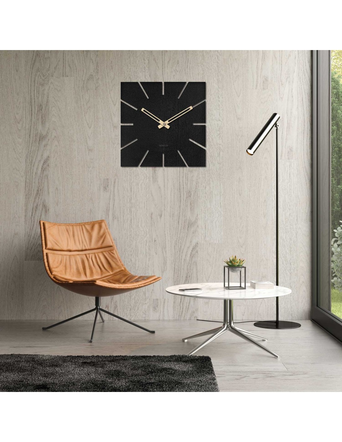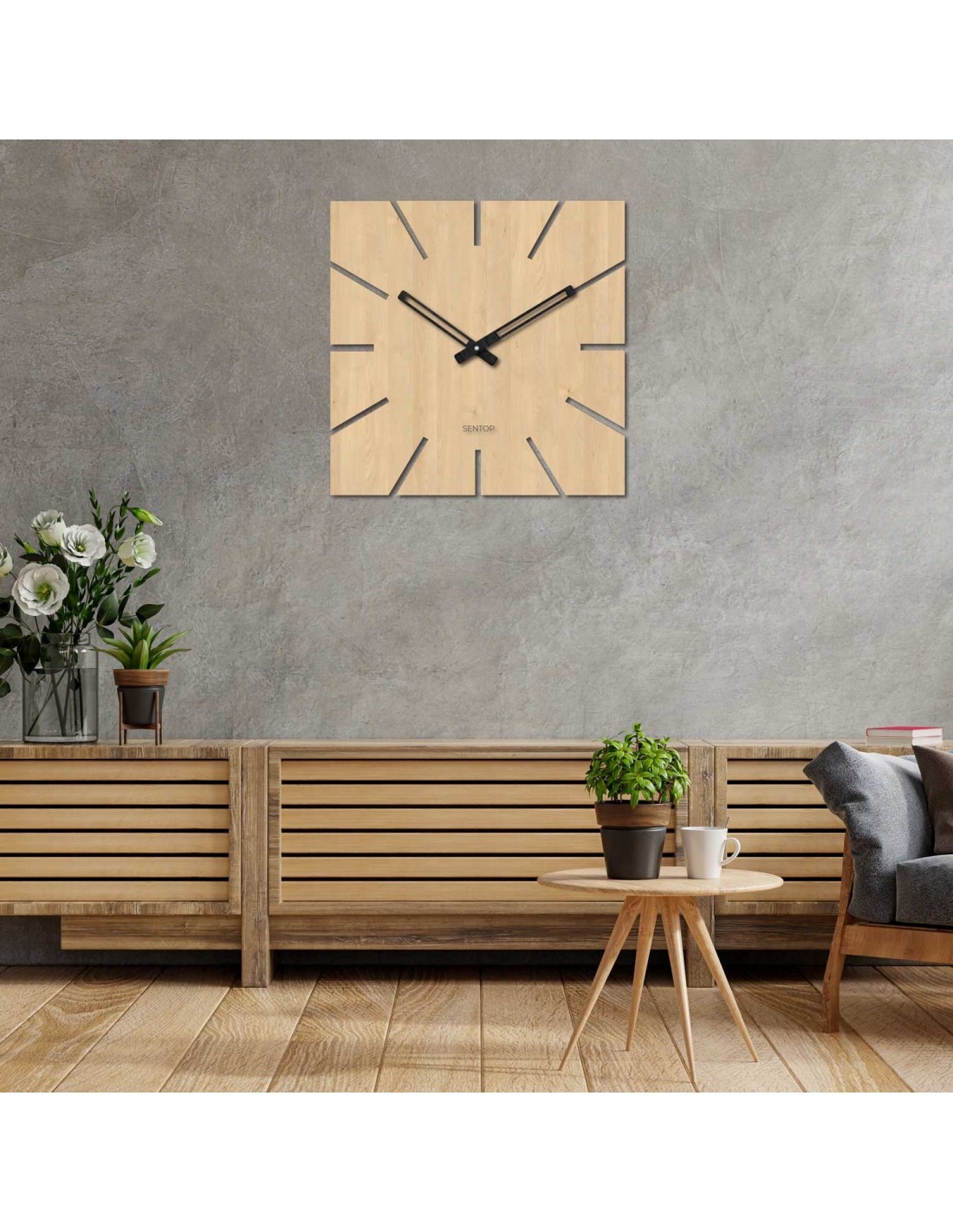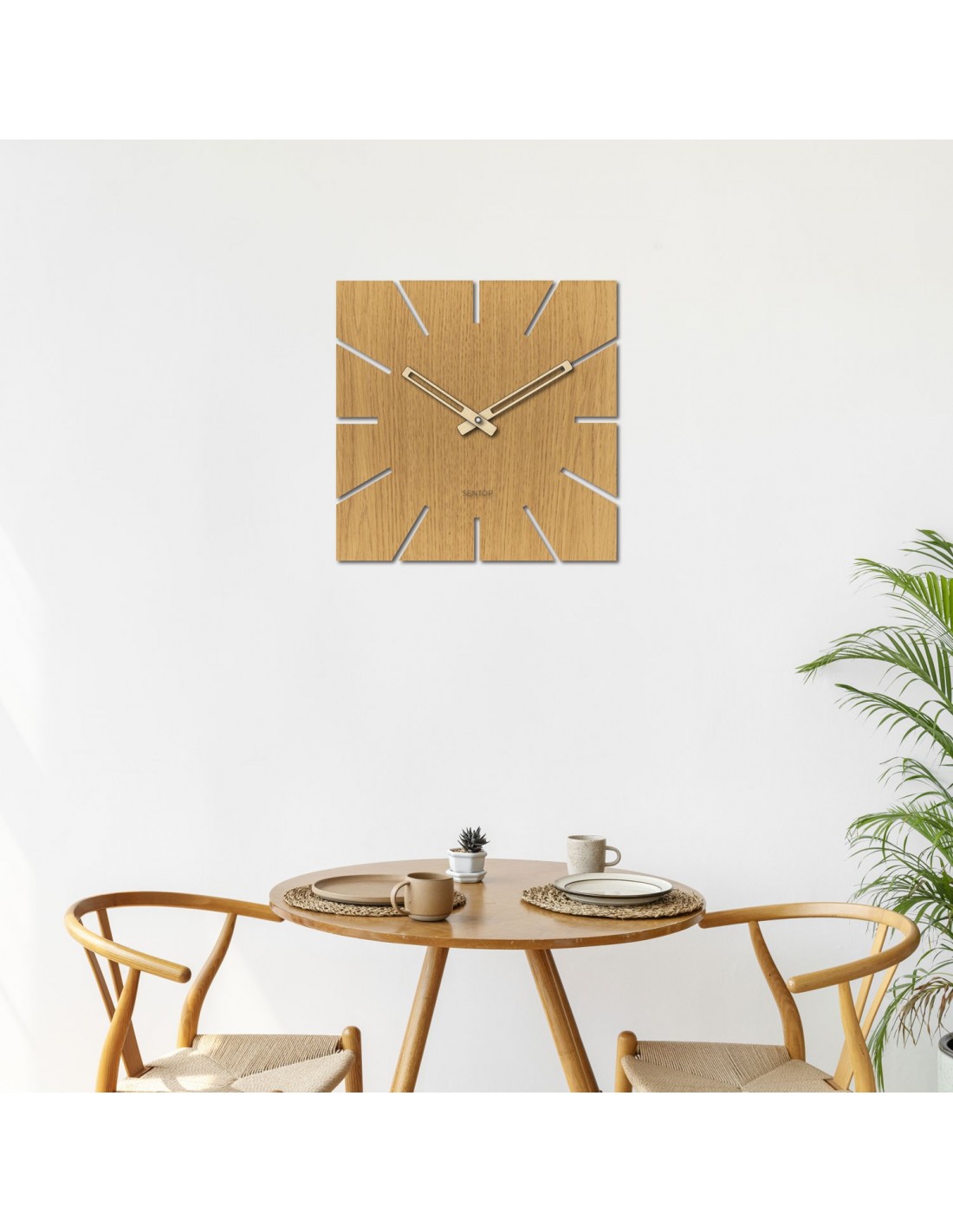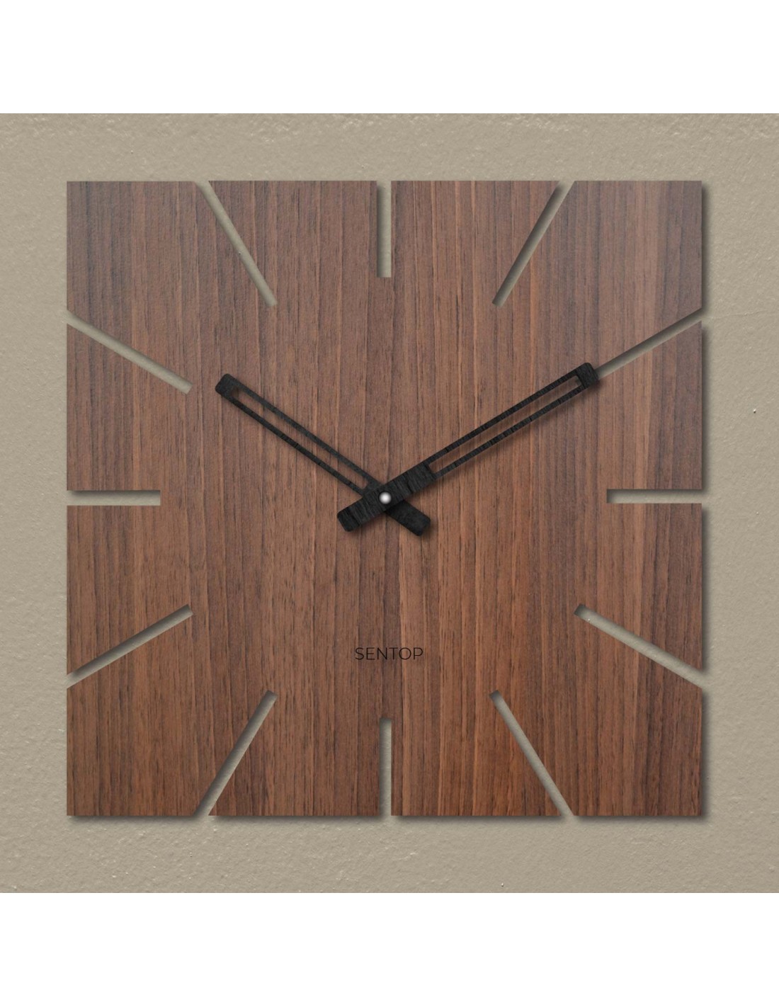 Štvorcový formát s precízne vyfrézovanými výrezmi namiesto čísiel a výrazné čierne ručičky vytvárajú moderný, no zároveň nadčasový akcent, ktorý prirodzene zapadne do každého priestoru.