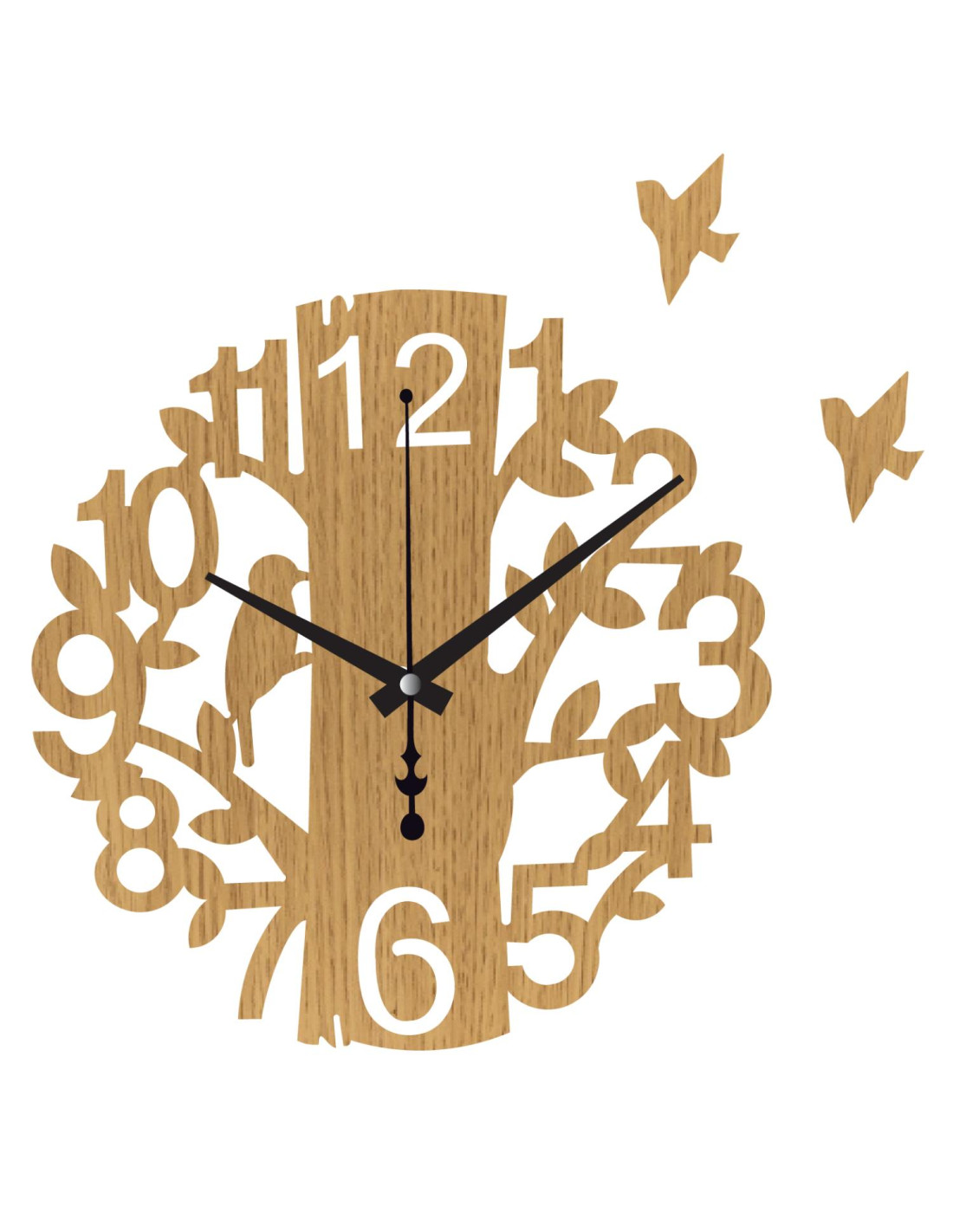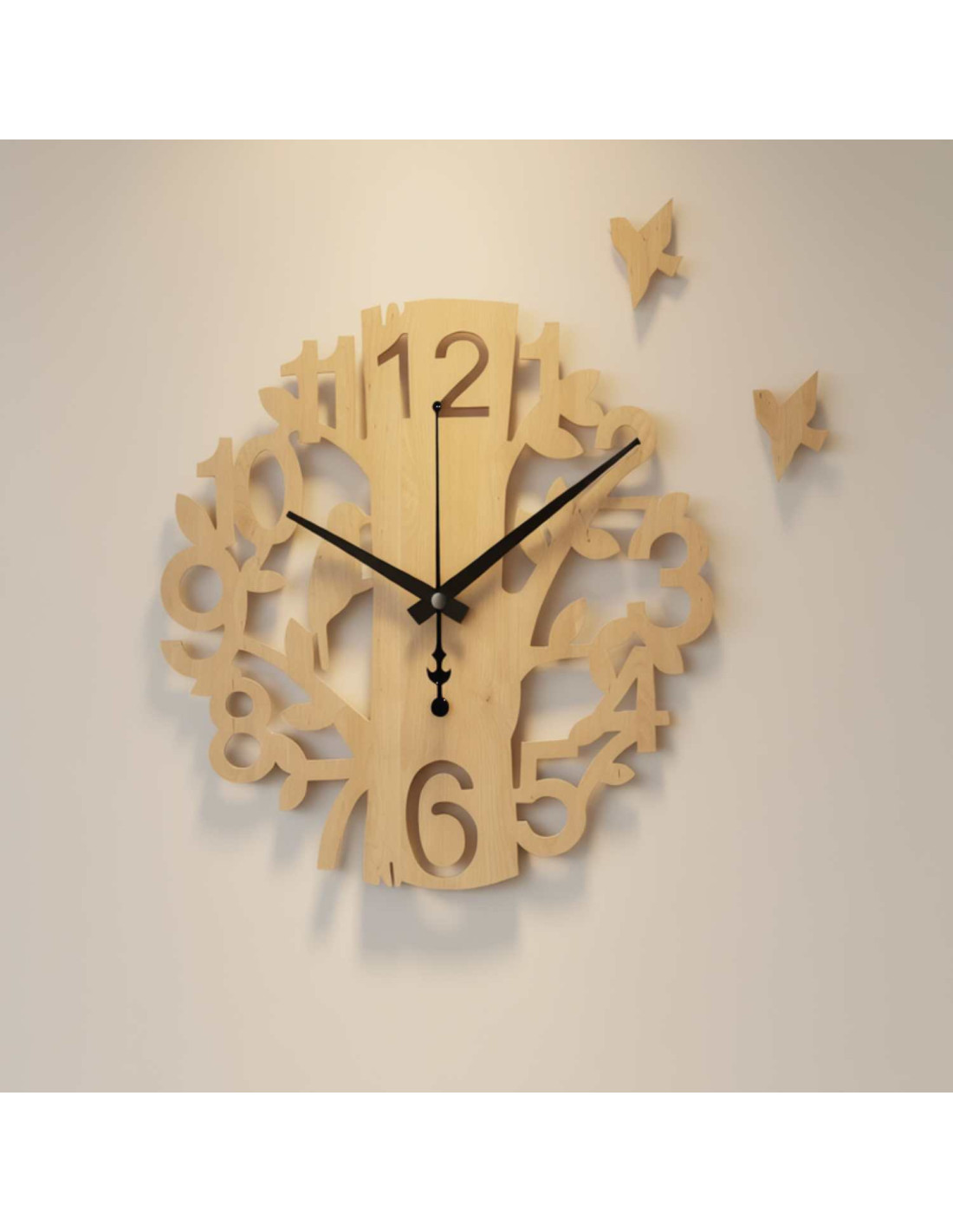 Hodiny Vtáčik spájajú prírodný vzhľad dreva s presným meraním času a tichým mechanizmom.