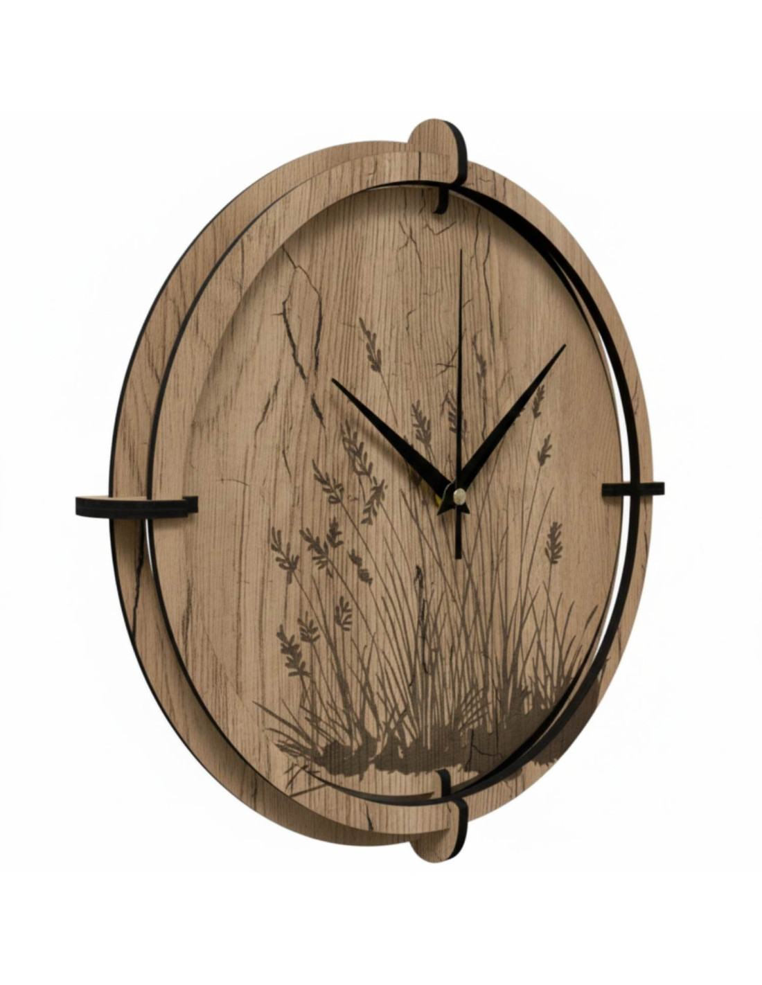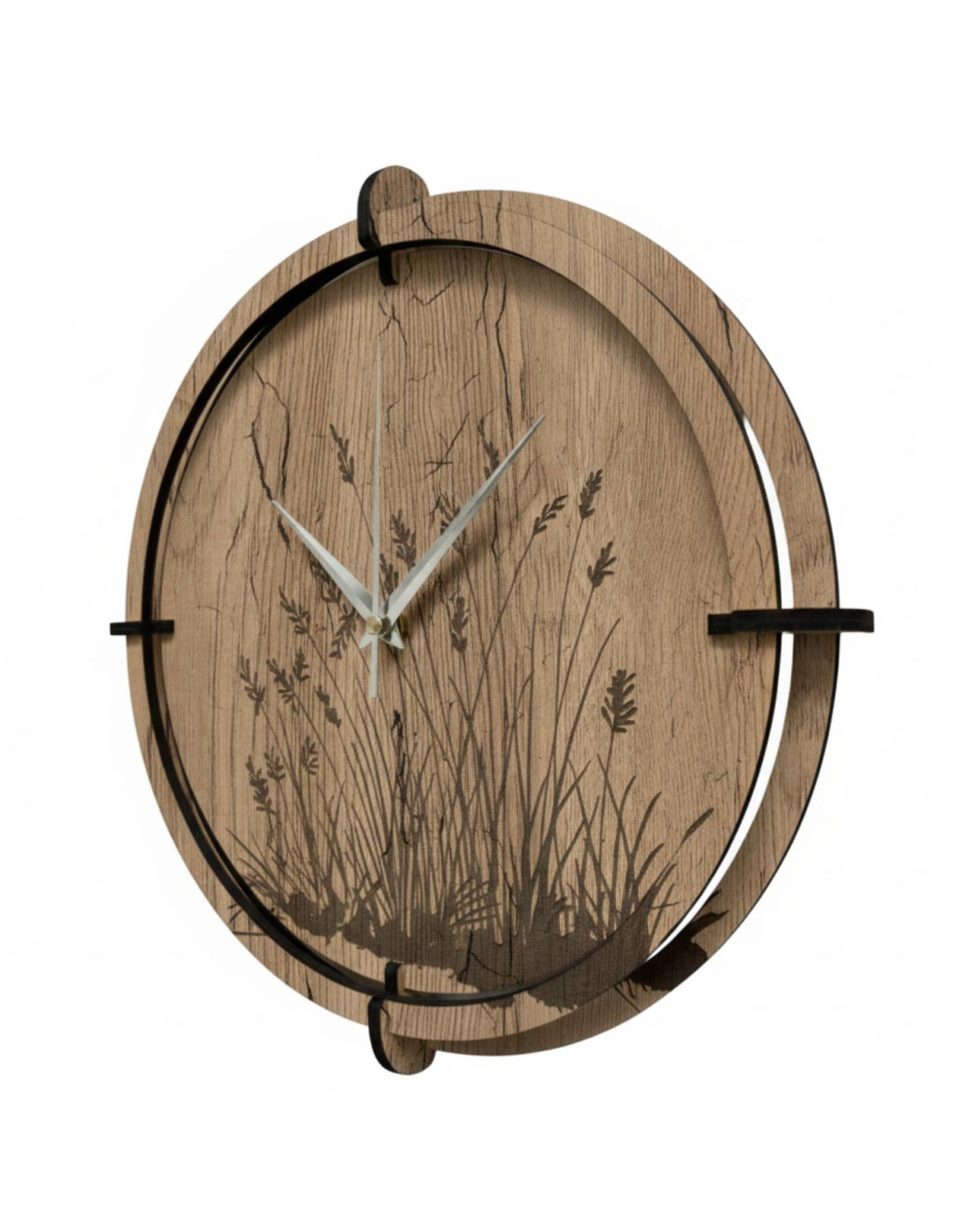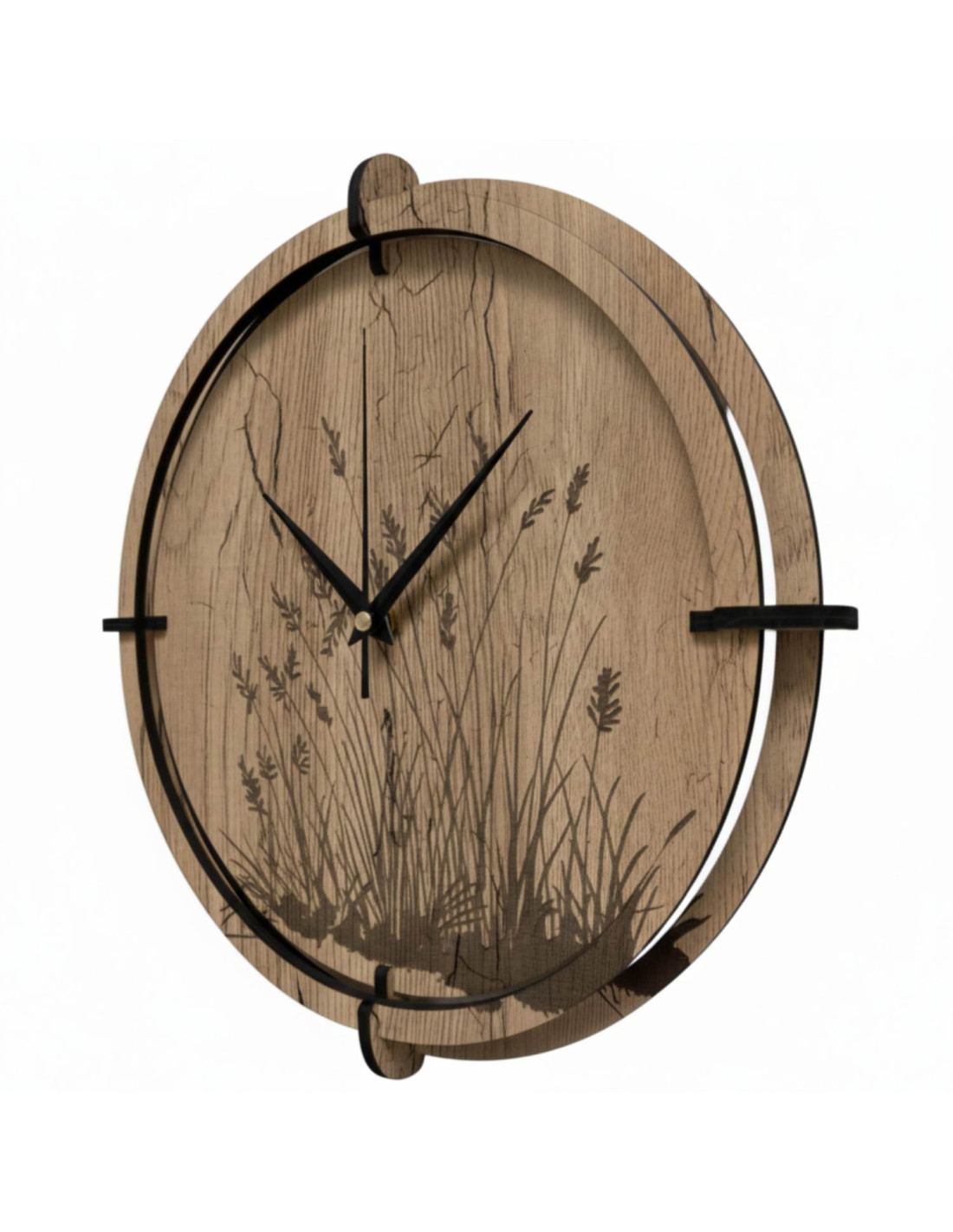 Drevené nástenné hodiny s elegantným motívom lúčnej trávy