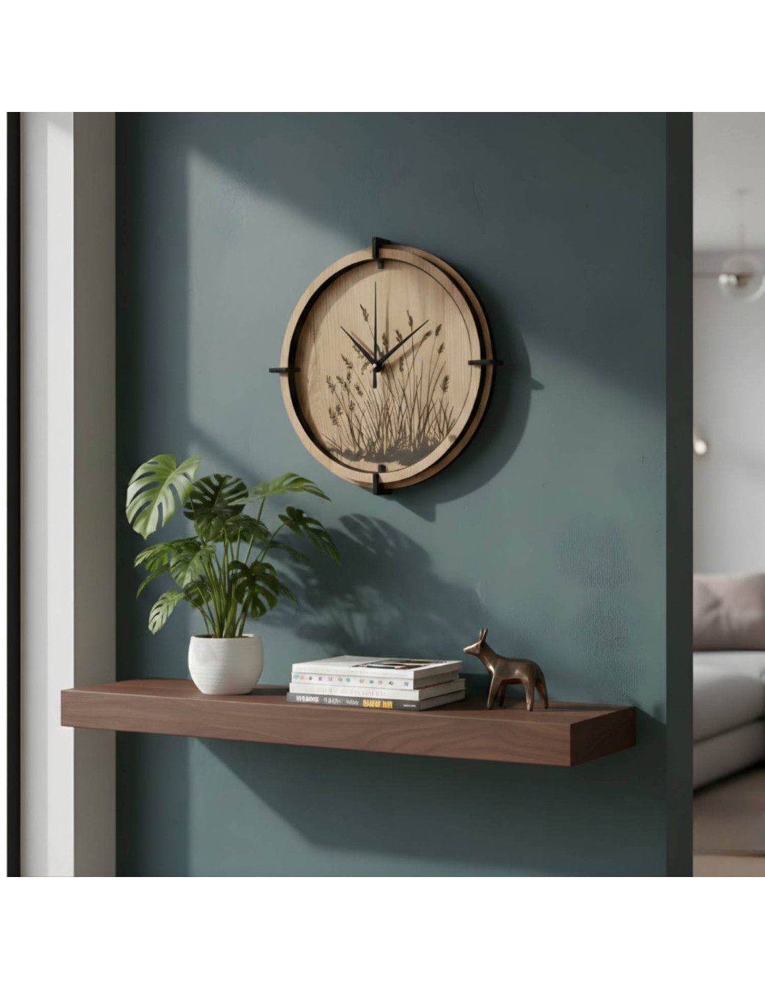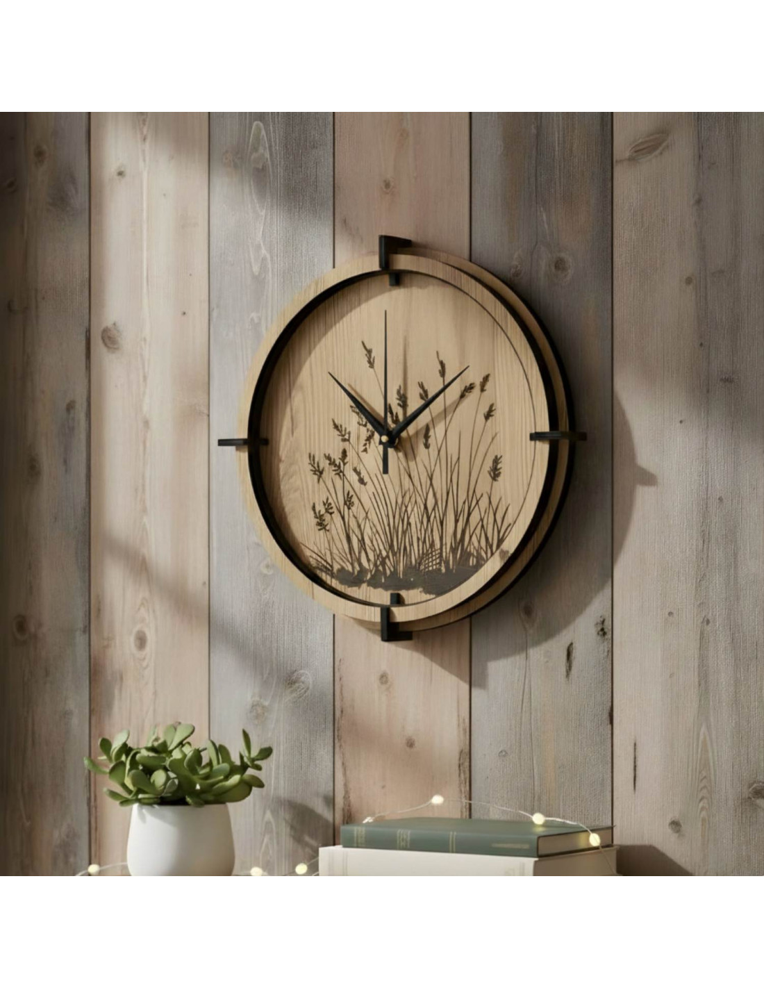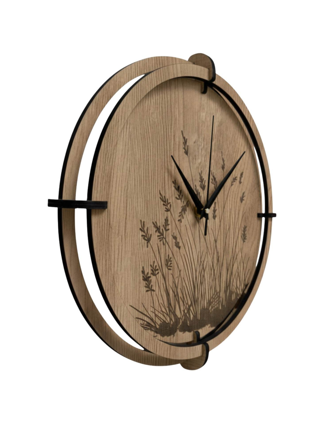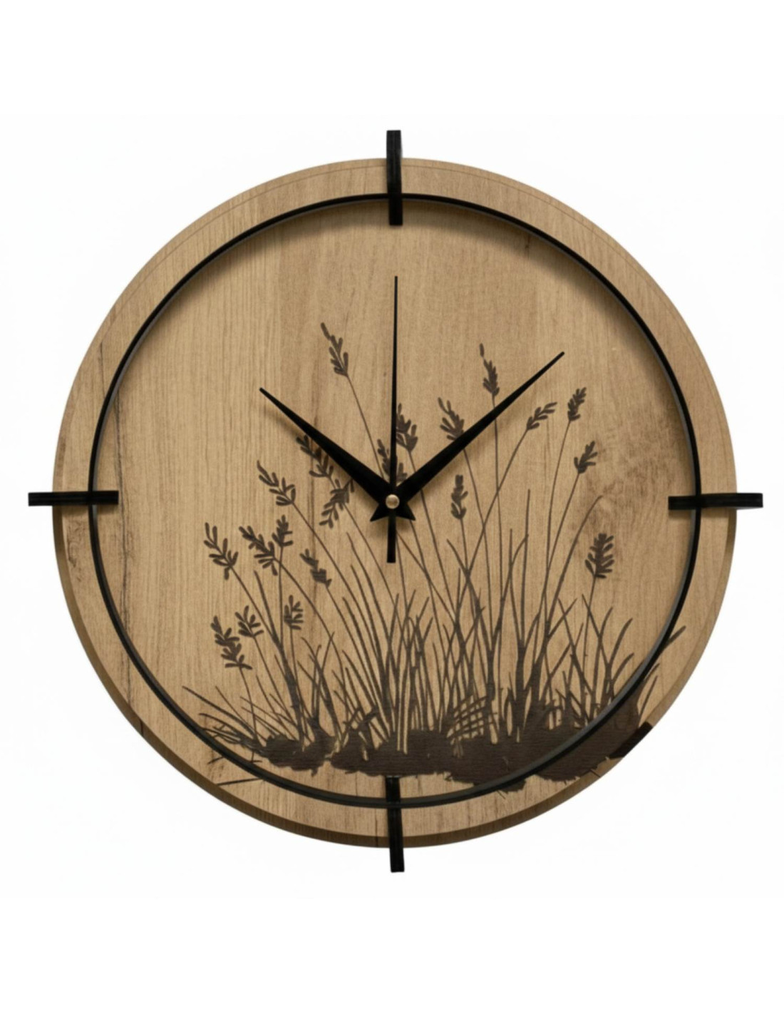 Drevené nástenné hodiny s elegantným motívom lúčnej trávy