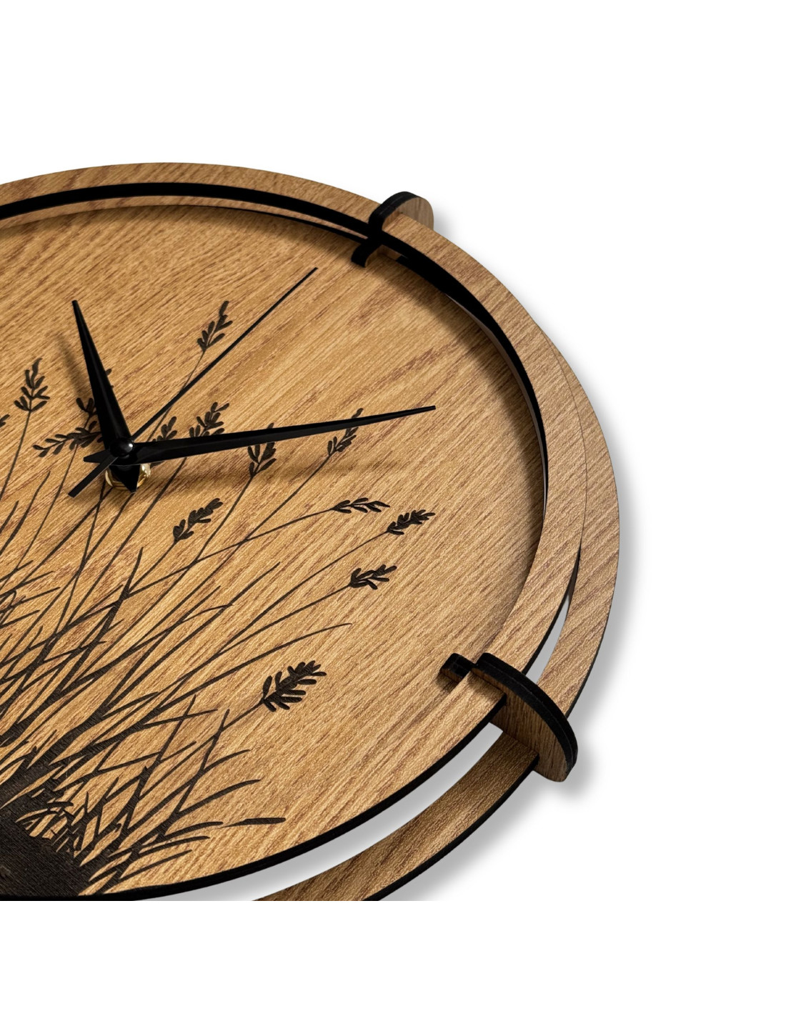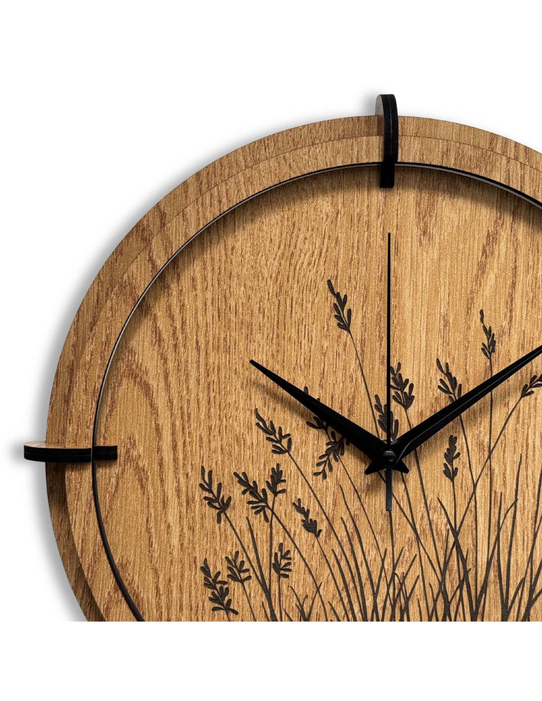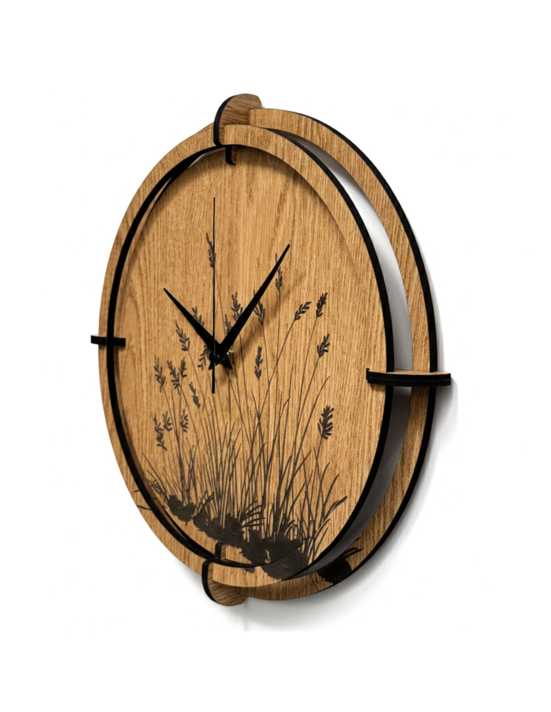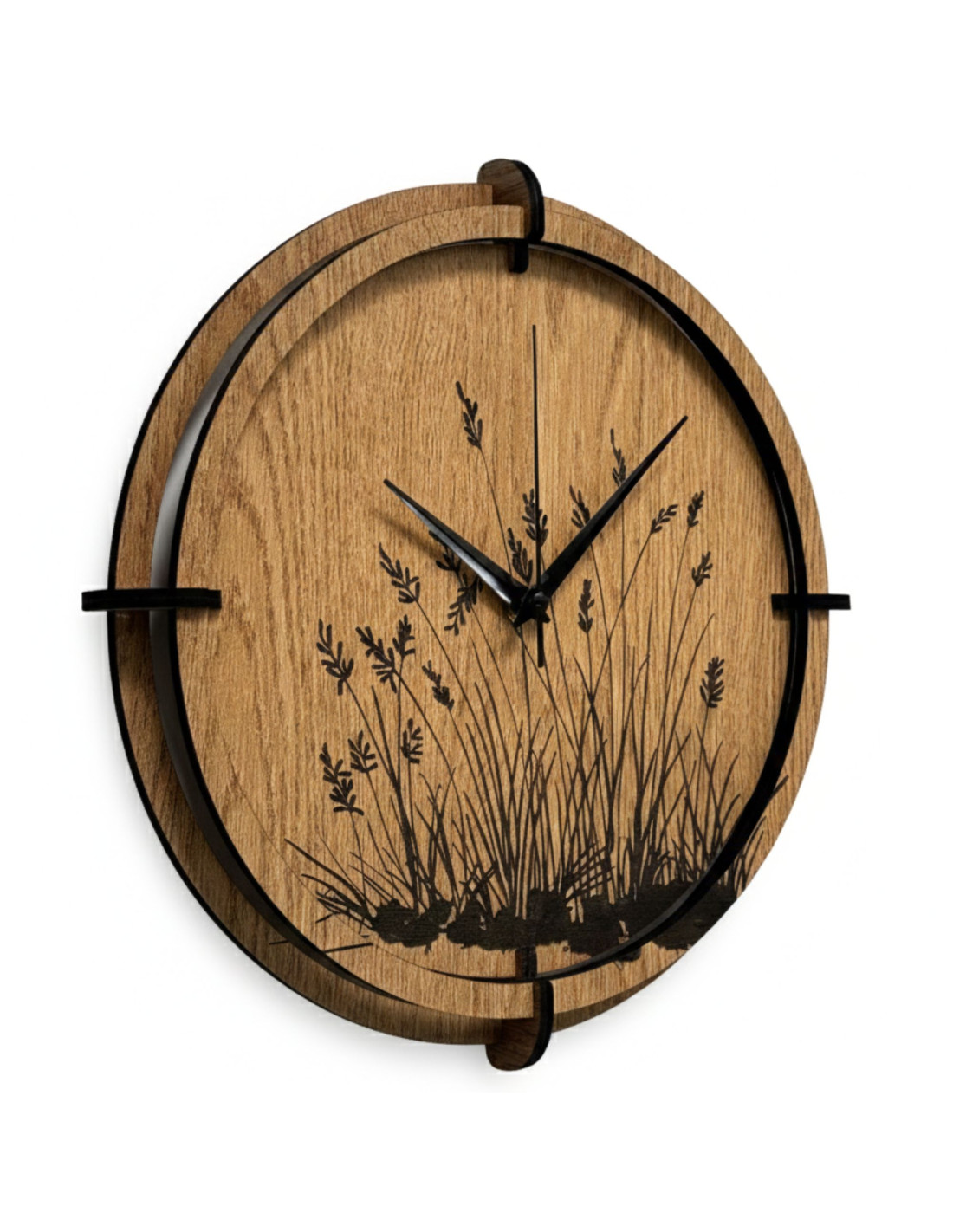 Drevené nástenné hodiny s gravírovaným motívom lúčnej trávy.