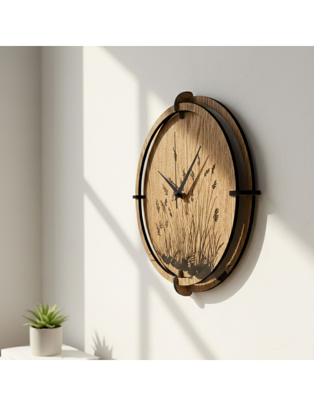 Drevené nástenné hodiny s elegantným motívom lúčnej trávy