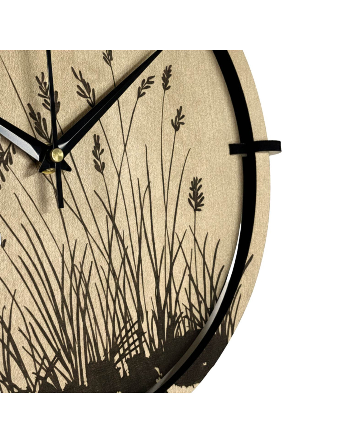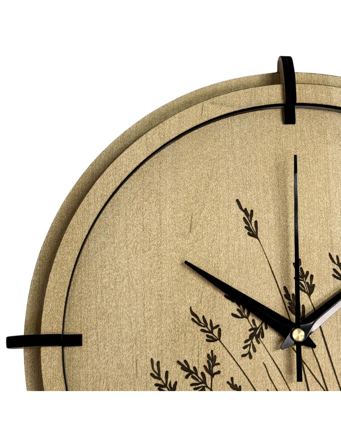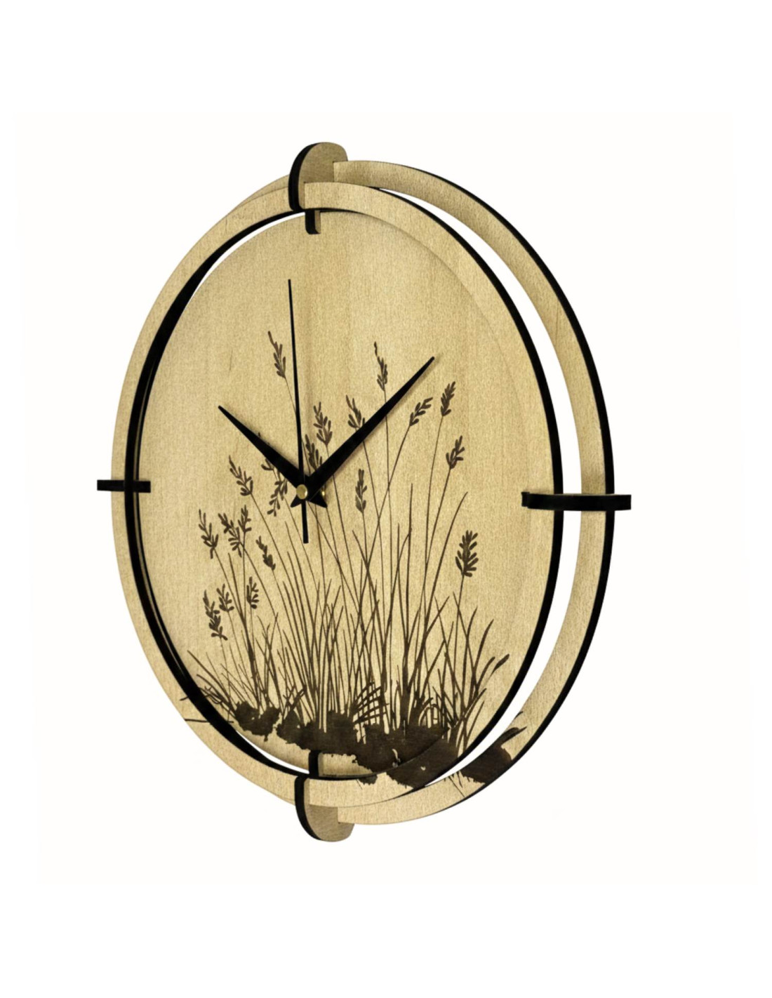 Drevené nástenné hodiny s elegantným motívom lúčnej trávy