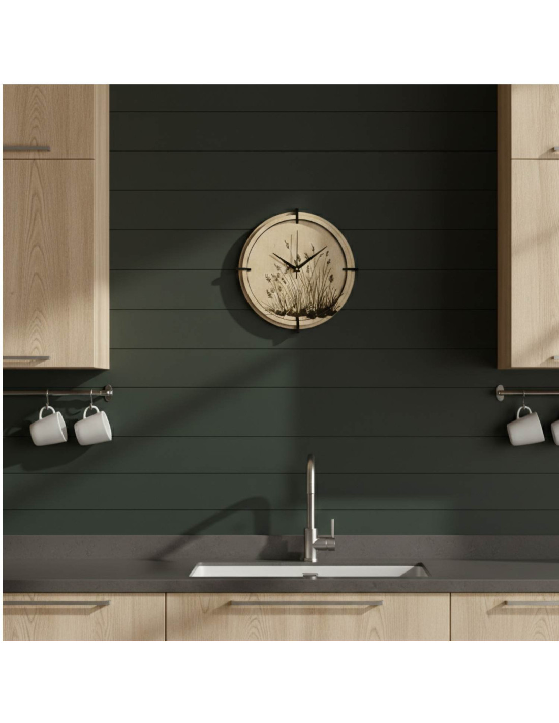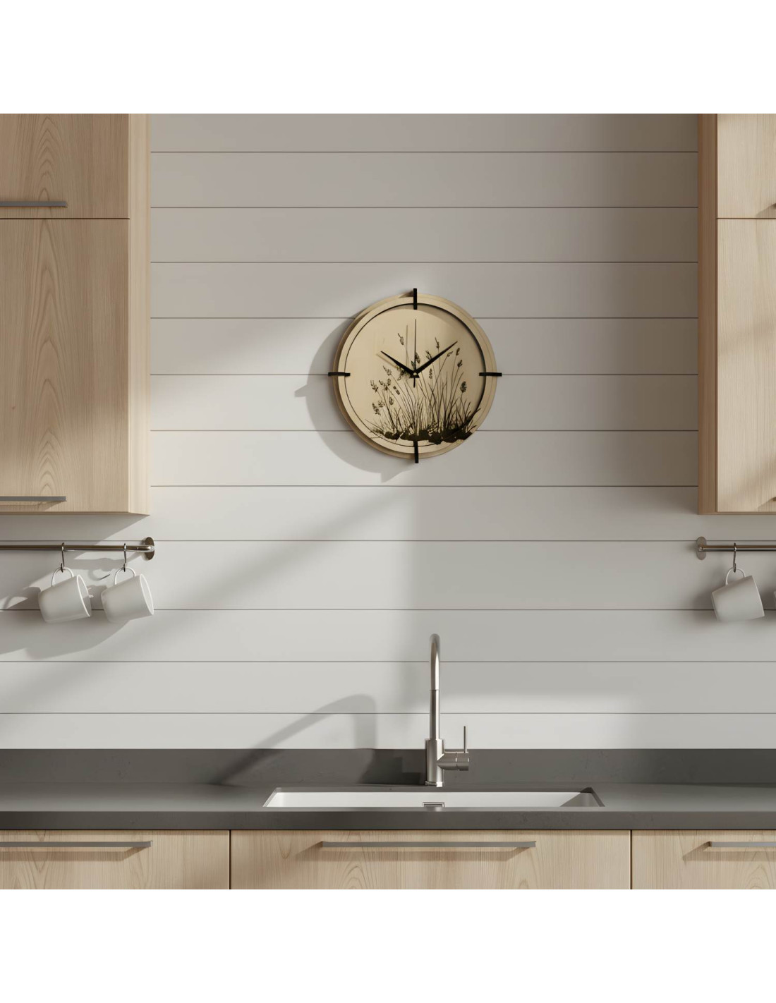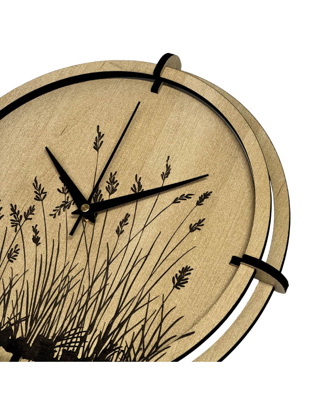 Drevené nástenné hodiny s elegantným motívom lúčnej trávy