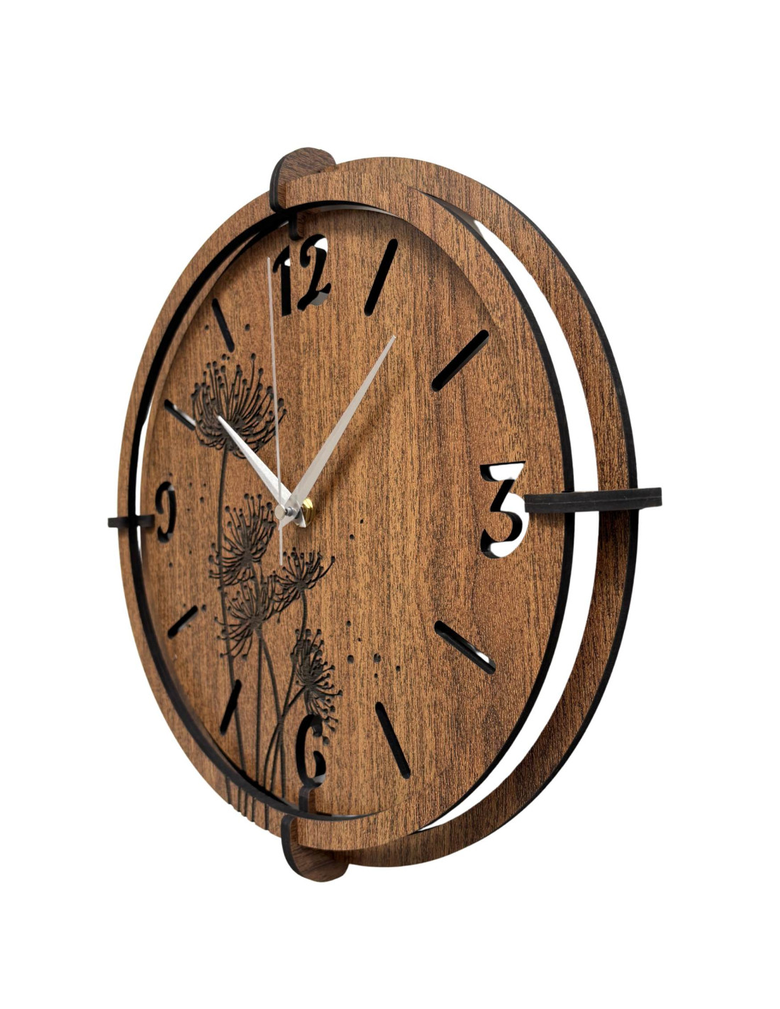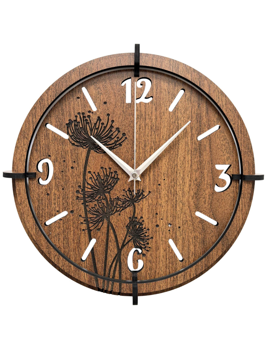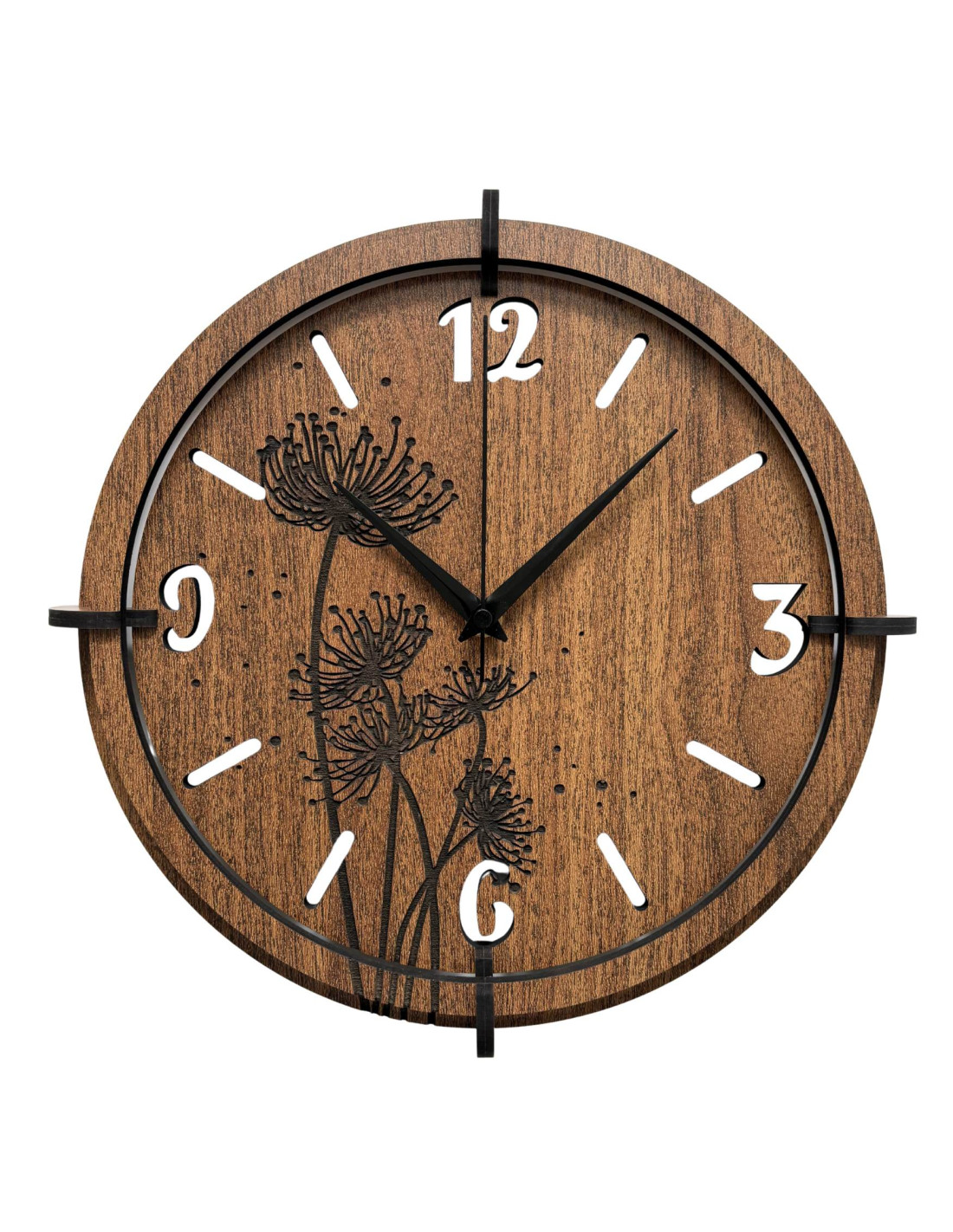 Vyrobené z kvalitnej HDF dosky (wenge/orech) s precízne vyrezávaným ciferníkom a štýlovými ručičkami.