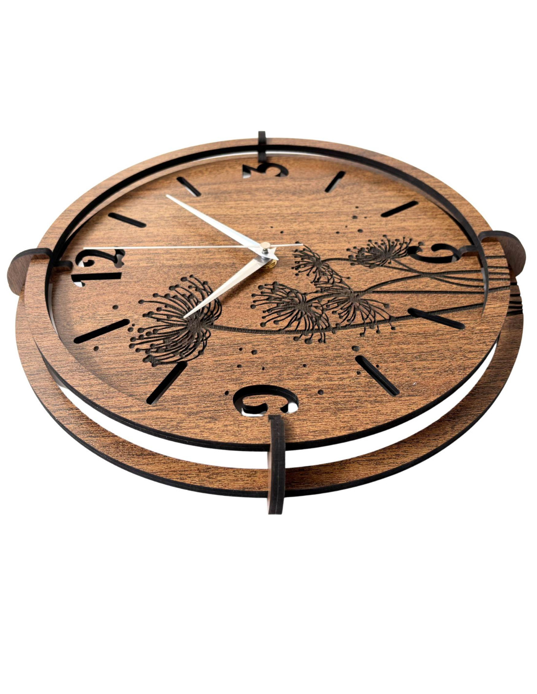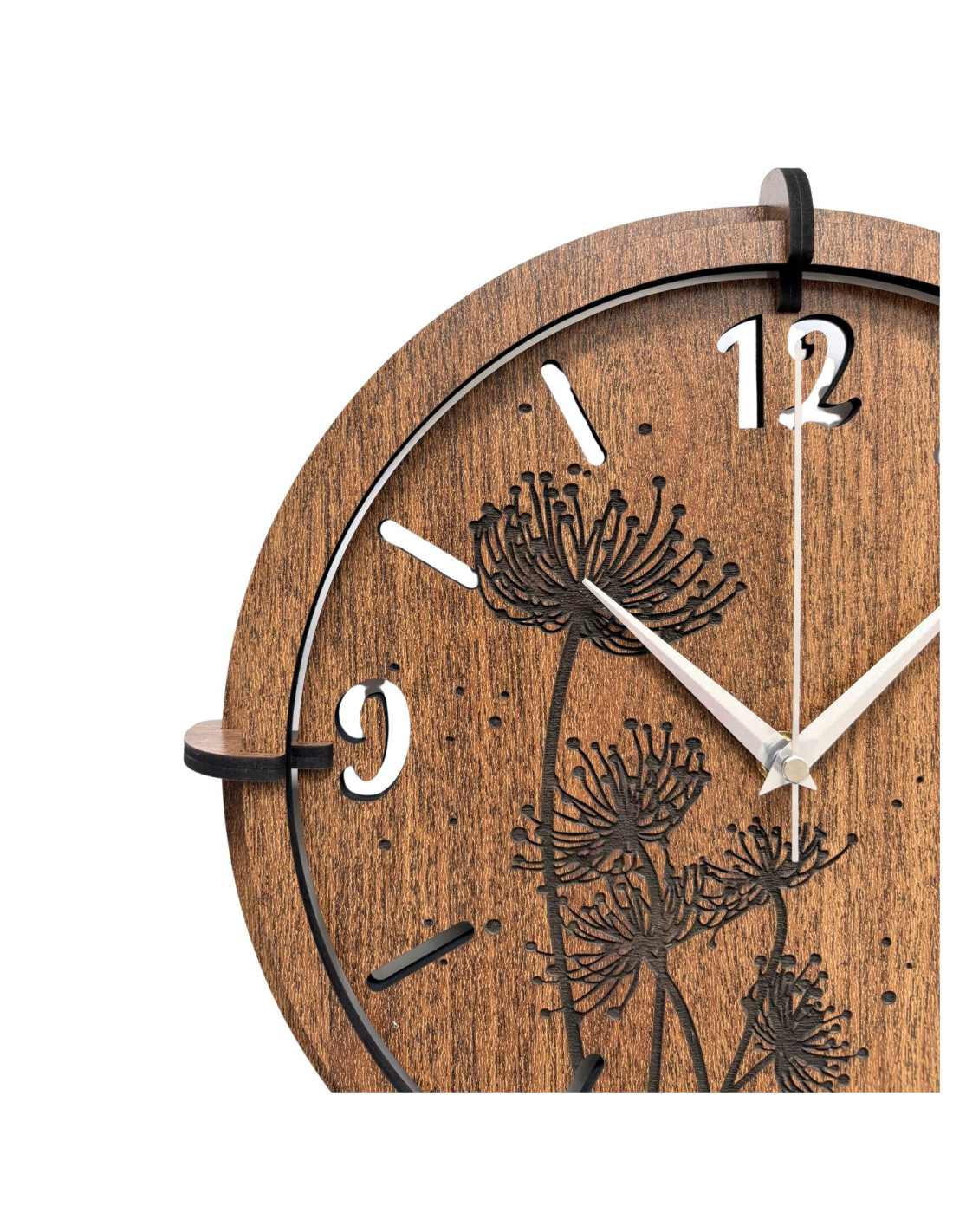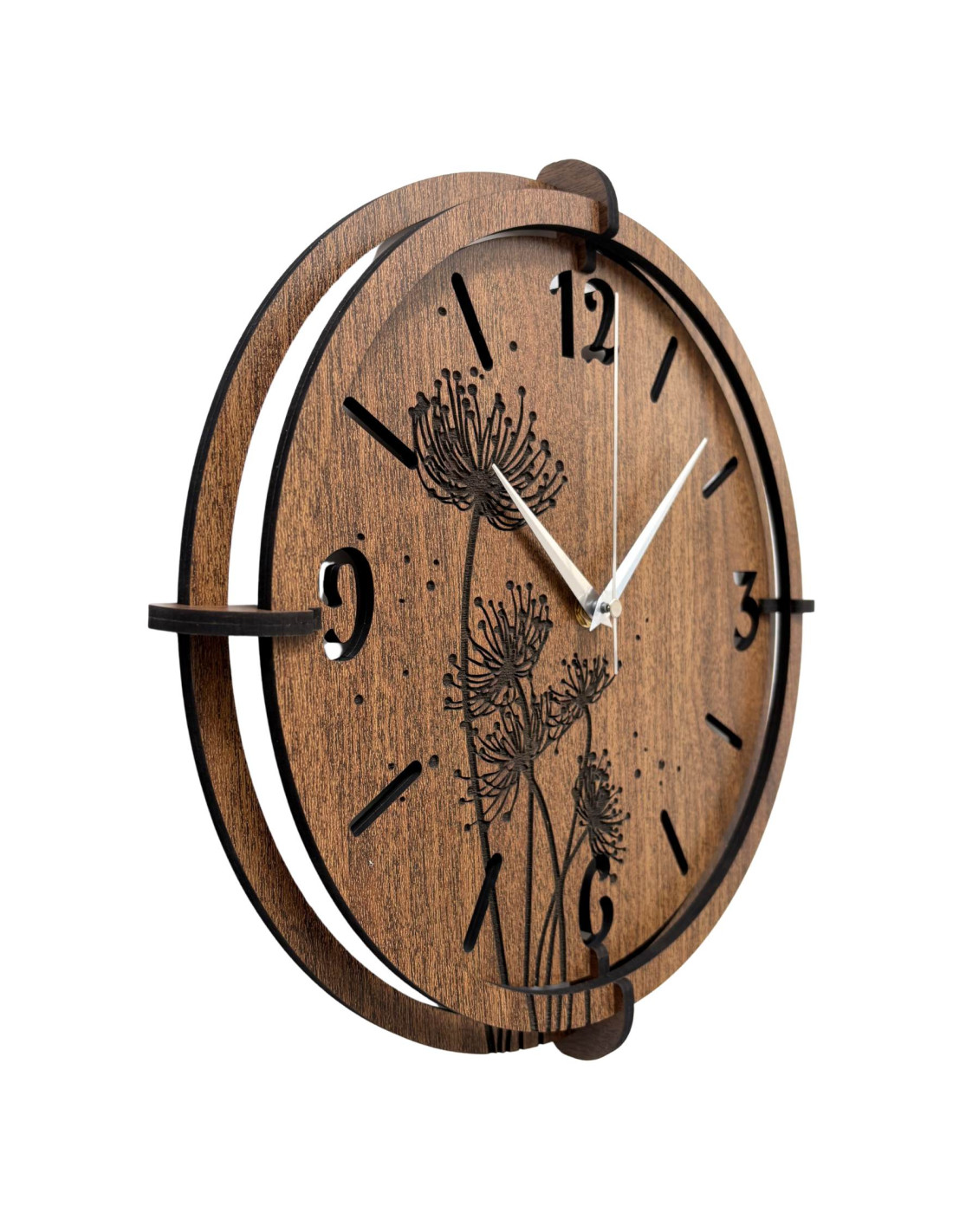 Vyrobené z kvalitnej HDF dosky (wenge/orech) s precízne vyrezávaným ciferníkom a štýlovými ručičkami.