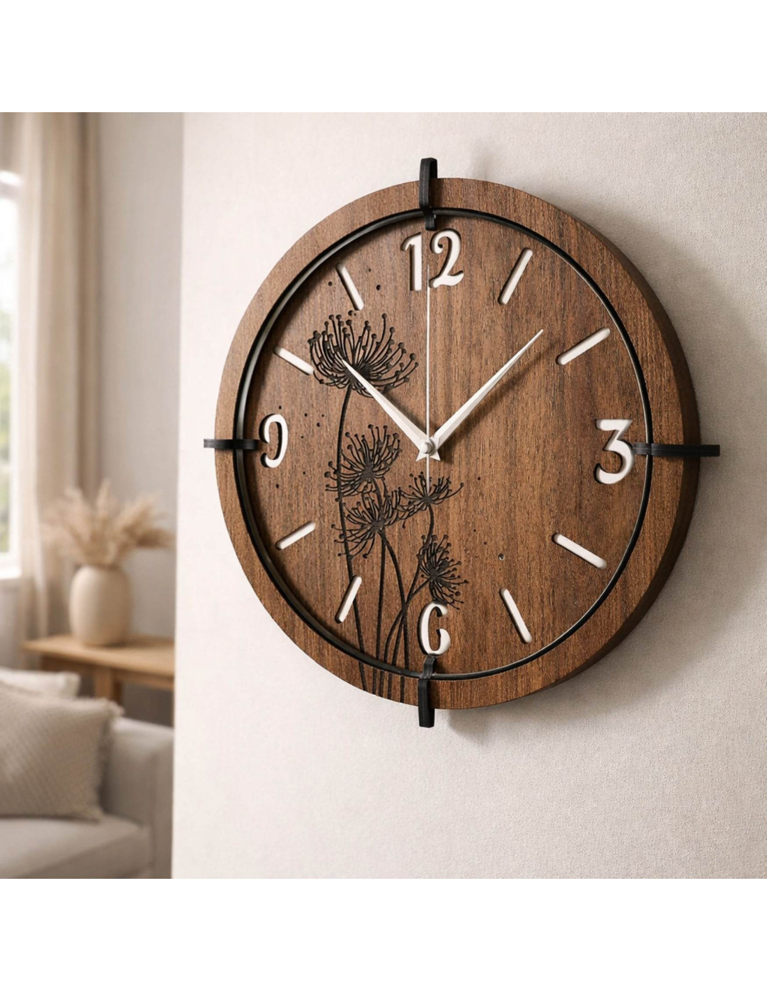 Moderné drevené nástenné hodiny s motívom púpav a lúčnych tráv vnesú do interiéru pokoj a harmóniu.
