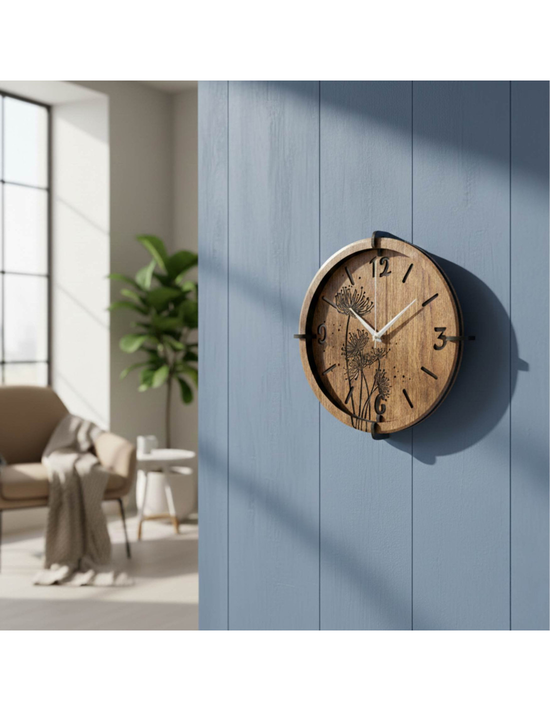 Jemné siluety rastlín a kontrastné ručičky vytvárajú upokojujúcu atmosféru vhodnú do obývačky, spálne, kuchyne, pracovne či reprezentatívnej kancelárie.