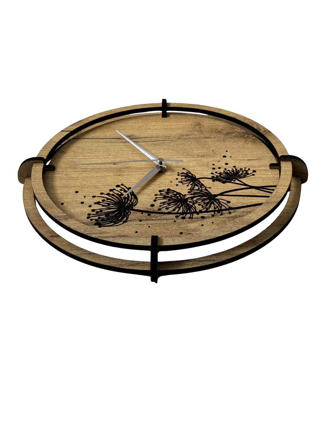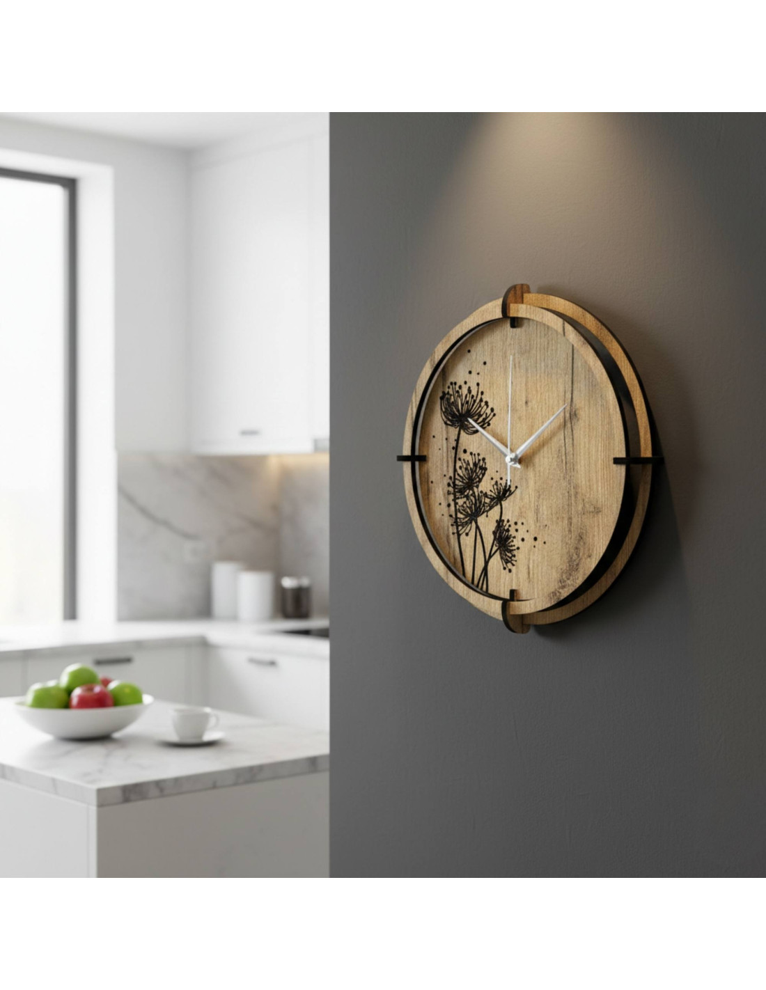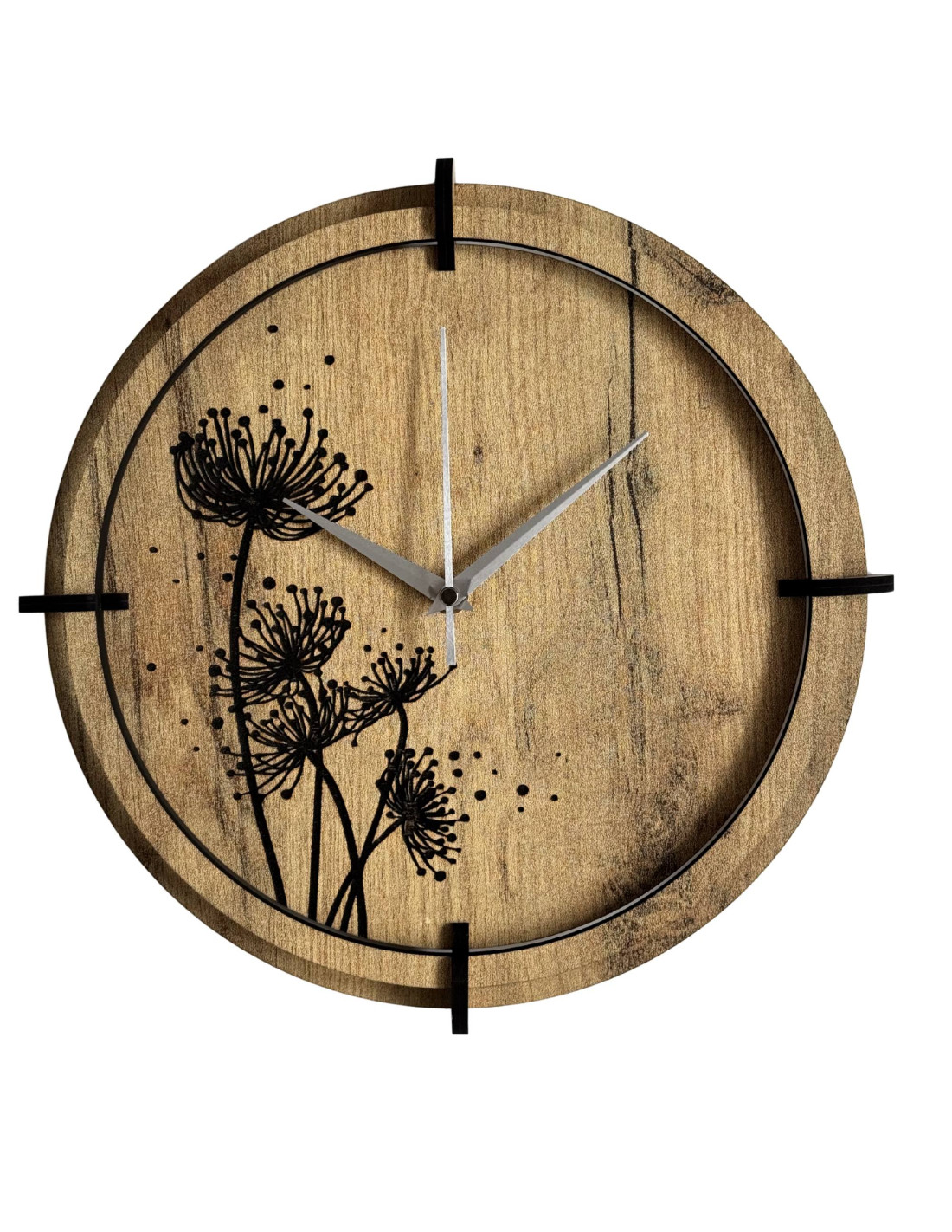 Drevené hodiny s gravírovaným rastlinným motívom spájajú estetiku prírody s presným meraním času a tichým chodom mechanizmu.