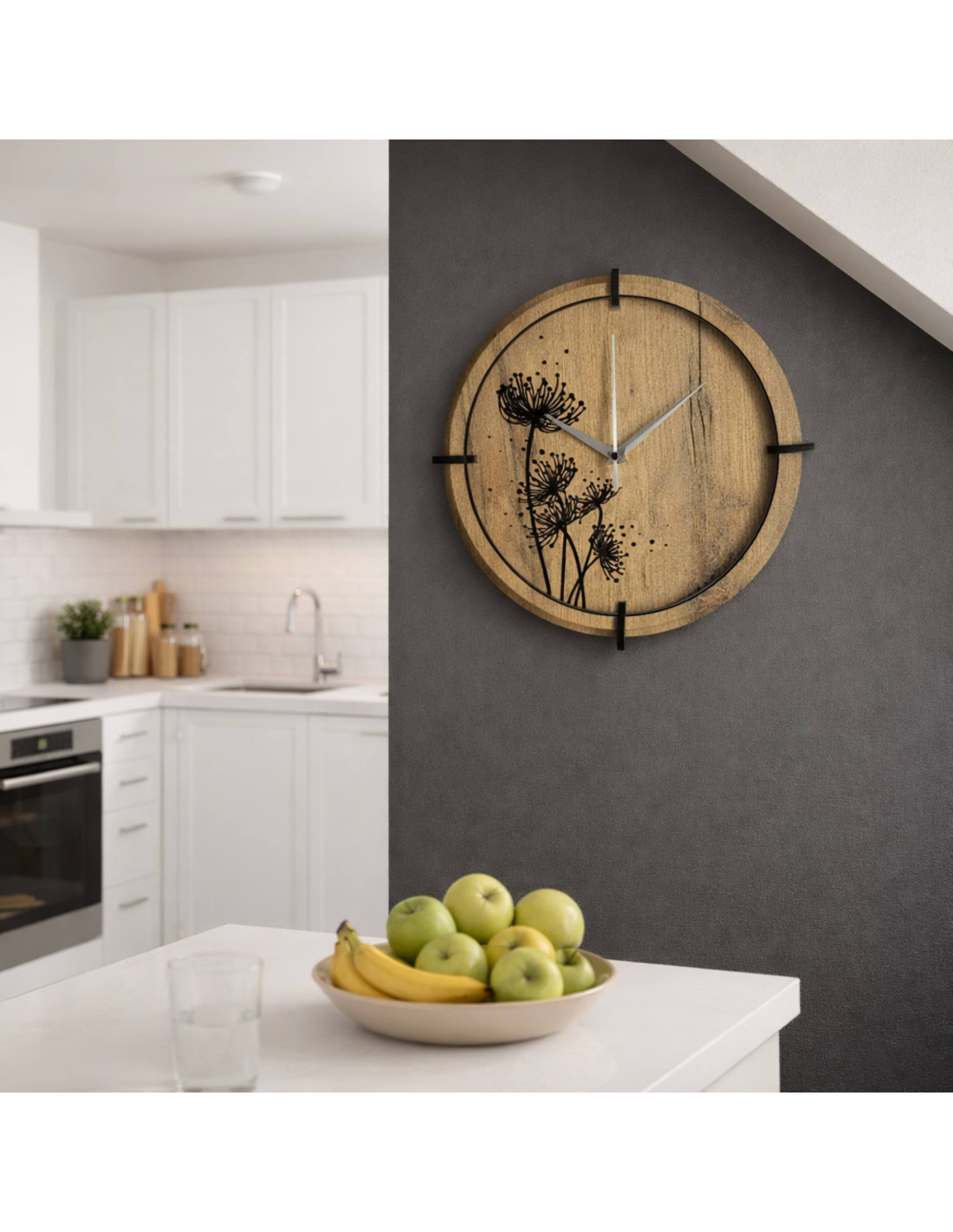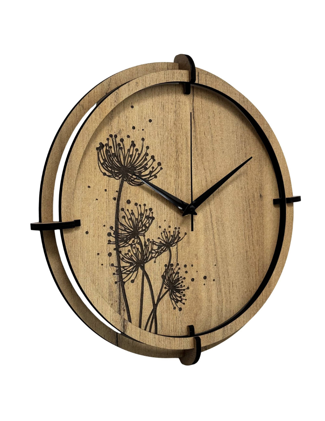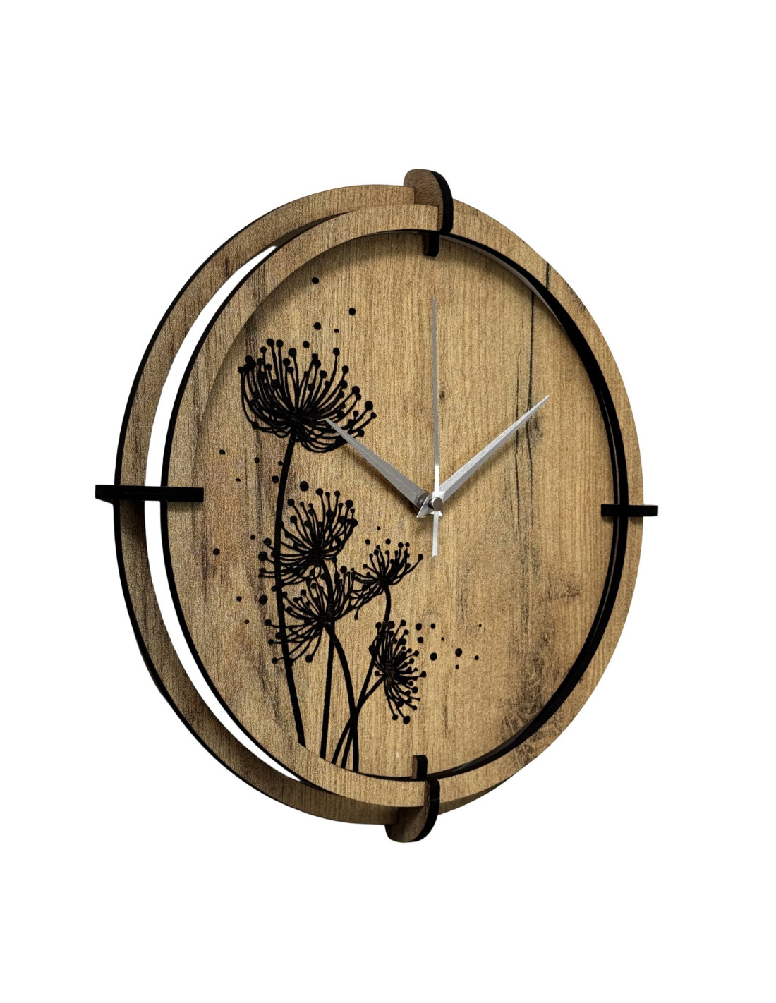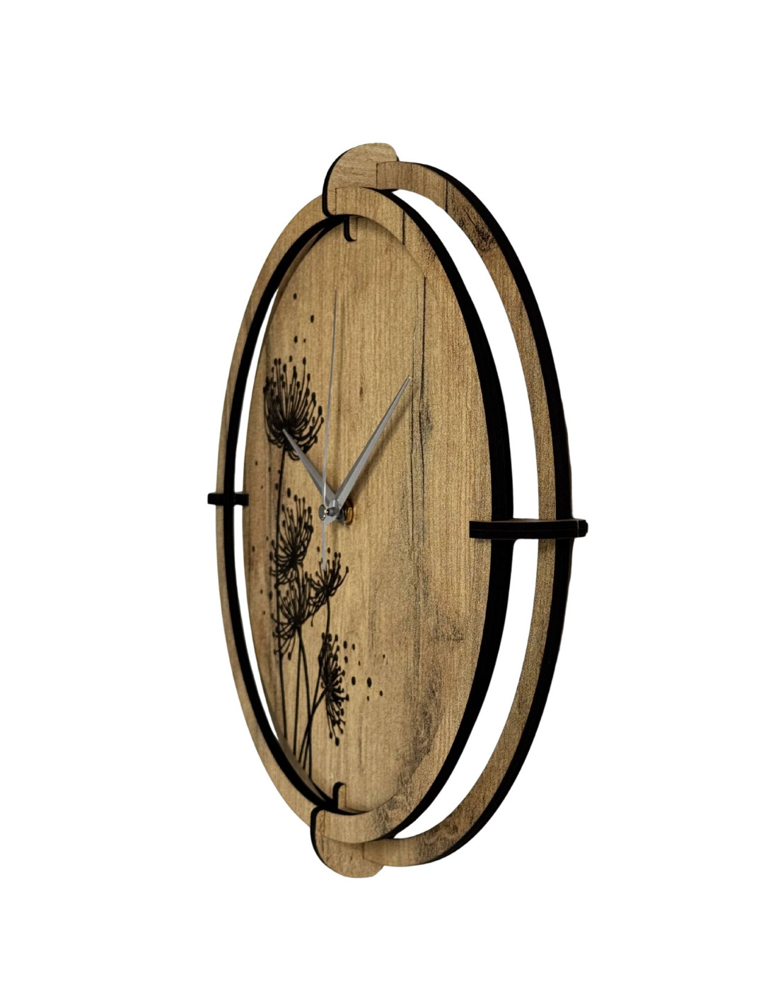 Drevené hodiny s gravírovaným rastlinným motívom spájajú estetiku prírody s presným meraním času a tichým chodom mechanizmu.