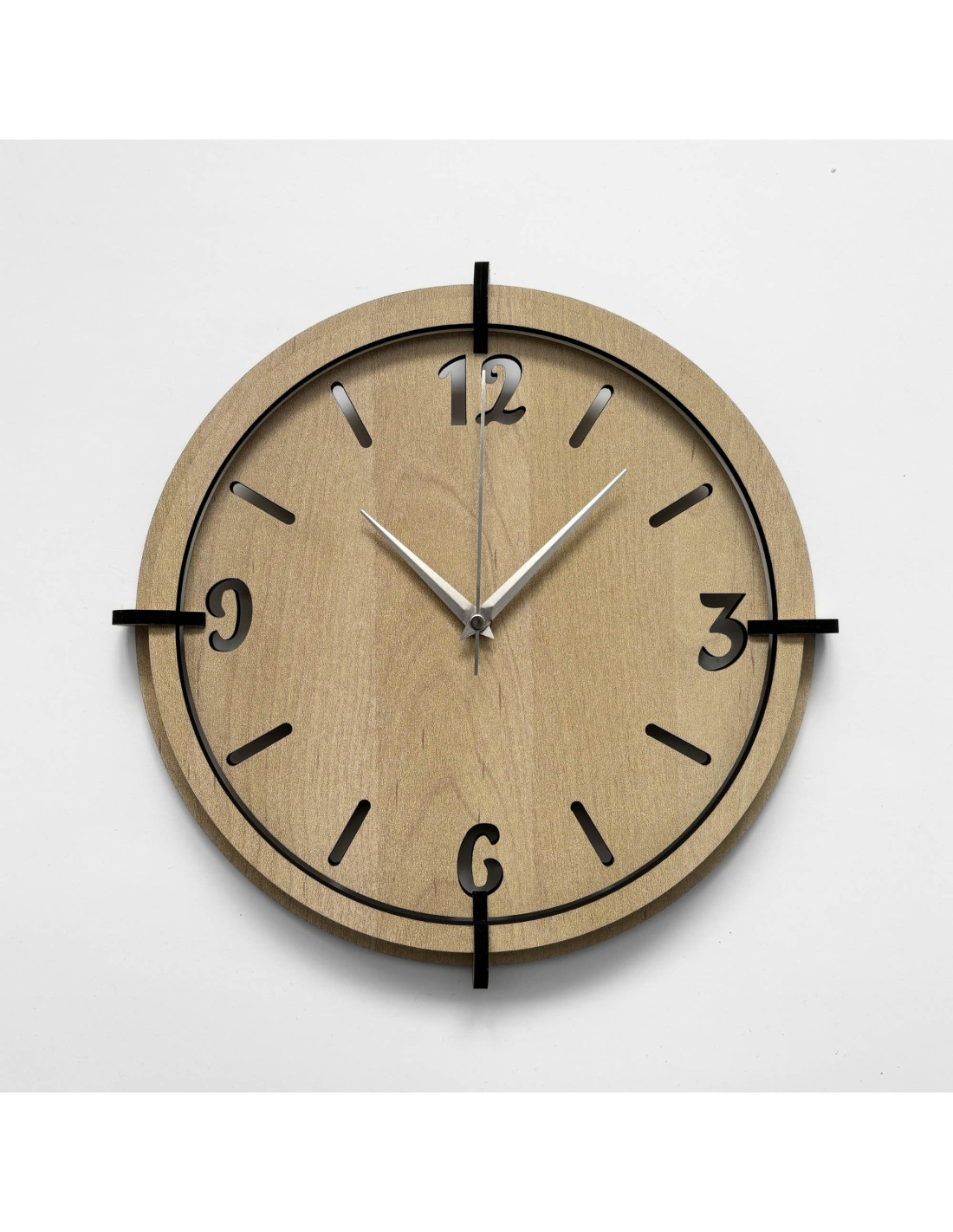 Tieto nástenné hodiny z HDF dreveného materiálu spájajú moderný materiál s poctivým remeslom.
