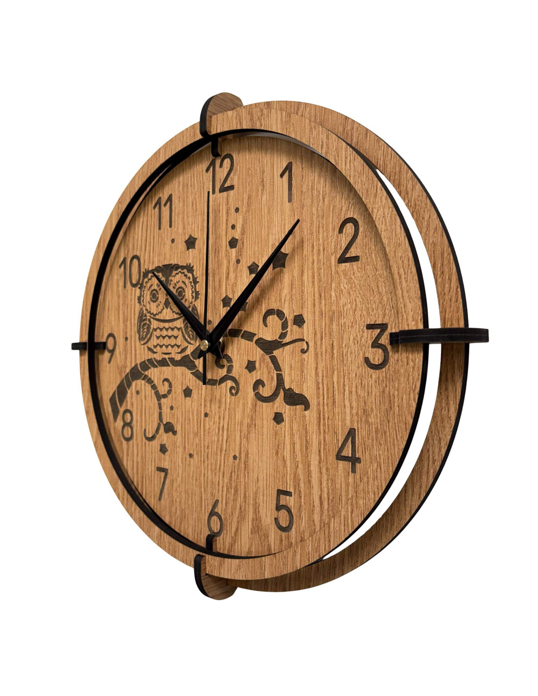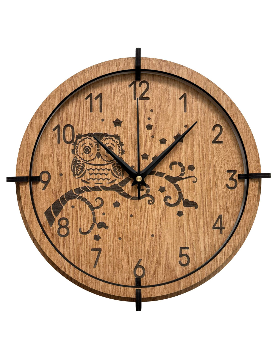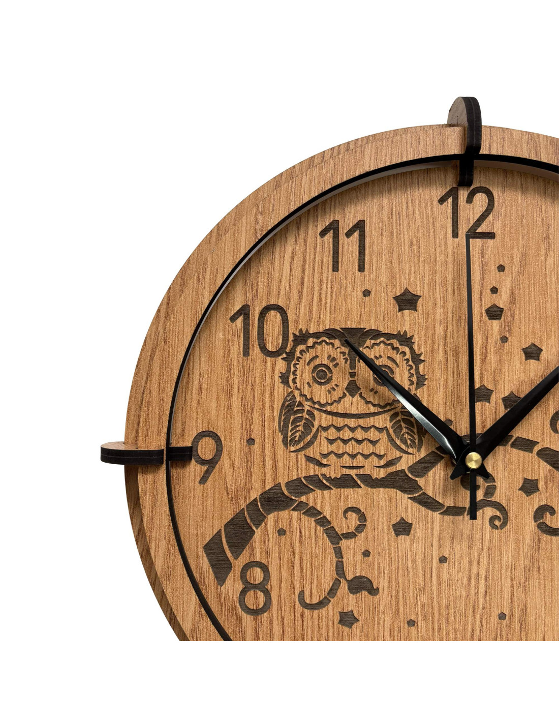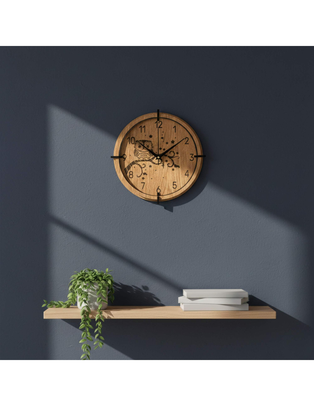 Moderné drevené nástenné hodiny s detailne gravírovaným motívom sovy na vetve a nočnej oblohy vnesú do interiéru pokoj, teplo domova a jemný prírodný akcent.