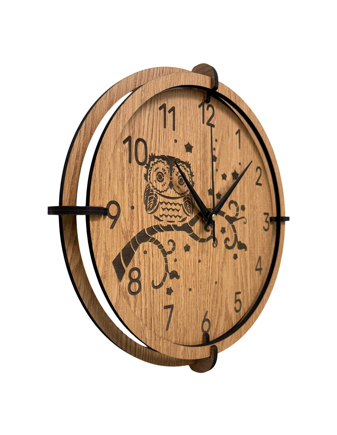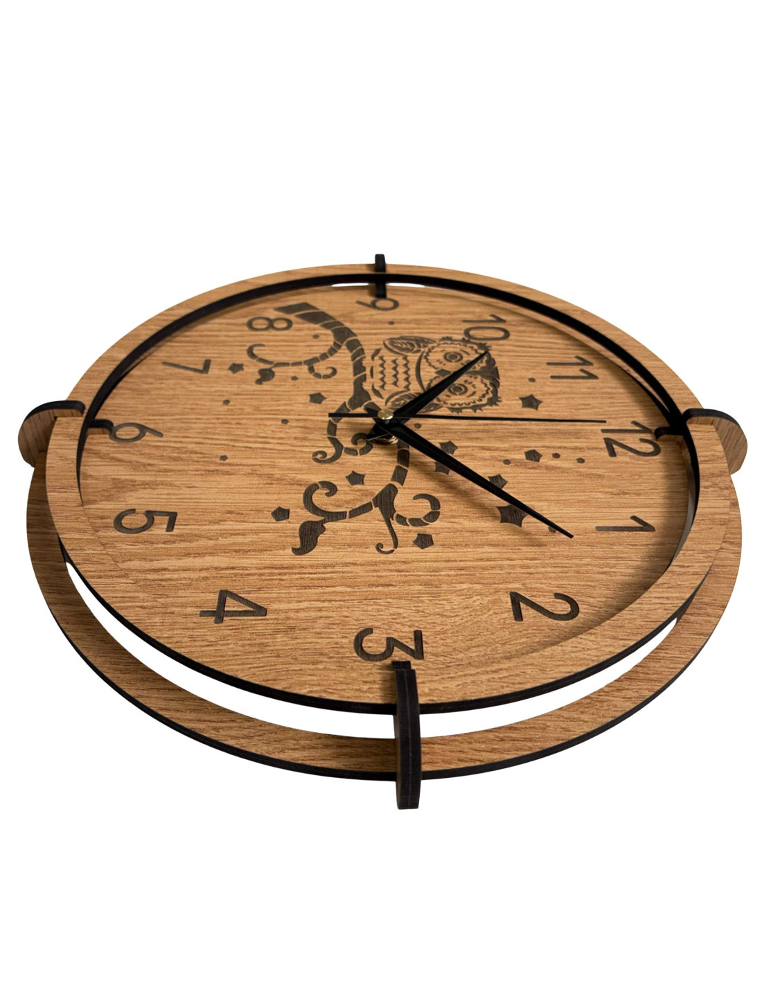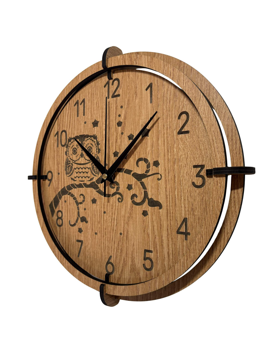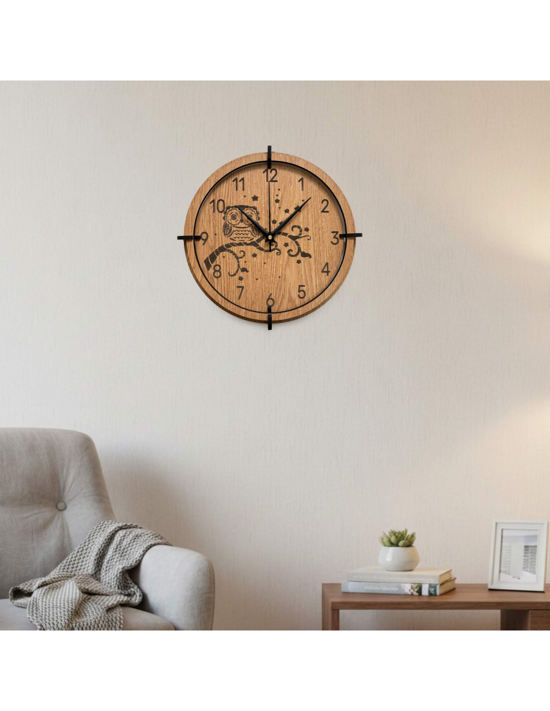 Moderné drevené nástenné hodiny s detailne gravírovaným motívom sovy na vetve a nočnej oblohy vnesú do interiéru pokoj, teplo domova a jemný prírodný akcent.