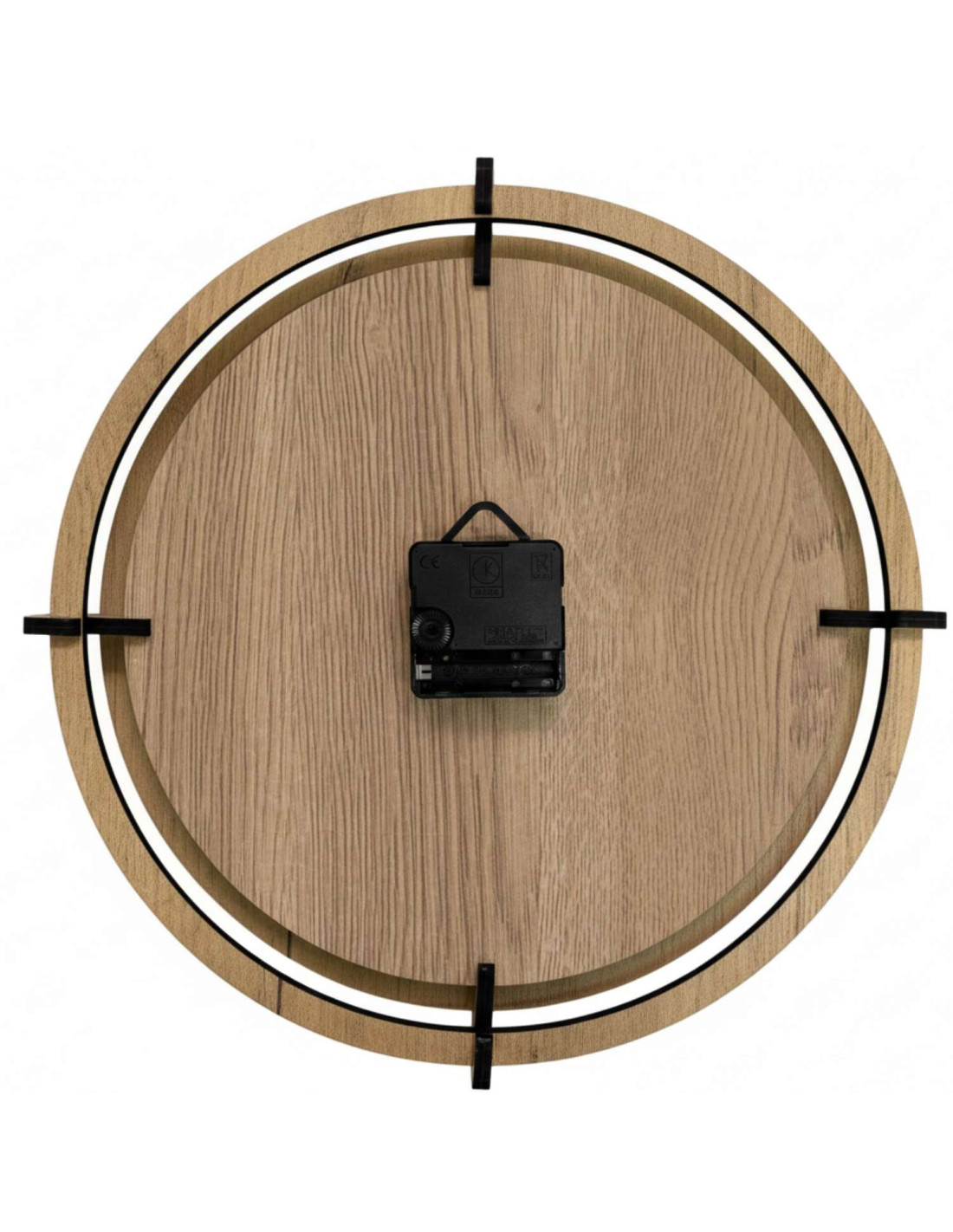 Dominantou je svetlý dubový dekor s výraznou kresbou dreva, doplnený o elegantný čierny kovový rám, ktorý hodinám dodáva moderný kontrast.