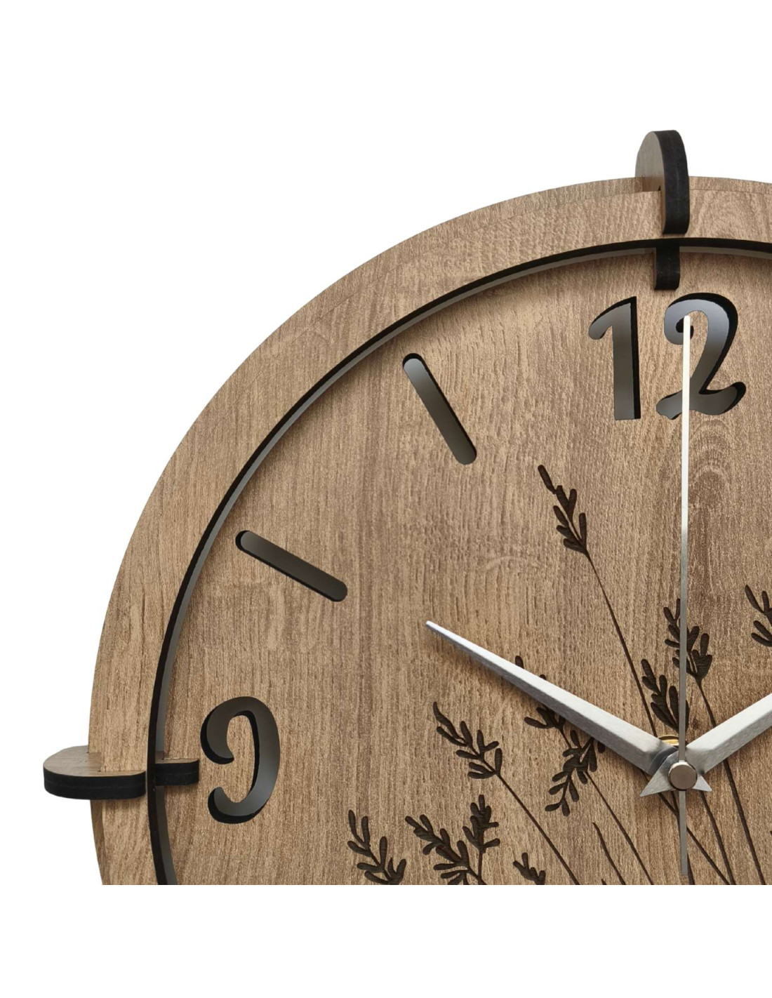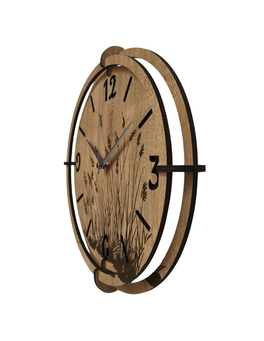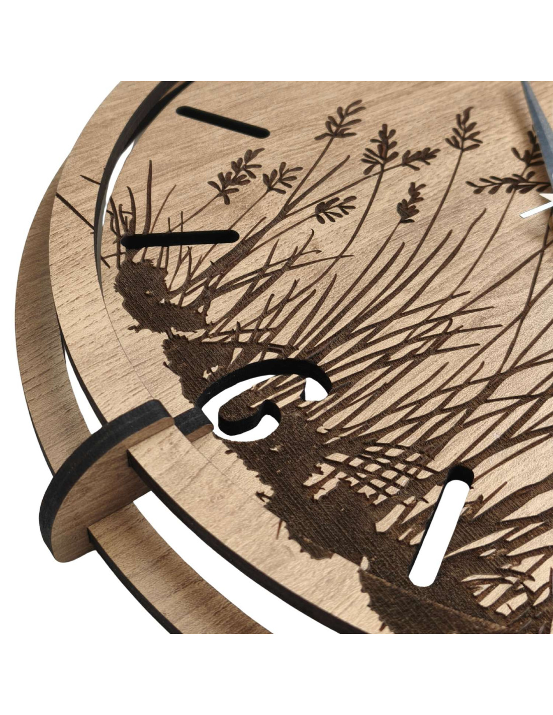 Moderné drevené nástenné hodiny s jemným gravírovaným motívom lúčnych tráv prinášajú do interiéru pokoj a harmóniu.