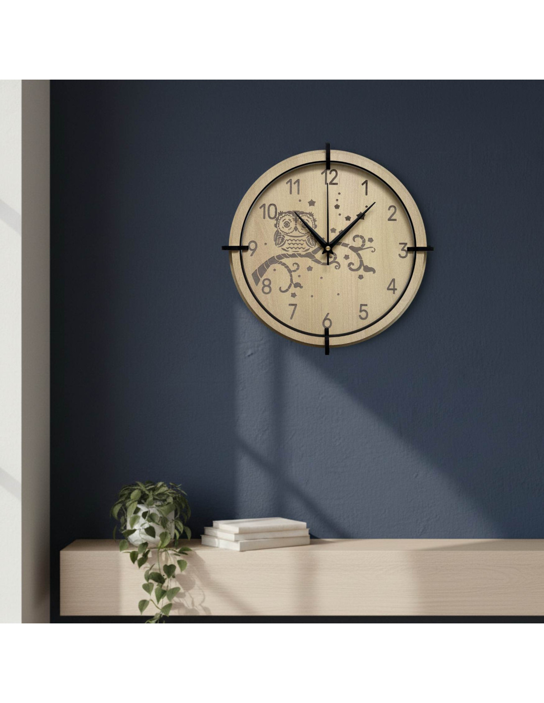 Moderné drevené nástenné hodiny javor s jemným gravírovaným motívom sovy pre deti prinášajú do interiéru pokoj a harmóniu.