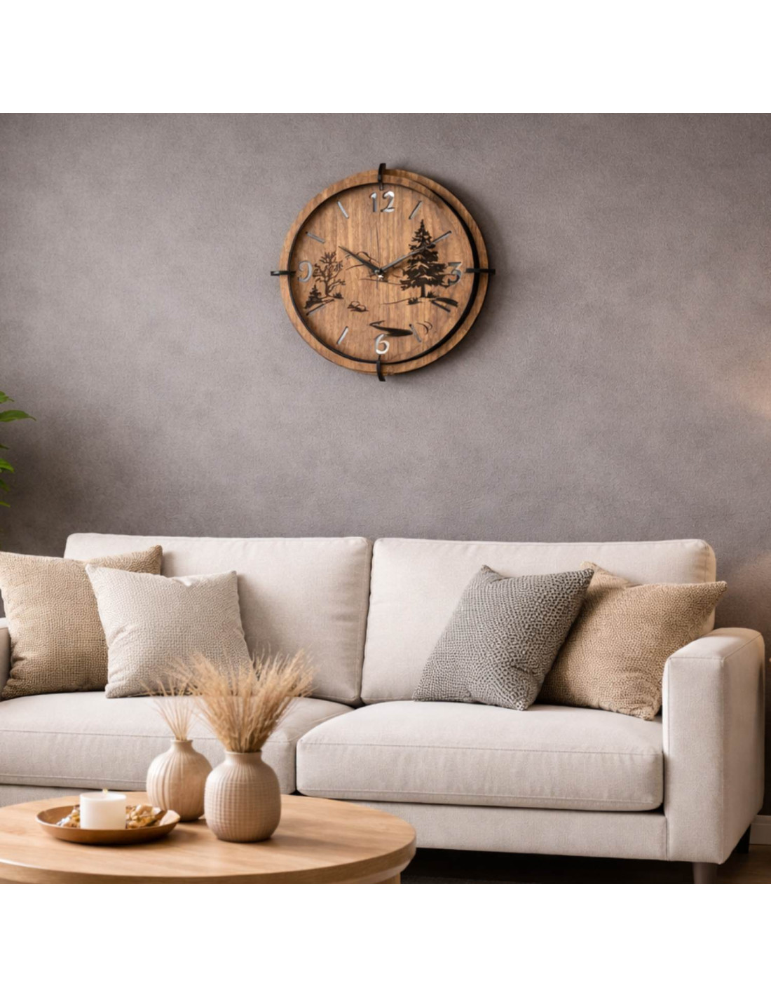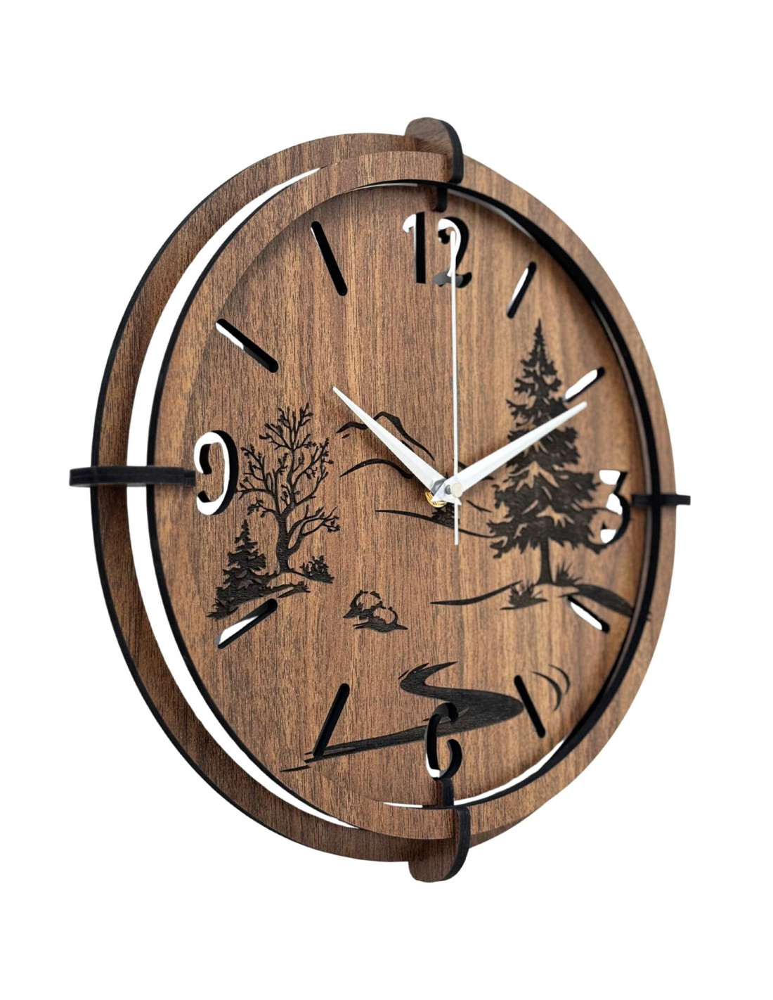 Moderné drevené nástenné hodiny s panoramatickým 3D motívom lesa a hôr vnášajú do interiéru silu prírody a pocit slobody.