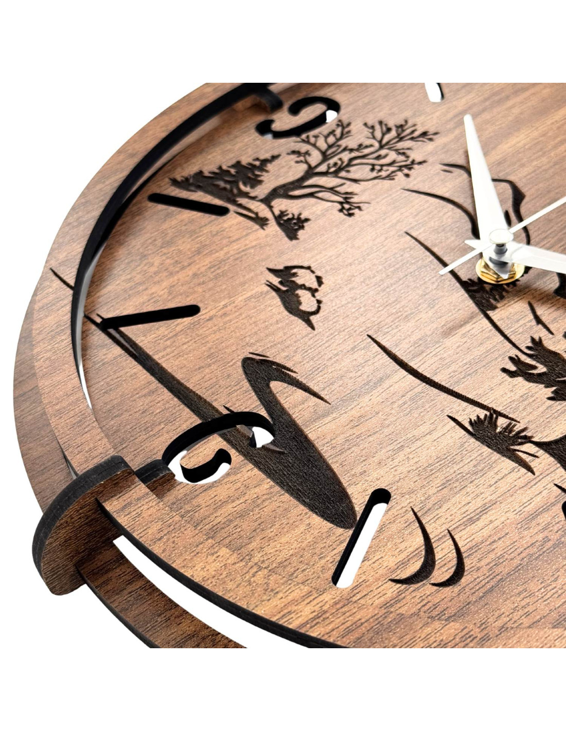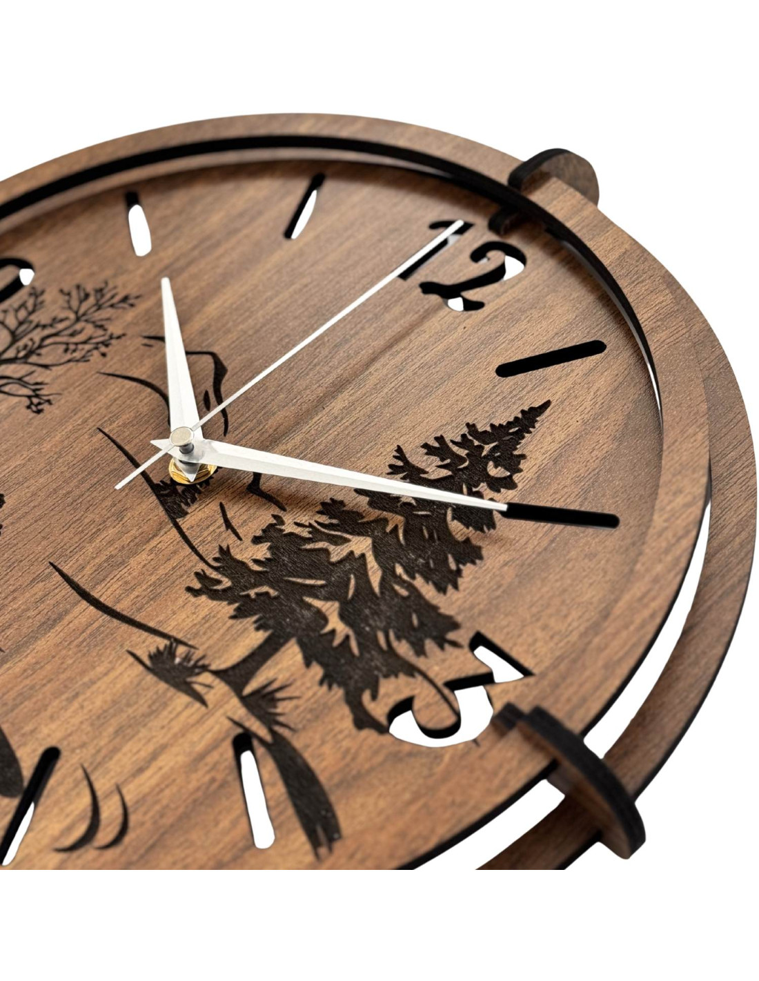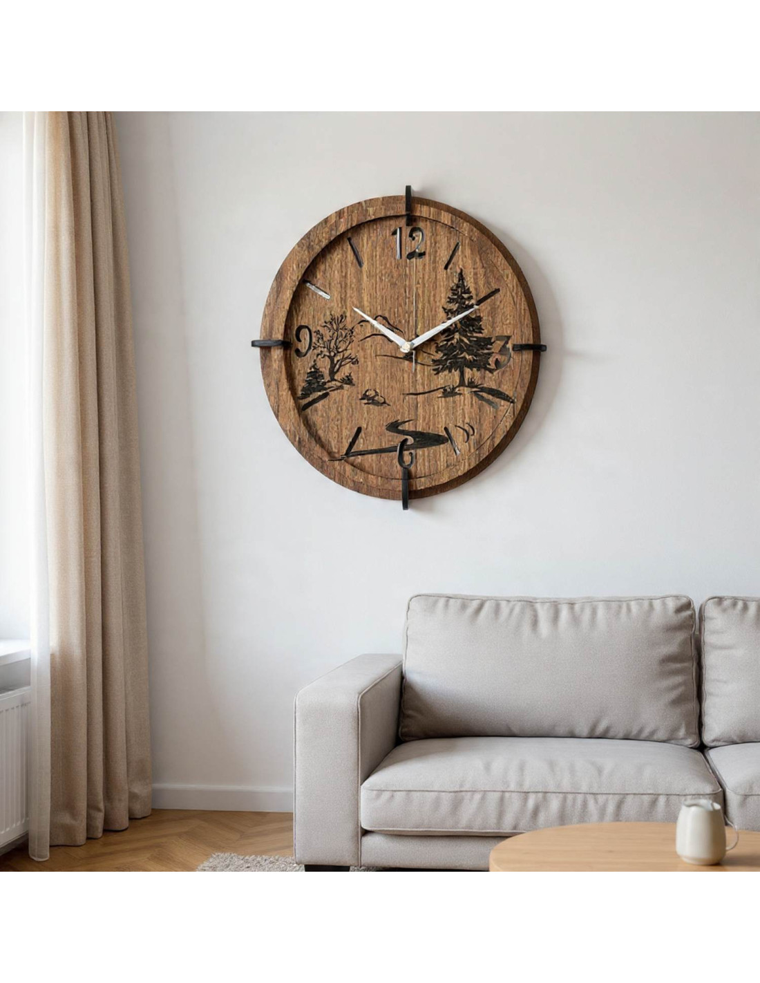 Drevené hodiny s detailným gravírovaním panorámy spájajú drsnú estetiku divokej prírody s presným meraním času a tichým mechanizmom.
