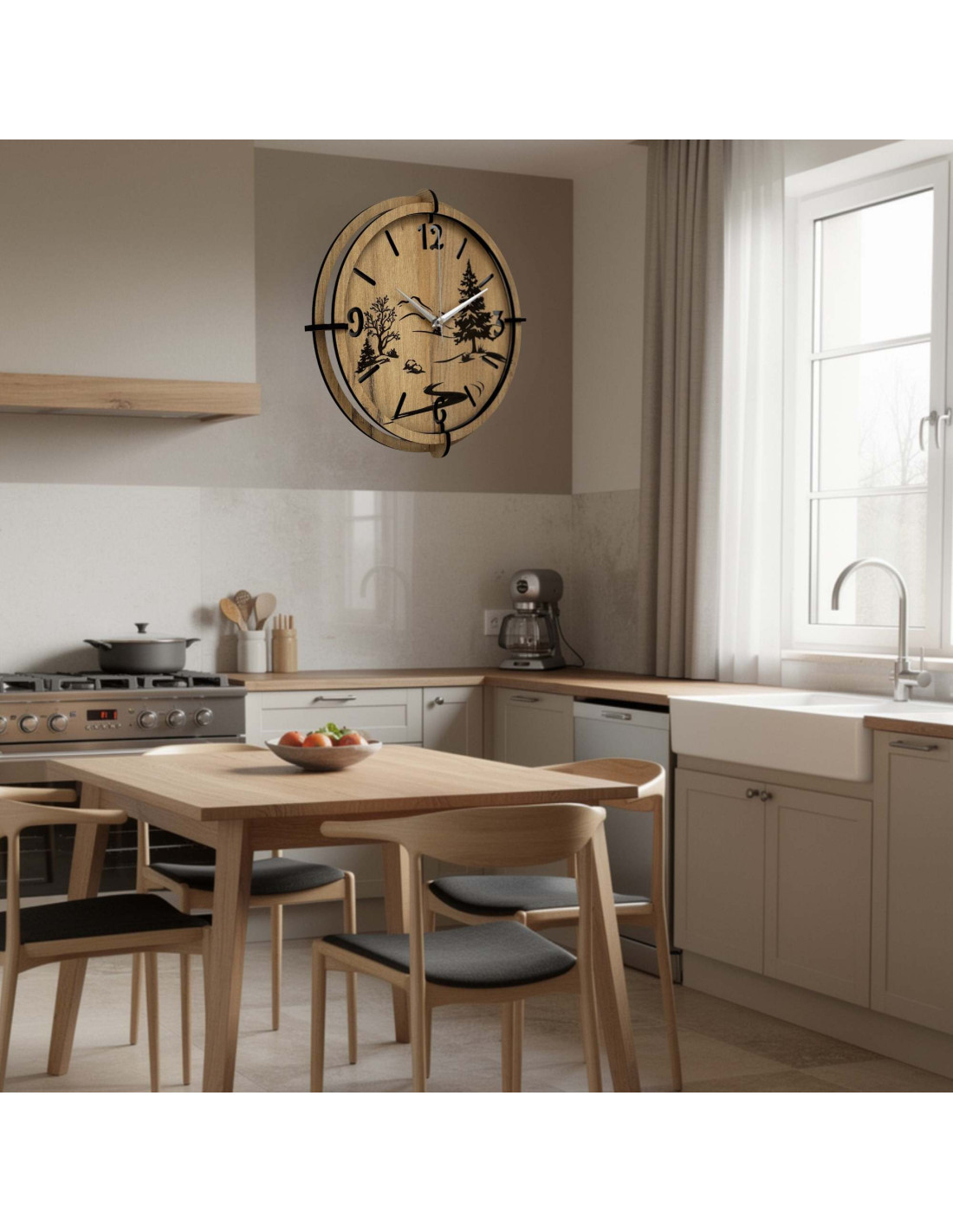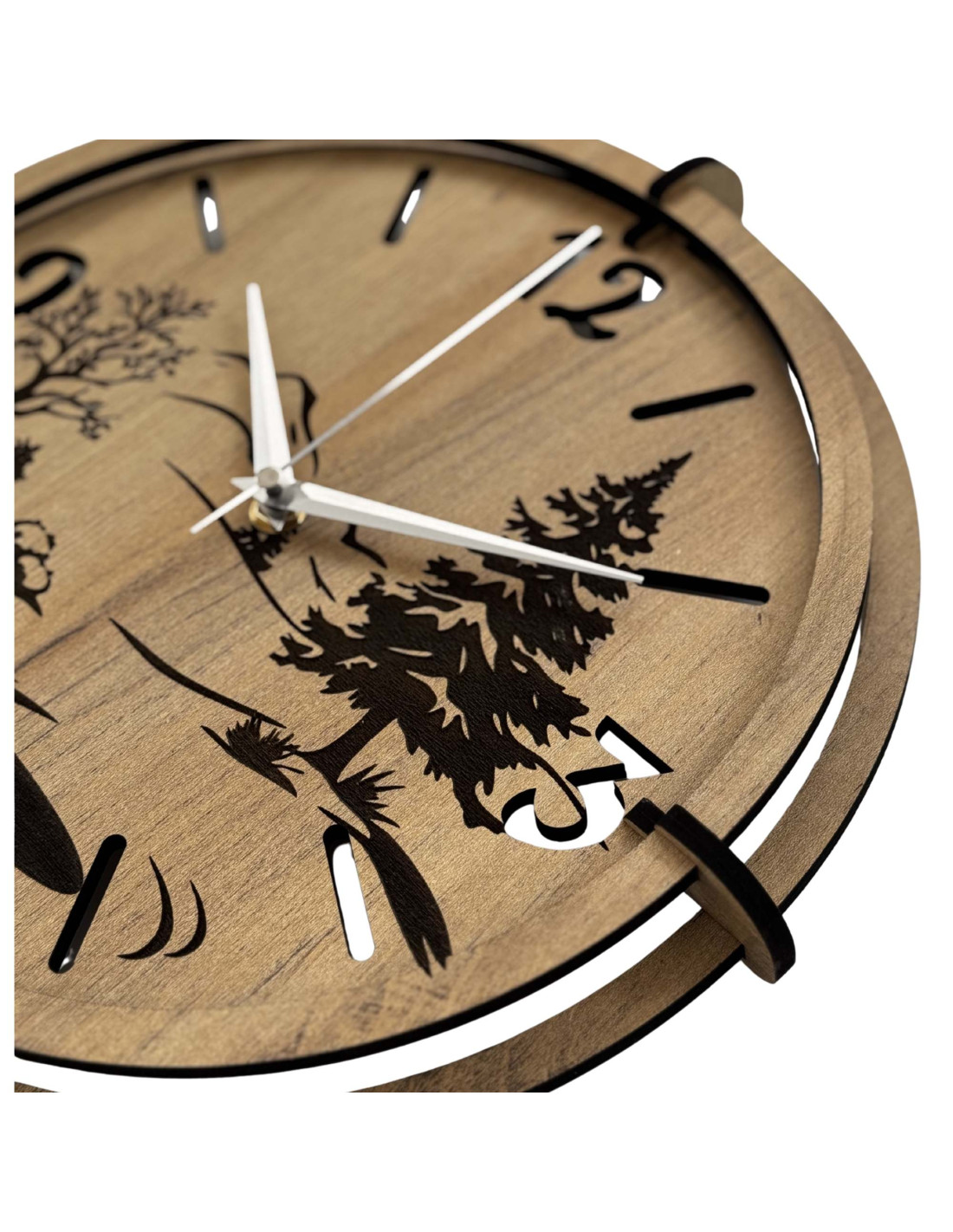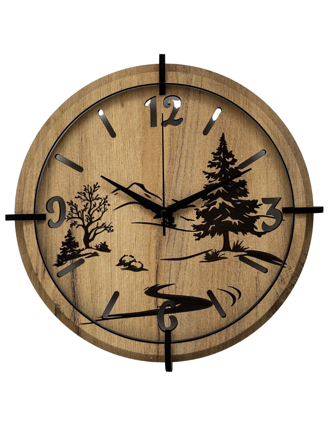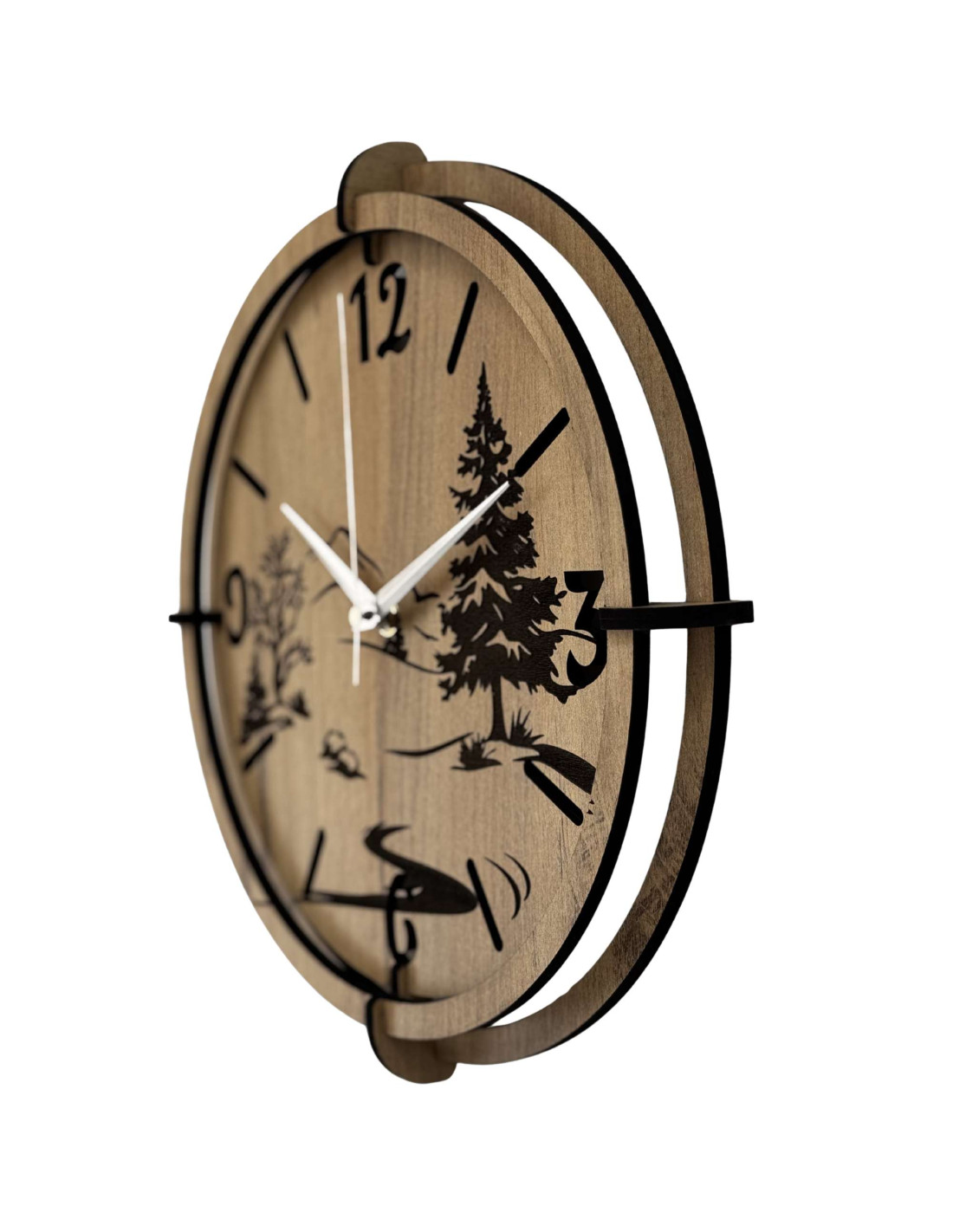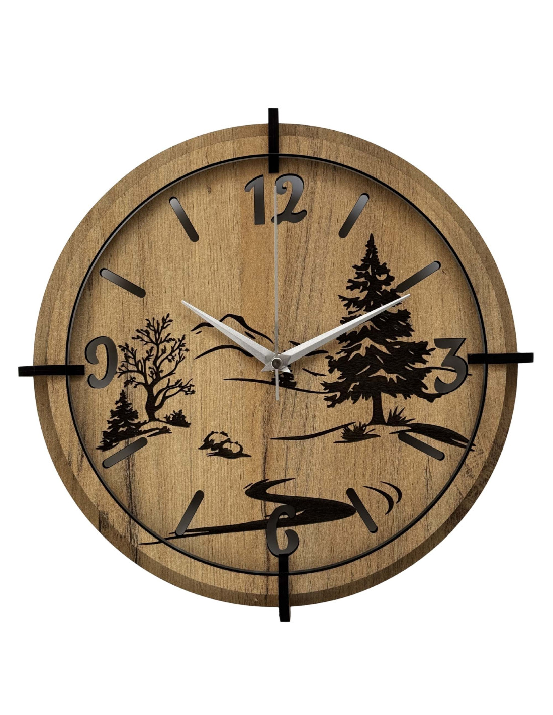 Drevené hodiny s precíznym gravírovaním krajiny spájajú autentický vzhľad prírody s moderným dizajnom, kontrastnými čiernymi prvkami a spoľahlivým tichým mechanizmom.