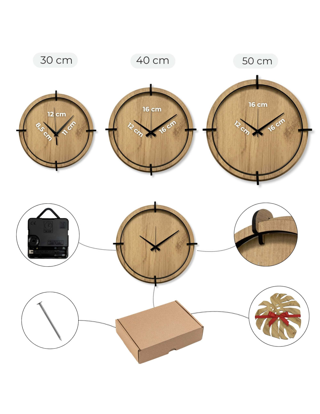 - Rozmer ručičiek pre variant 30 cm: hodinová 8,5 cm, minútová 11 cm, sekundová 12 cm