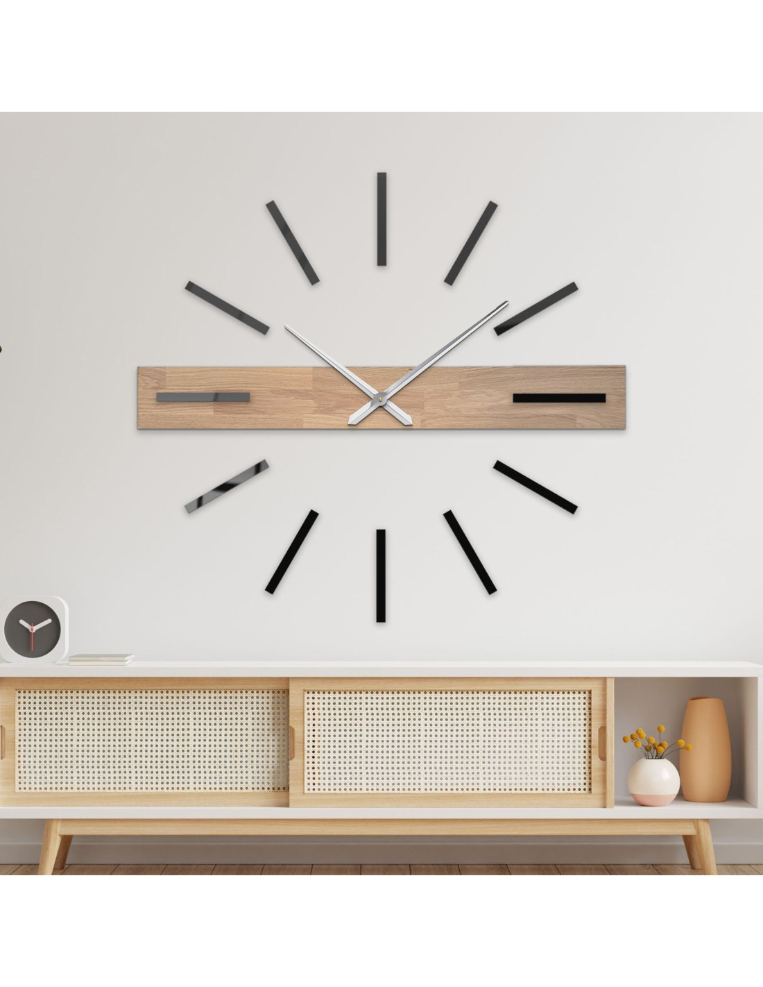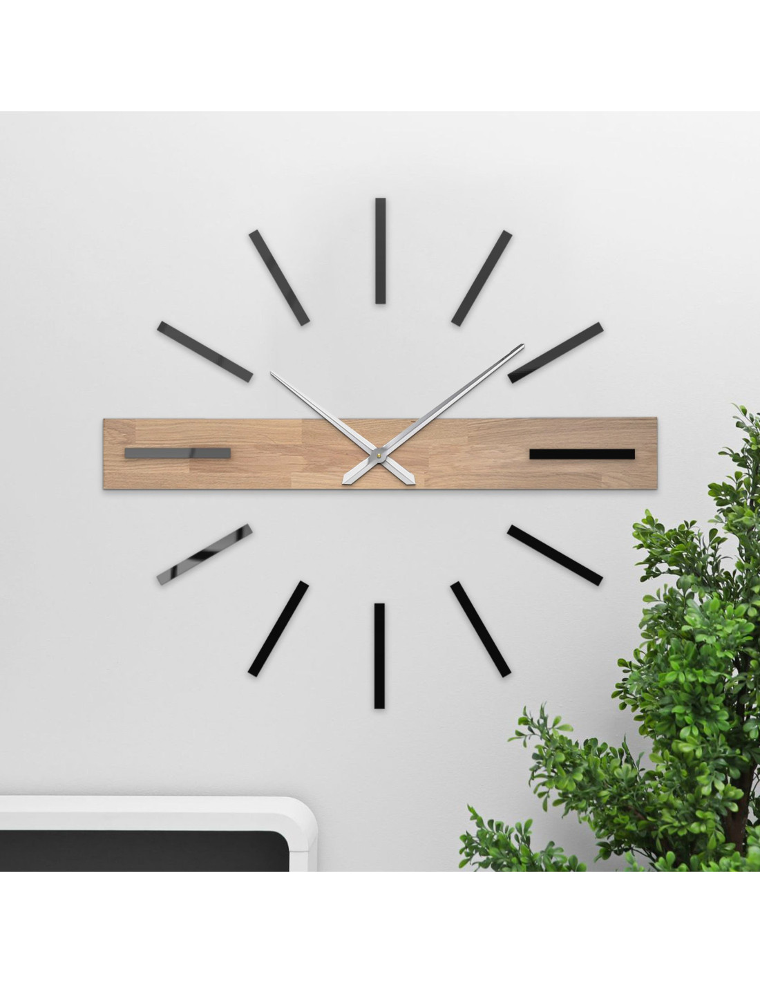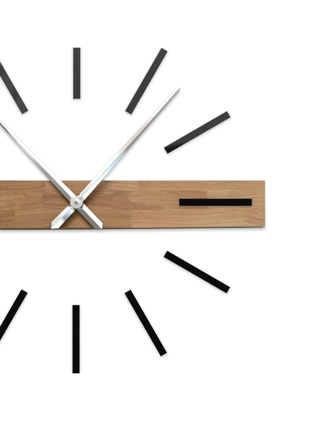 Dominantný horizontálny prvok z masívu vytvára originálny vizuálny akcent, zatiaľ čo elegantné 3D indexy a kovové ručičky dodávajú hodinám luxusný a súčasný charakter.