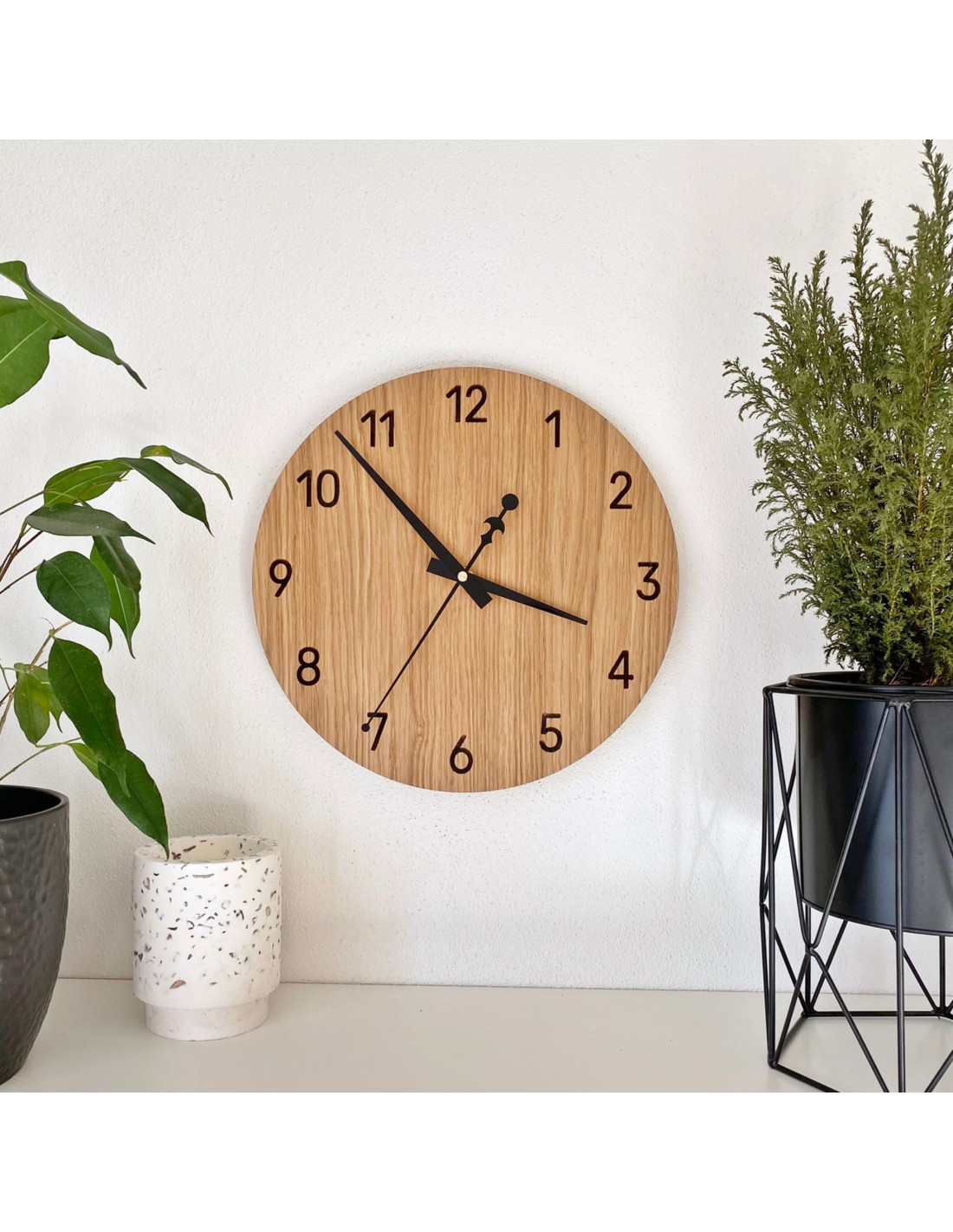 Moderné nástenné hodiny z kvalitnej dubovej preglejky sú elegantným a nadčasovým doplnkom do každého interiéru.