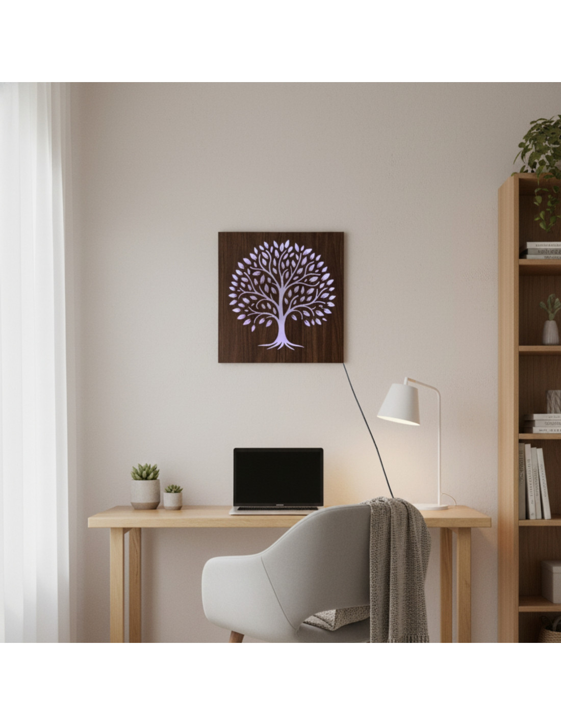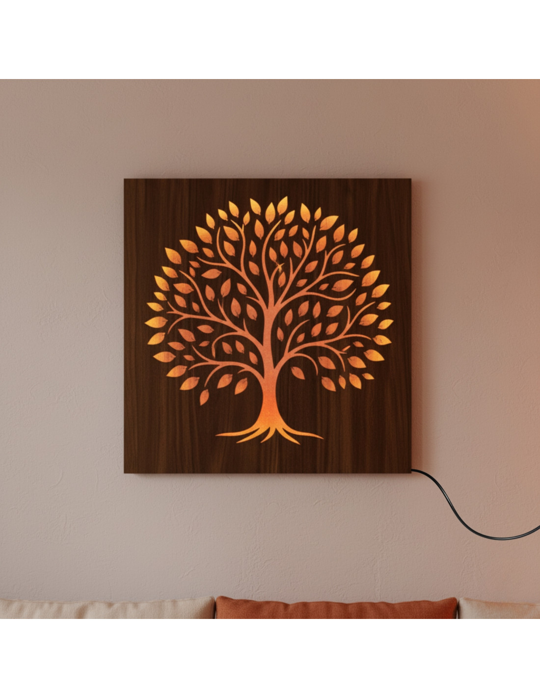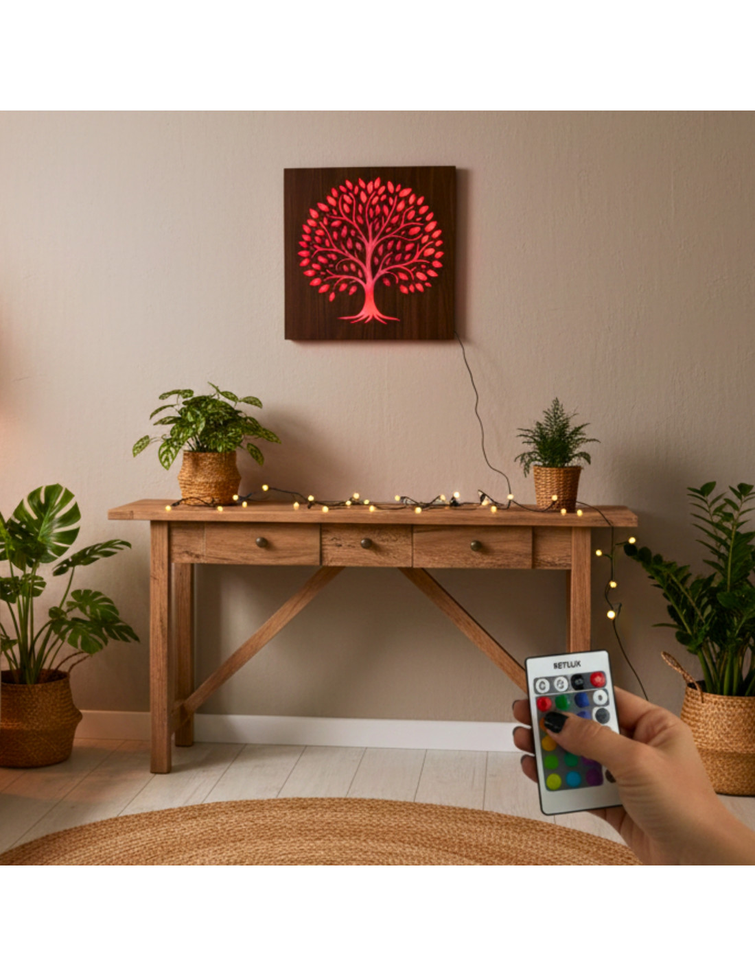 Tento drevený LED svetelný obraz spája prírodný dizajn s modernou technológiou a vytvára pôsobivý svetelný efekt, ktorý upúta pozornosť a zútulní každý interiér.