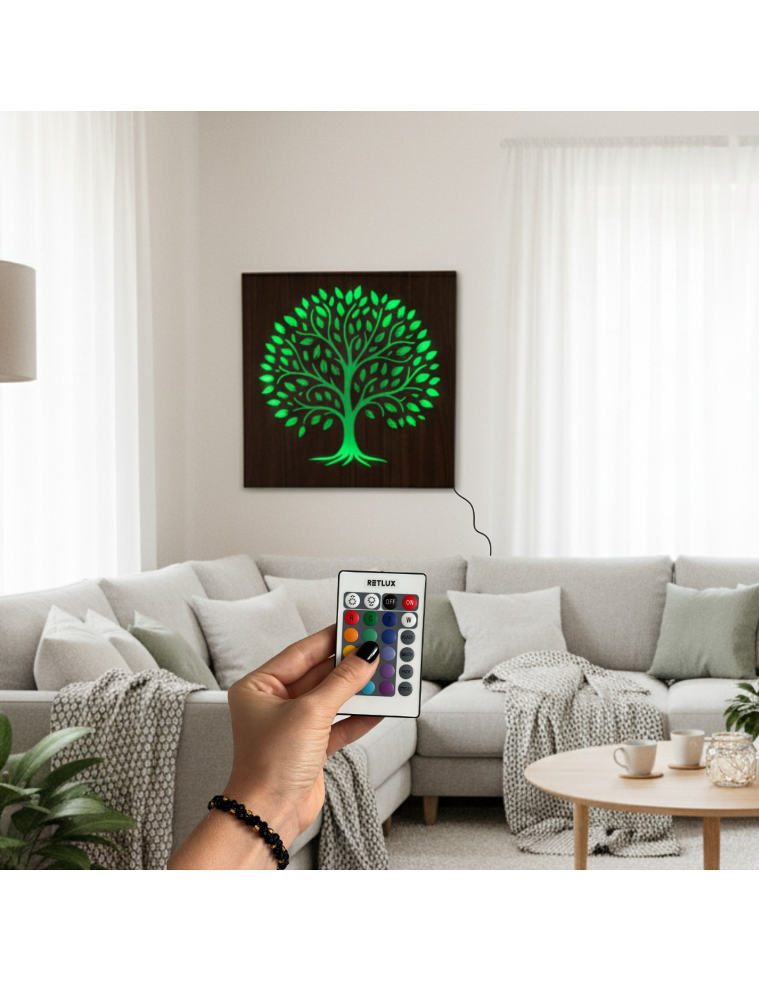 LED svetelný obraz strom života – drevená dekorácia s RGB LED podsvietením, nastaviteľné farby a jas, interiérové dekoratívne svetlo do obývačky, spálne a kancelárie.