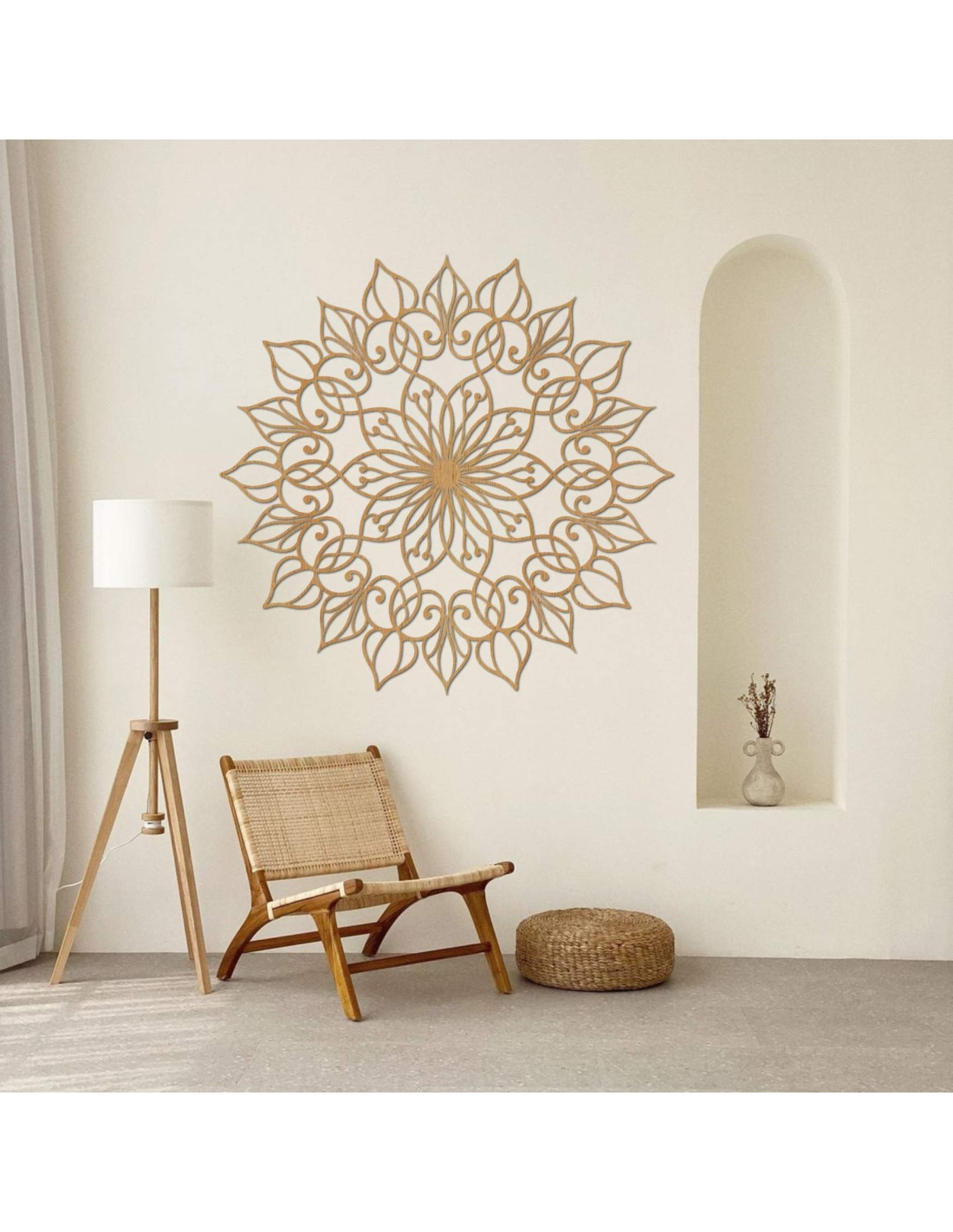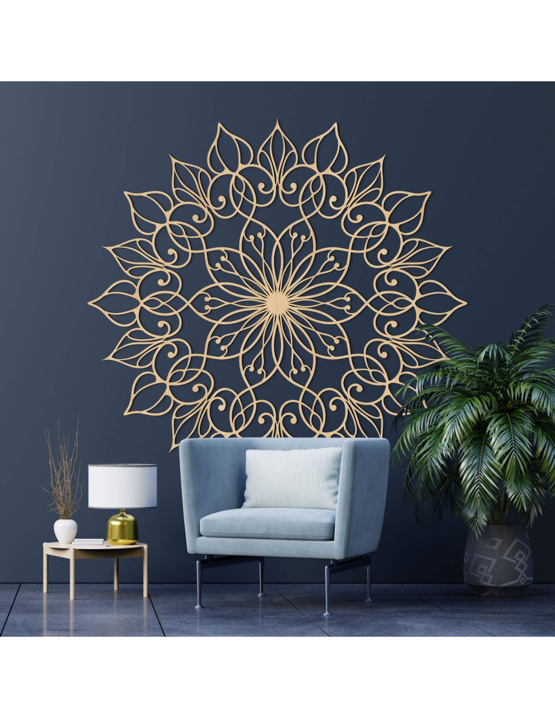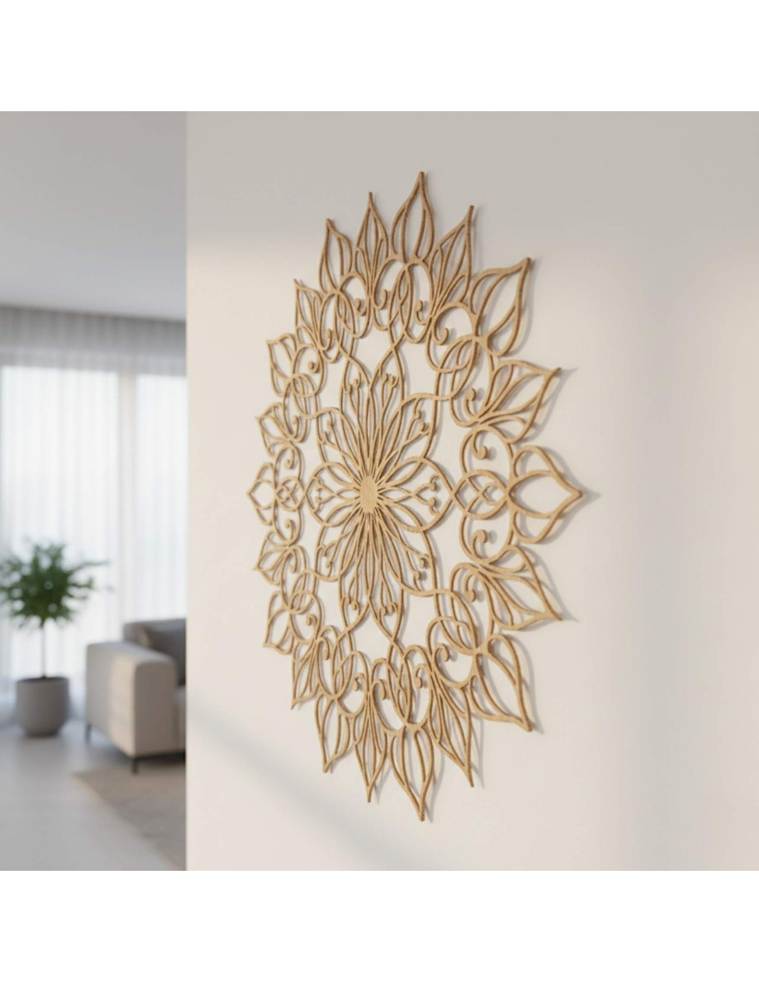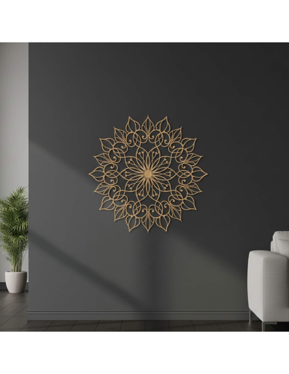 Táto jedinečná nástenná dekorácia zobrazuje mandalu Kvetu života s precízne vyrezávaným detailným vzorom. Zlatý odtieň dodáva priestoru luxusný, teplý a harmonický vzhľad, vďaka čomu sa stáva výrazným dizajnovým prvkom každého interiéru.