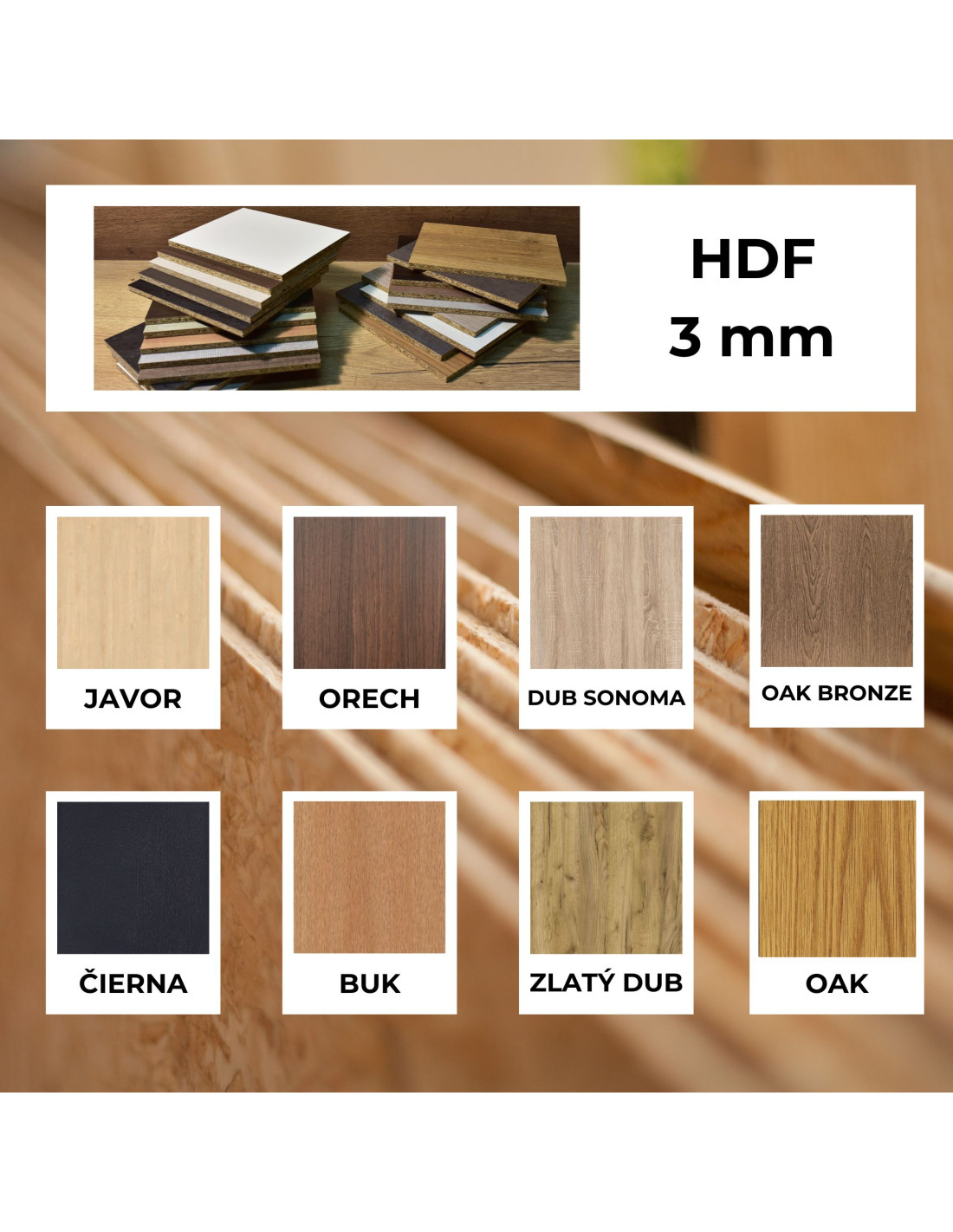 - HDF (Drevovláknitá doska s vysokou hustotou)