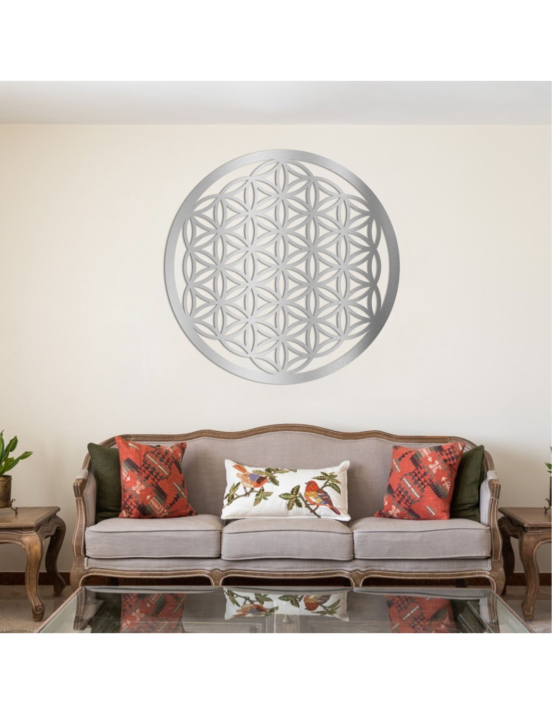 Vďaka svojmu jedinečnému vzoru tvorenému vzájomne prepojenými kruhmi vytvára pôsobivý obraz, ktorý podporuje vnútorný pokoj, pozitívnu energiu a rovnováhu vo vašom priestore.