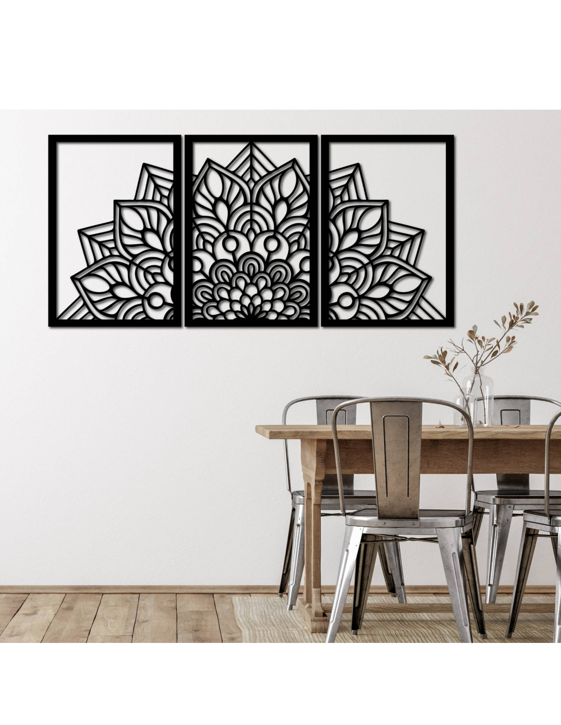 Či už ide o umelecké nástenné hodiny v tvare kvetu života mandalu s hravými siluetami vtákov, alebo o majestátnu trojdielnu mandalu, tieto prvky vďaka precíznemu vyrezávaniu vizuálne otvárajú a zväčšujú priestor.