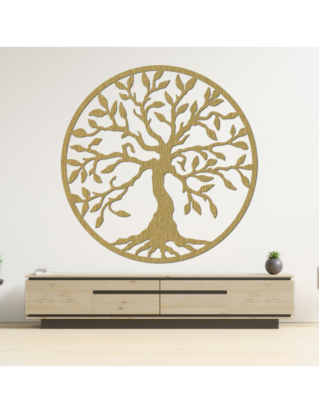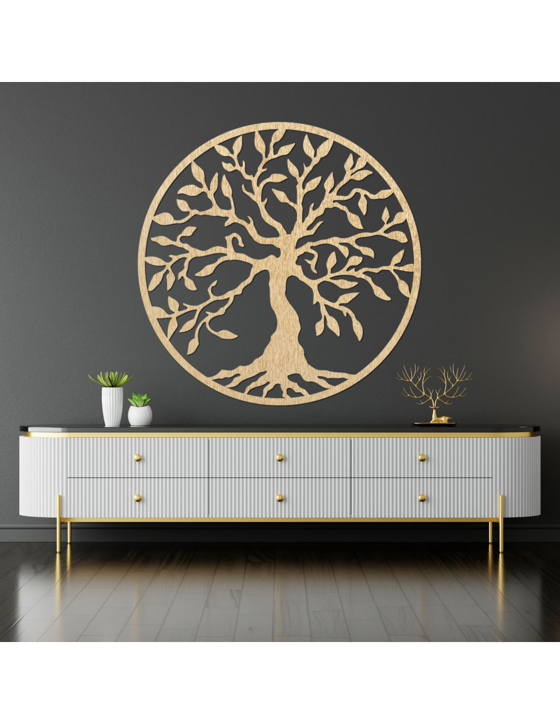 Tento krásny kruhový výrez z prírodného dreva zachytáva strom s rozvetvenými konármi a lístím, čo symbolizuje život, rast a prepojenosť.