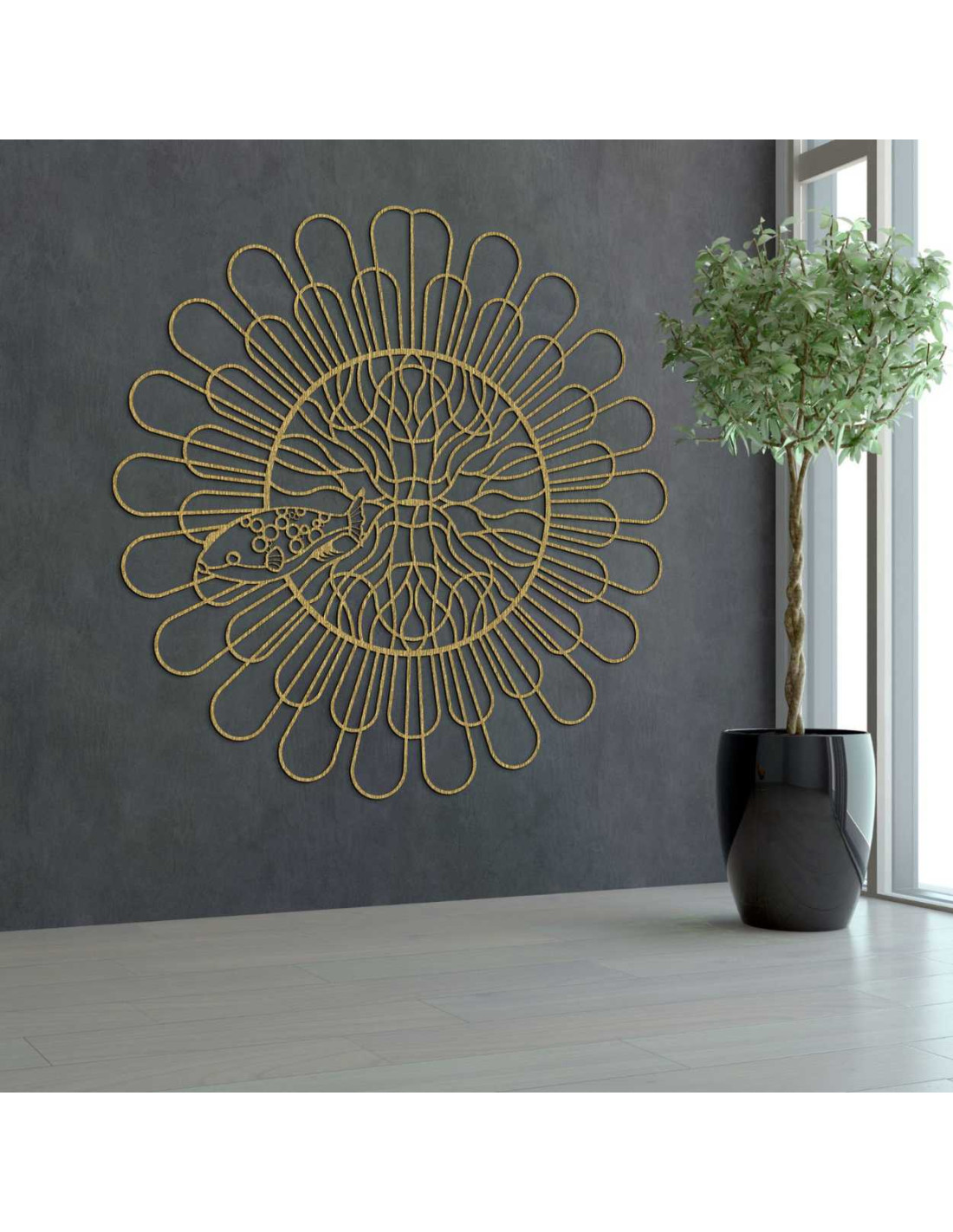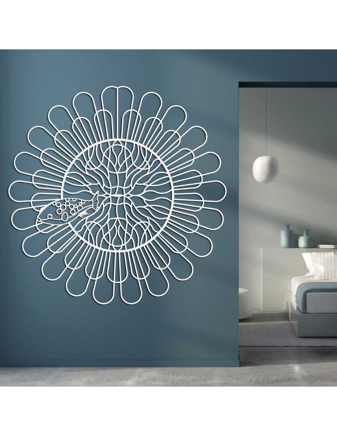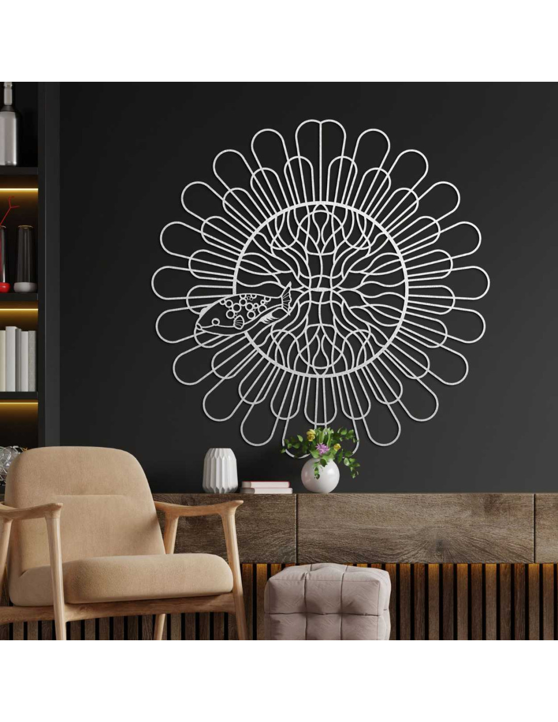 Rovnomerne rozložené línie vytvárajú ilúziu pohybu a štruktúry. Do centrálneho priestoru je zakomponovaný jemne vyrezaný motív ryby s kontrastnými detailmi. Organický tvar narúša technickú presnosť kruhu a tým vytvára kontrast. Celý dizajn pôsobí ako vizuálne vyjadrenie rovnováhy medzi poriadkom a náhodou.
