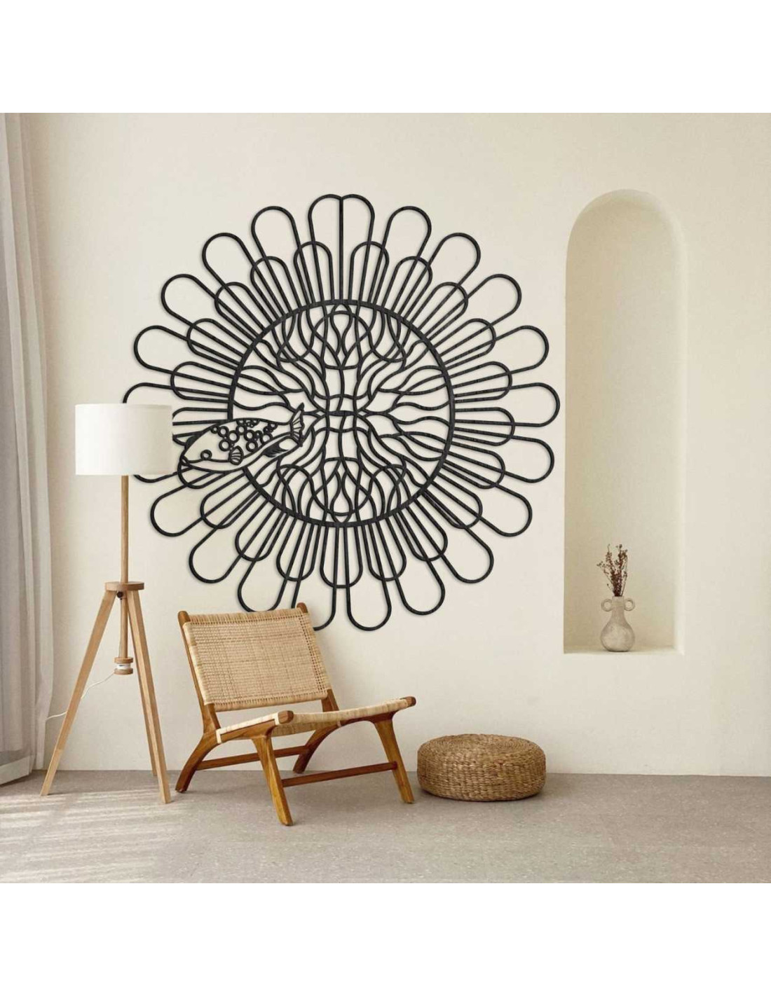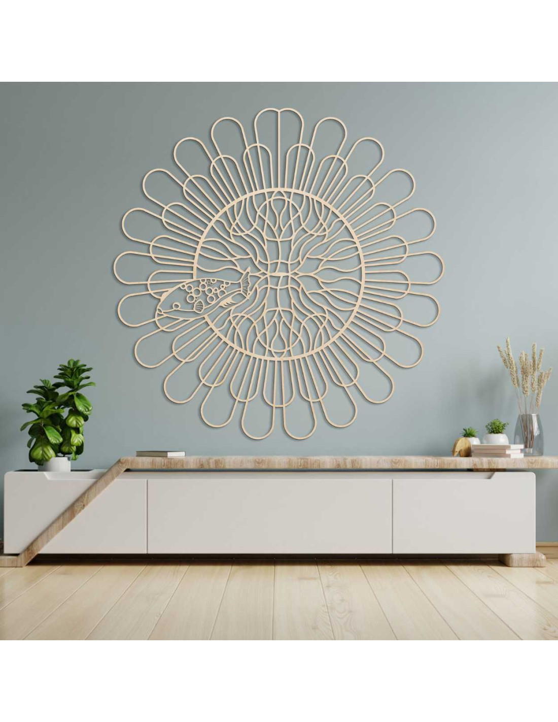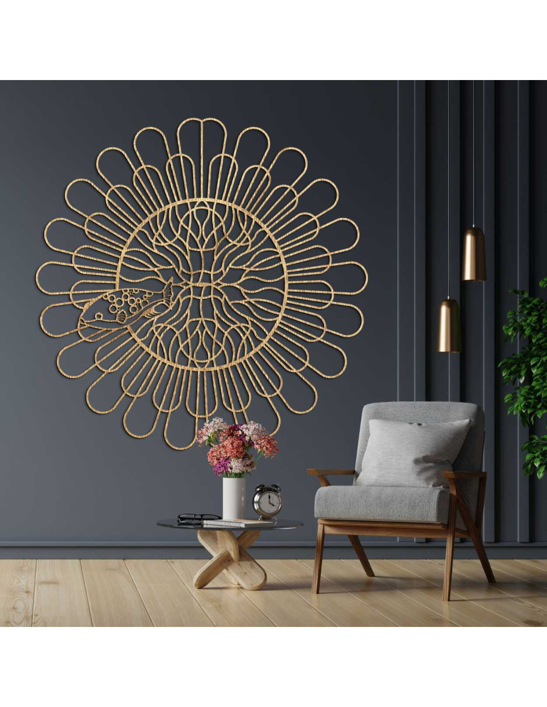 Rovnomerne rozložené línie vytvárajú ilúziu pohybu a štruktúry. Do centrálneho priestoru je zakomponovaný jemne vyrezaný motív ryby s kontrastnými detailmi. Organický tvar narúša technickú presnosť kruhu a tým vytvára kontrast. Celý dizajn pôsobí ako vizuálne vyjadrenie rovnováhy medzi poriadkom a náhodou.