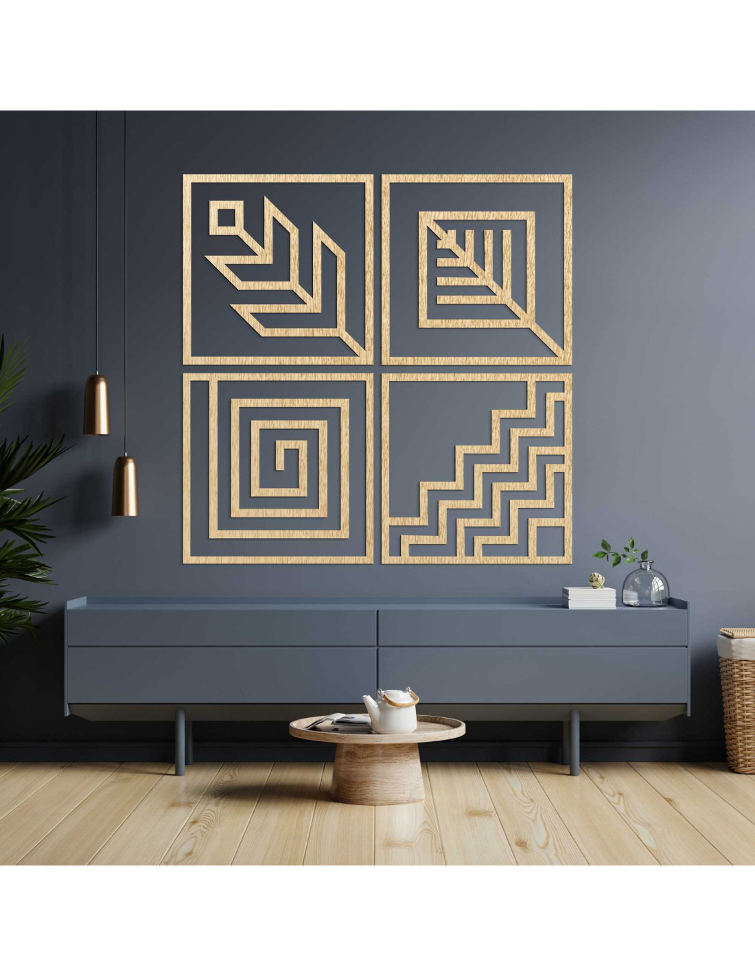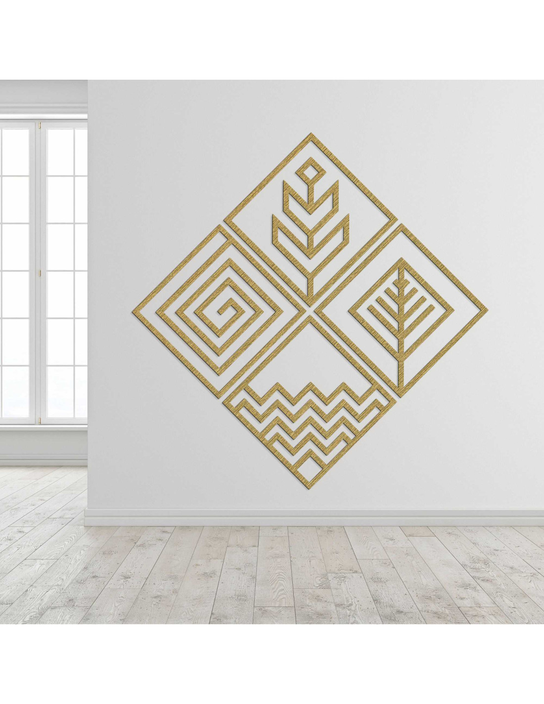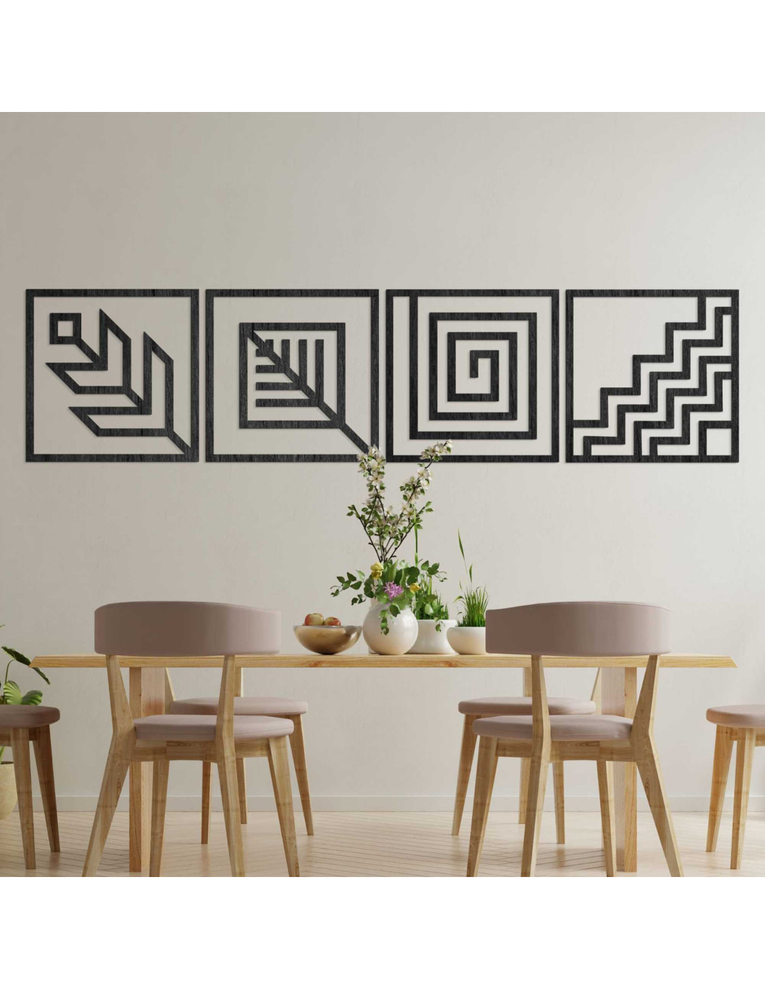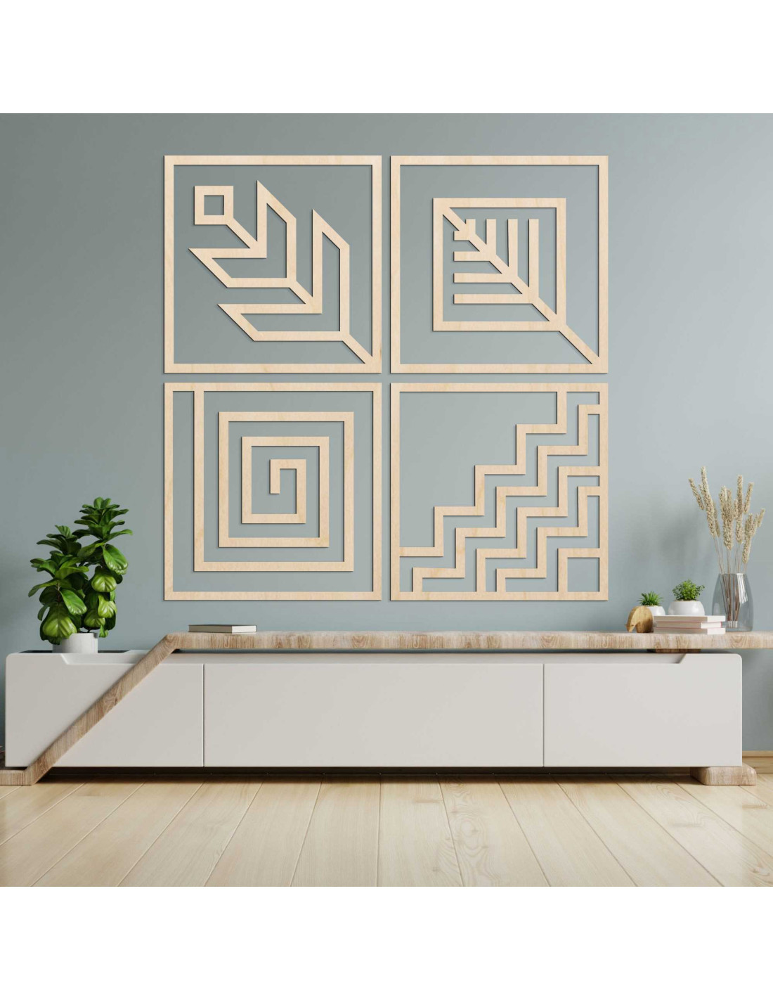 Drevené línie vytvárajú štyri abstraktné motívy, pričom každý z nich nesie charakteristickú štruktúru. Dva z nich čerpajú inšpiráciu z prírodných tvarov pripomínajúcich listy, ďalšie dva sa sústredia na geometriu. Povrch pôsobí organicky vďaka jemnej kresbe dreva, ktorá podčiarkuje prirodzený charakter materiálu. Zostava pôsobí čistým dojmom a prináša do priestoru jasné línie a poriadok.