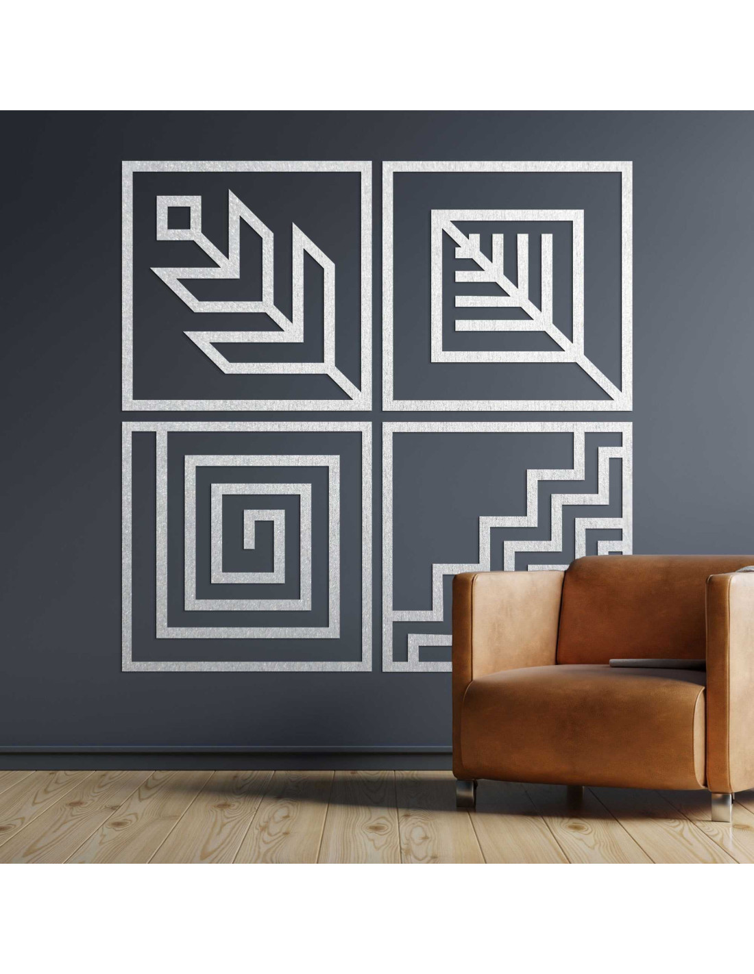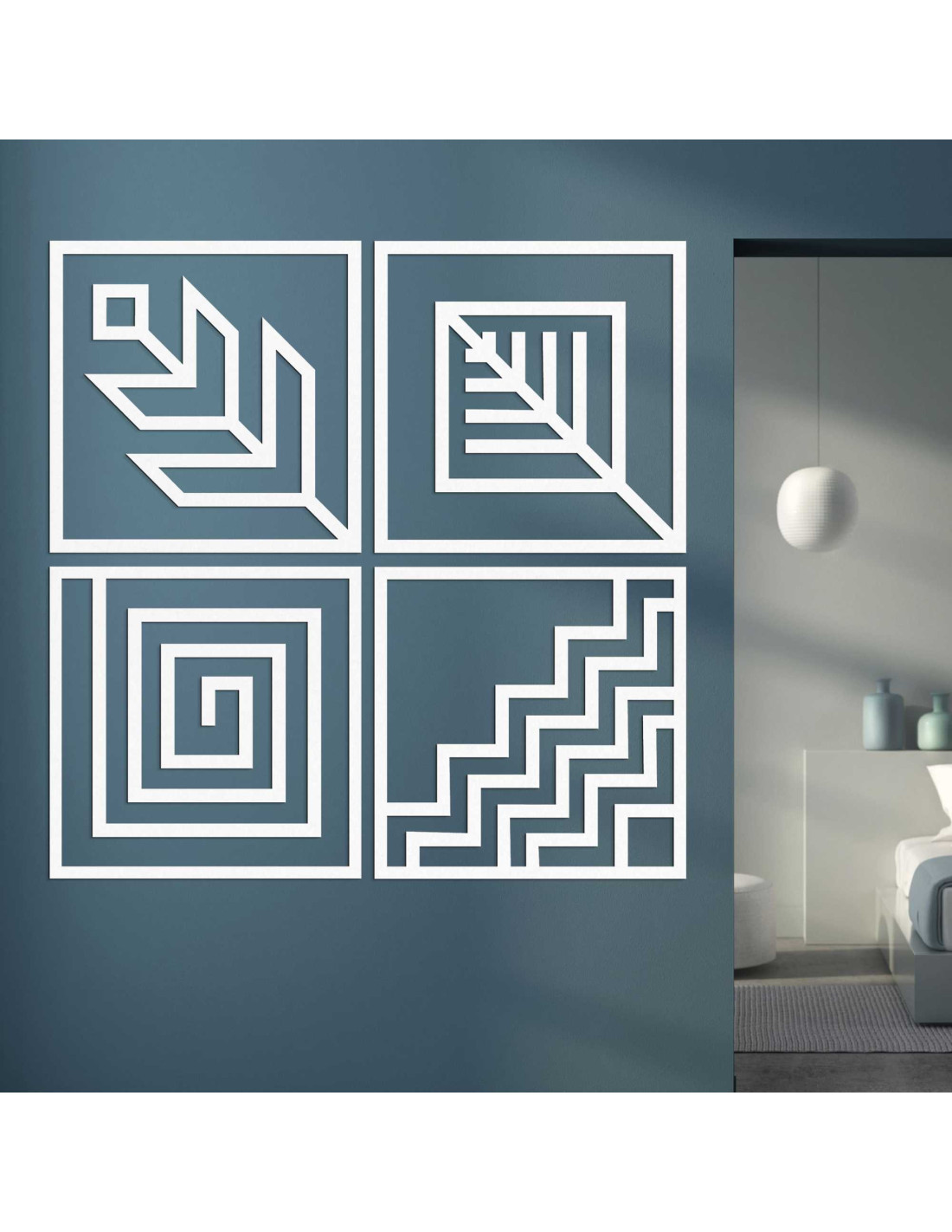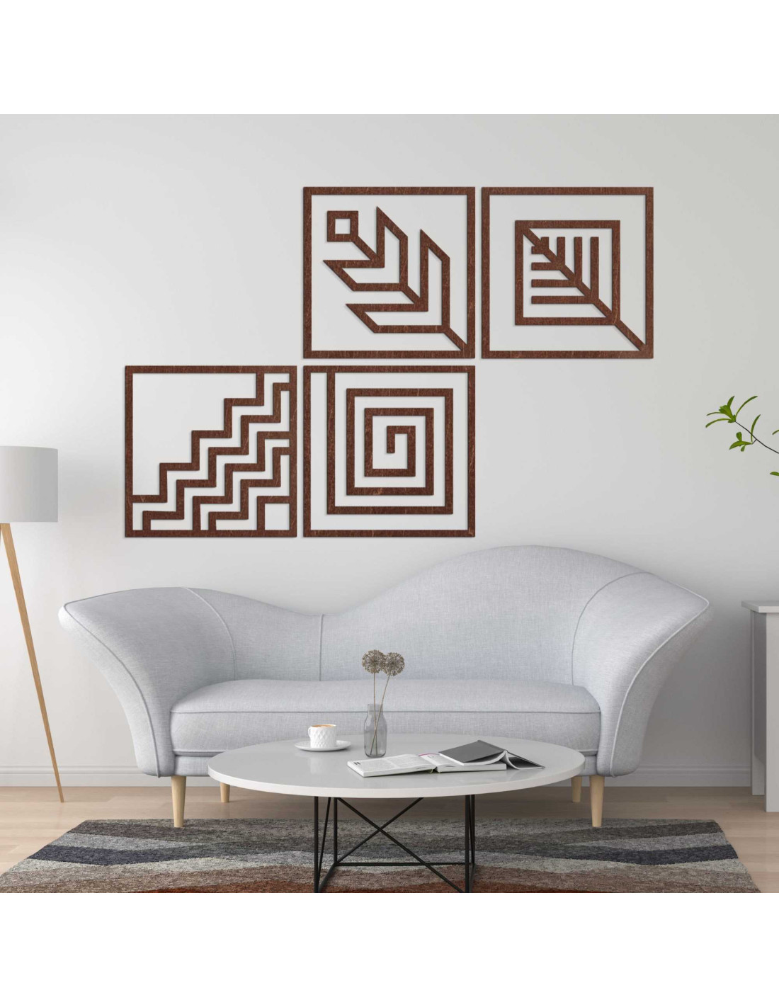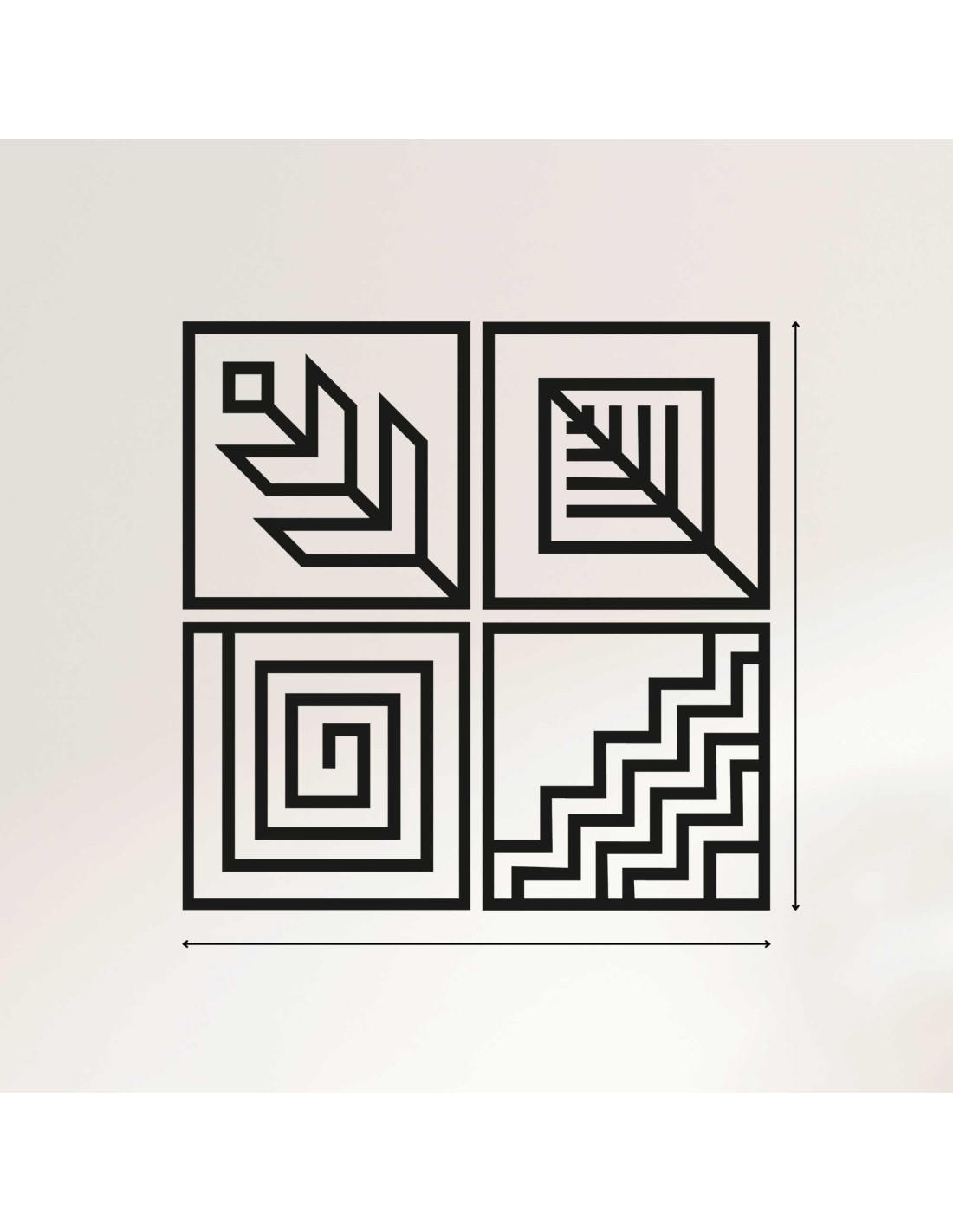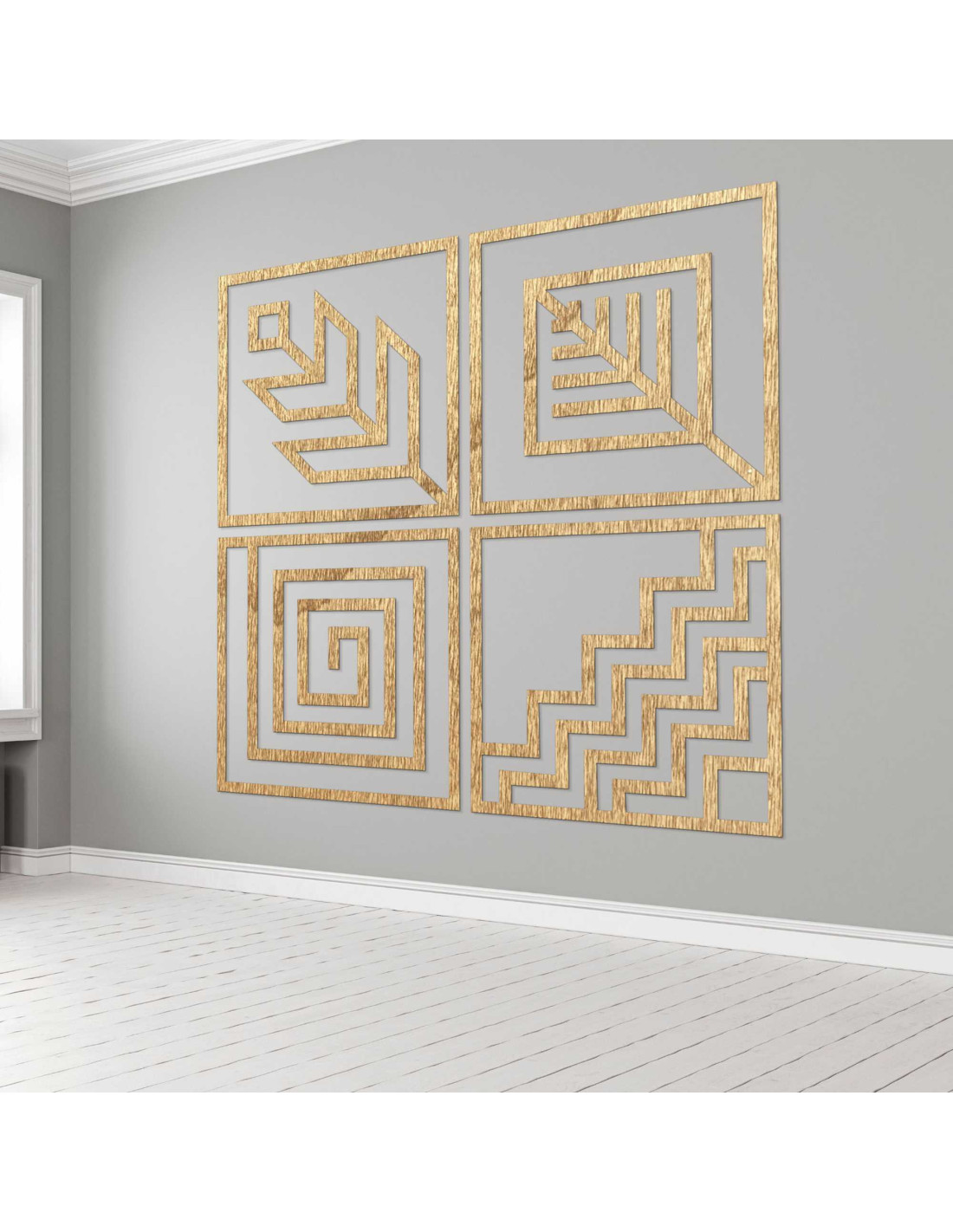 Drevené línie vytvárajú štyri abstraktné motívy, pričom každý z nich nesie charakteristickú štruktúru. Dva z nich čerpajú inšpiráciu z prírodných tvarov pripomínajúcich listy, ďalšie dva sa sústredia na geometriu. Povrch pôsobí organicky vďaka jemnej kresbe dreva, ktorá podčiarkuje prirodzený charakter materiálu. Zostava pôsobí čistým dojmom a prináša do priestoru jasné línie a poriadok.