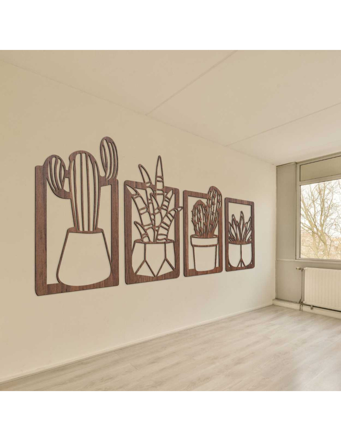 Moderná drevená dekorácia na stenu s rastlinným motívom kaktusov predstavuje štýlové spracovanie a jemný dizajn.